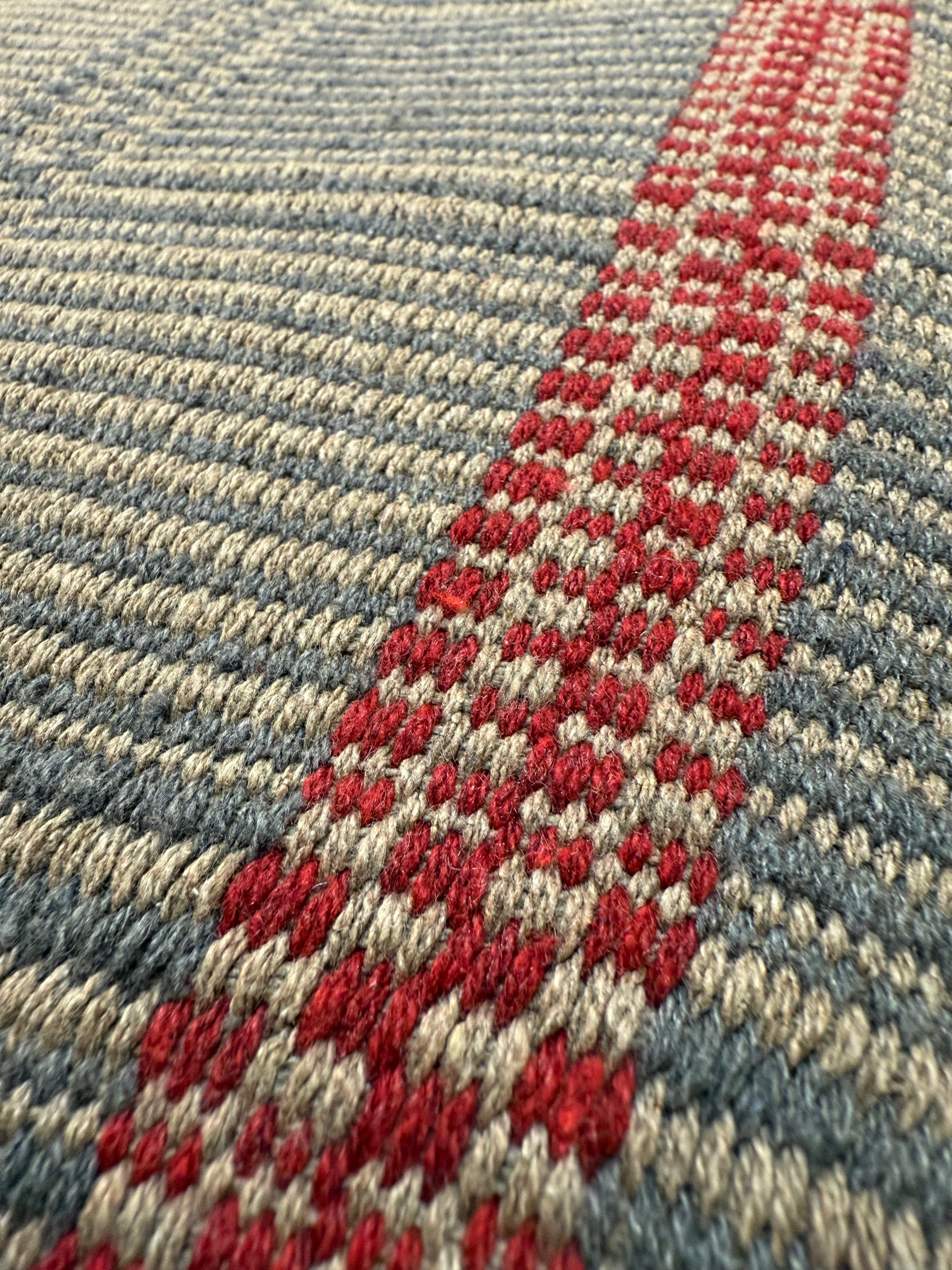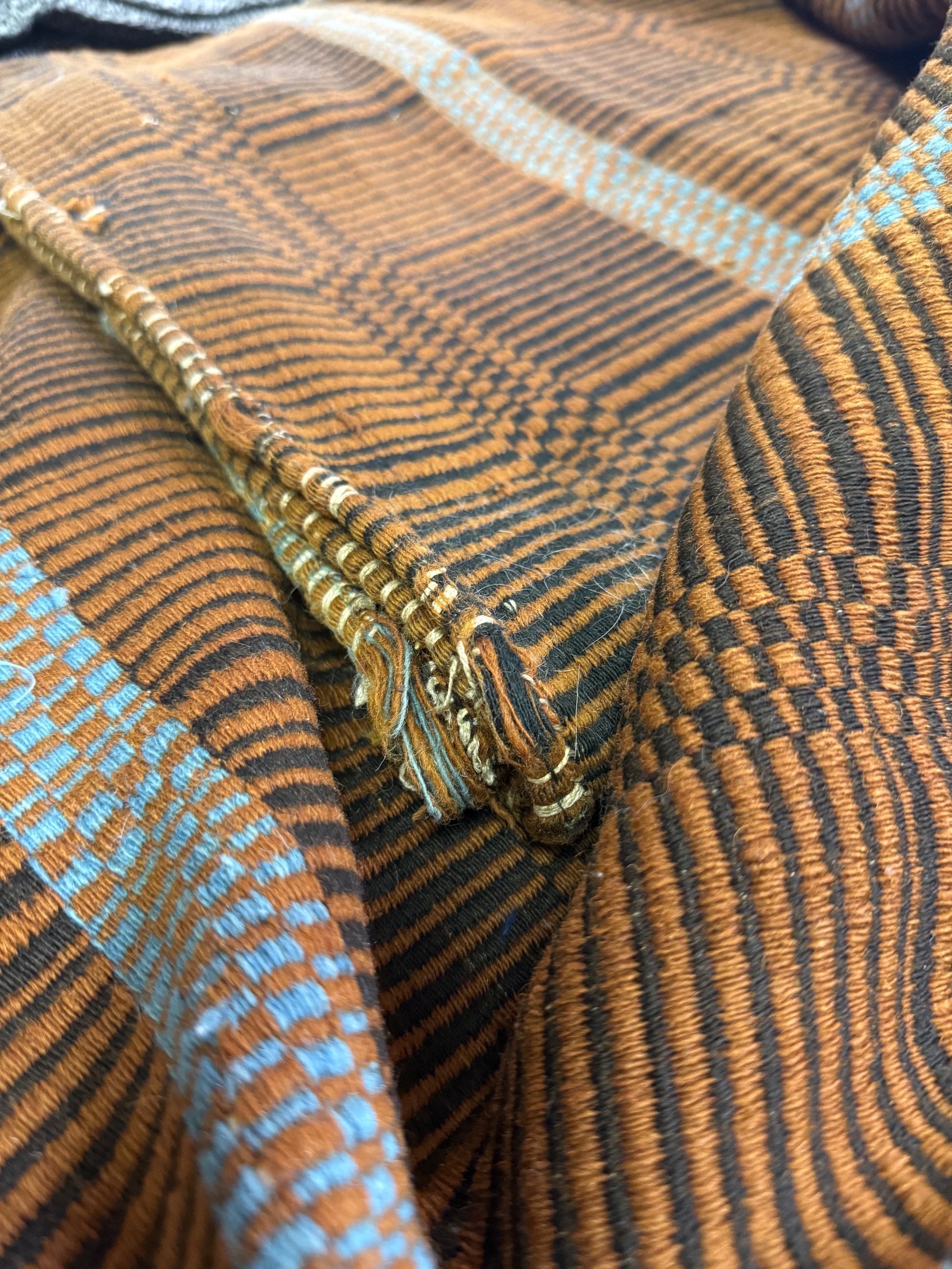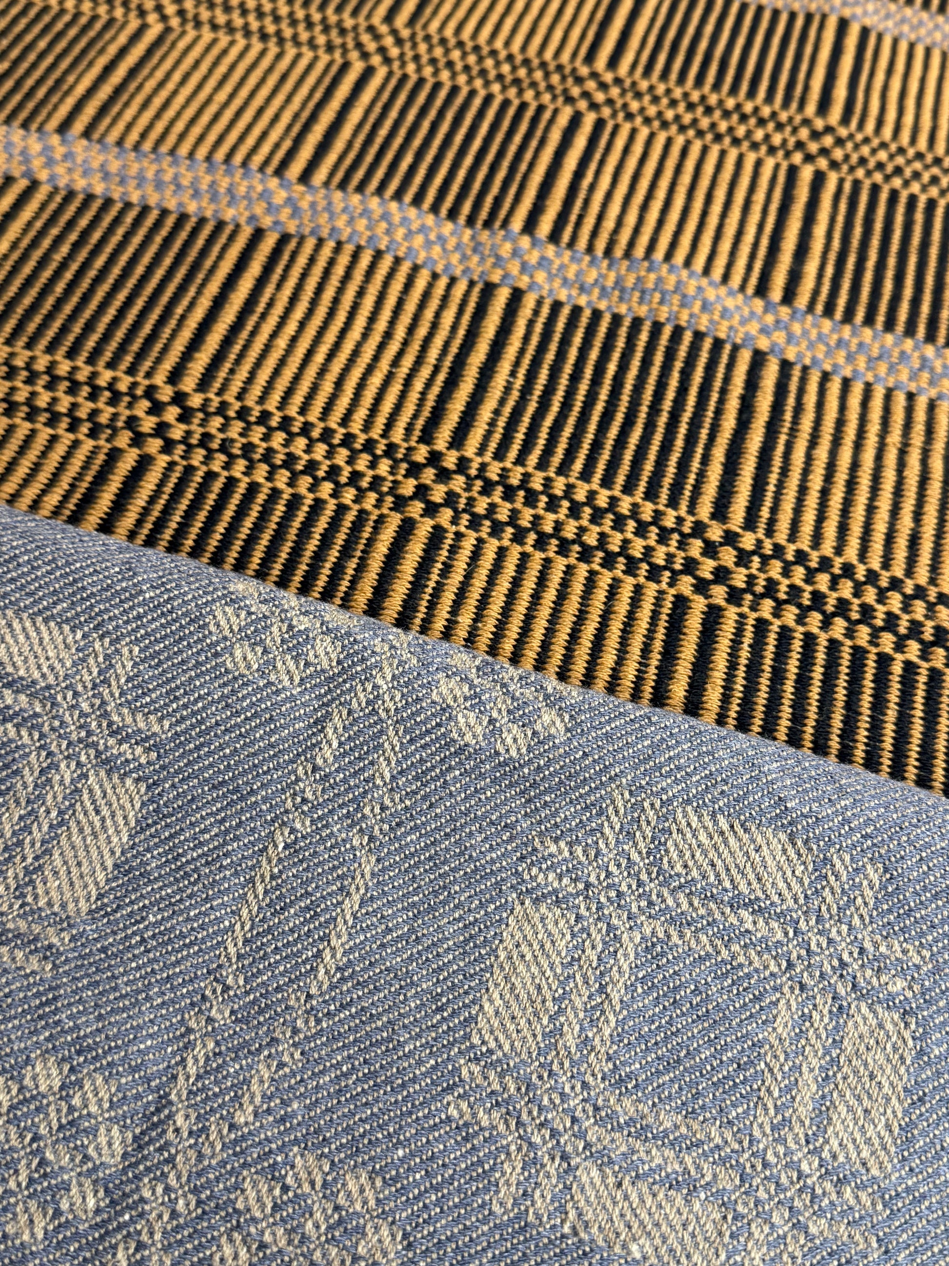 What a beautiful Queen Coverlet. Perfect for decorating your primitive bedroom. The "made in PA" Coverlet is new from Family Heirloom Weavers in the reproduction Log Cabin pattern. This pattern dates back to the 18th Century and has a vibrant design with the Denim accent to create light within a room. Also shown with an original 1700’s Coverlet and also on the Loom. Measures 90” x 98”, Cotton