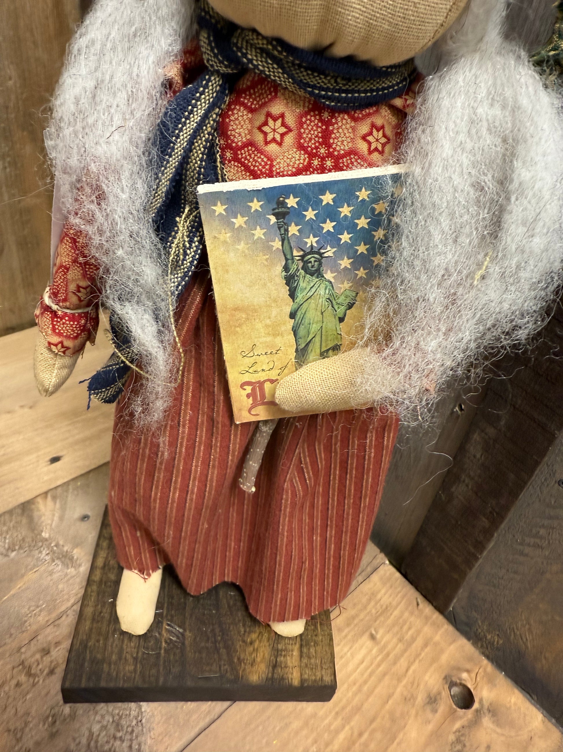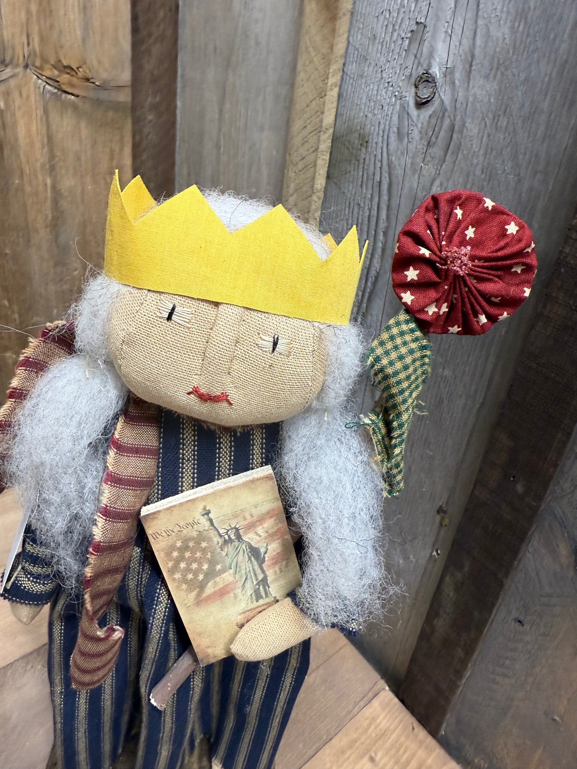 Handcrafted and "sew" lovely! Miss Liberty comes in a few different colors/patterns; all perfectly primitive. She stands on a stained 5.5" x 4" wooden base and is about 15" tall to the point of her crown. Each face is needle sculpted and full of detail. She holds a plaque in her arm and a "make do" flower.