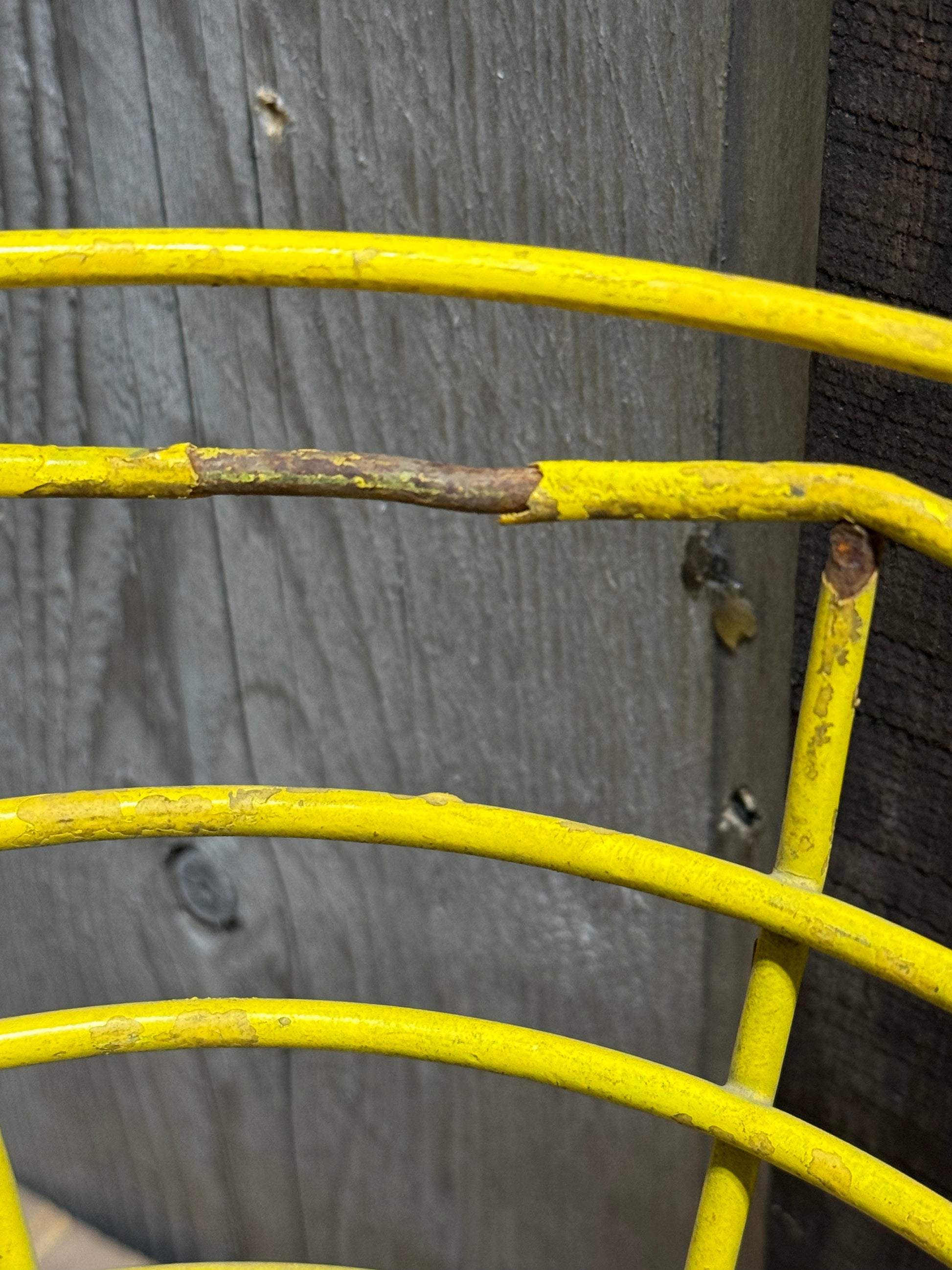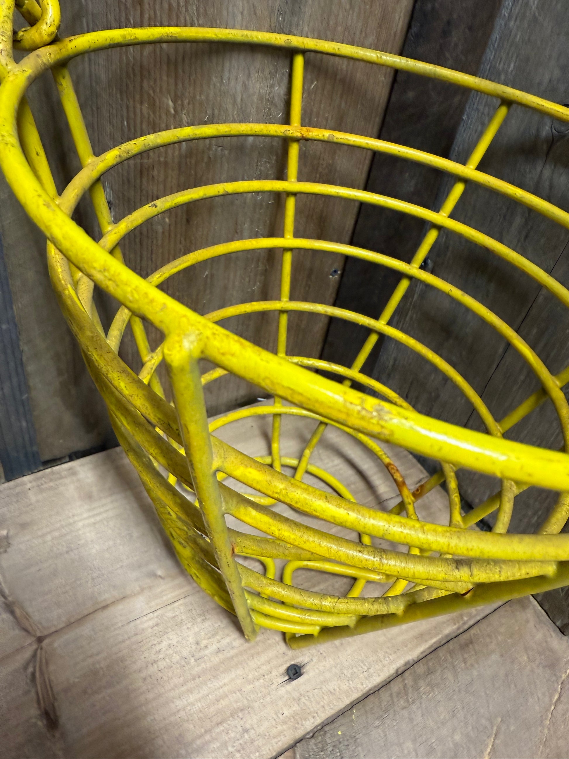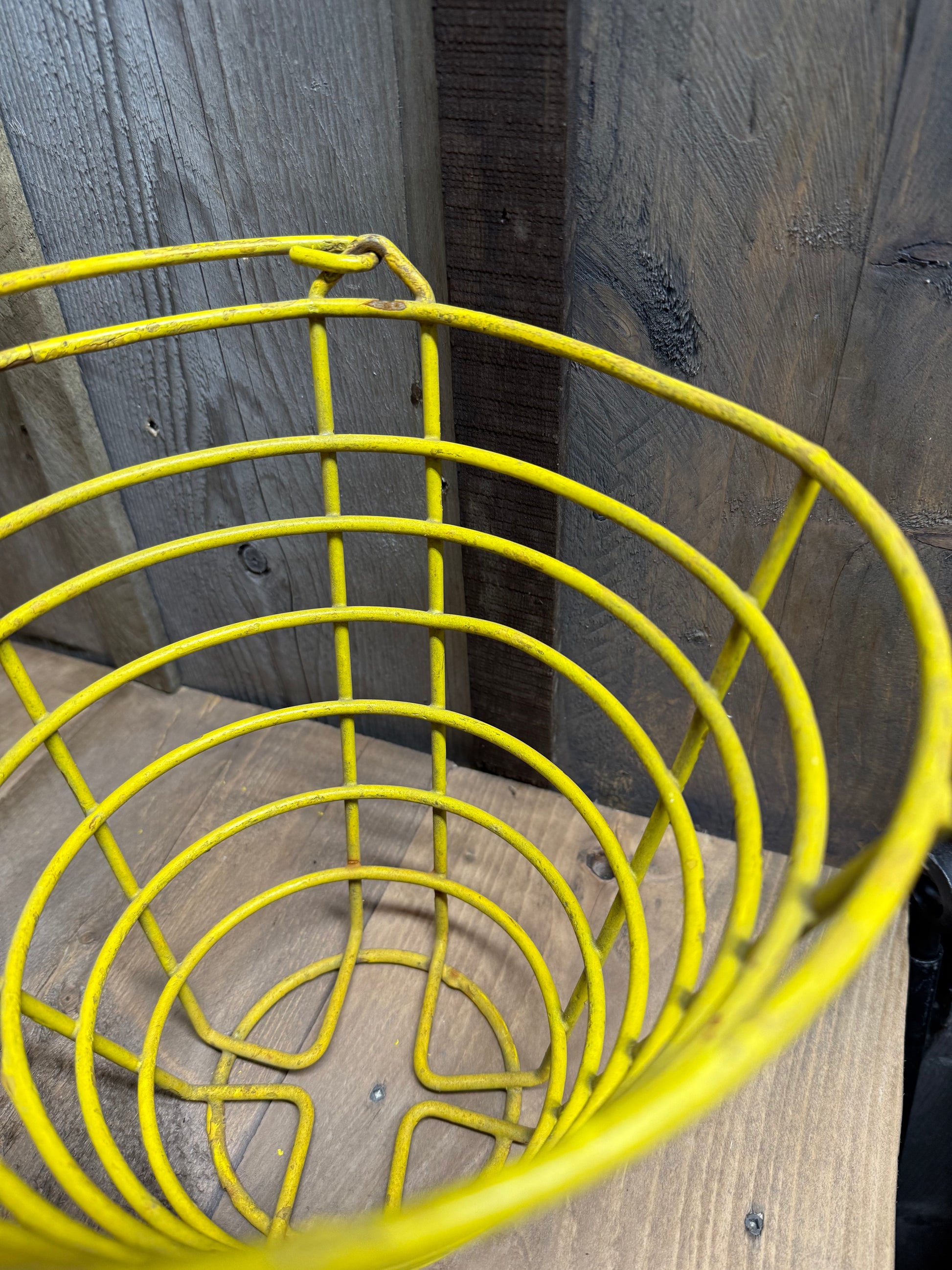 What a neat size. I have seen many larger egg baskets but have never come across this smaller sizes until now. The are the original yellow paint and show signs of wear and use. Measures roughly 9" tall, 12" including the handle and about 9" diameter. We have 2 and both are nearly the same in size and wear. Expect chipped paint, rust, dings, dents and worn areas. ******Color is showing brighter yellow that it is****