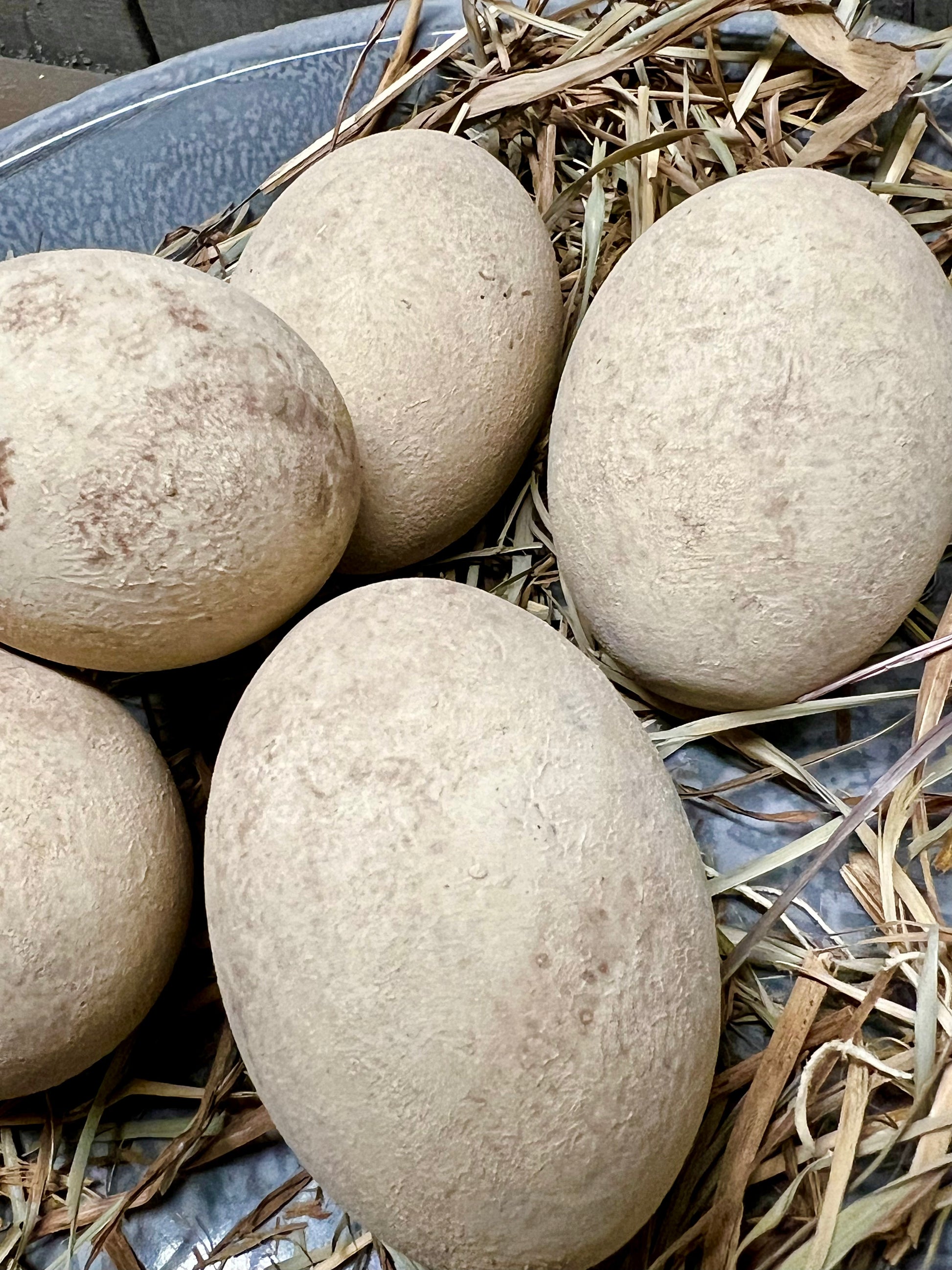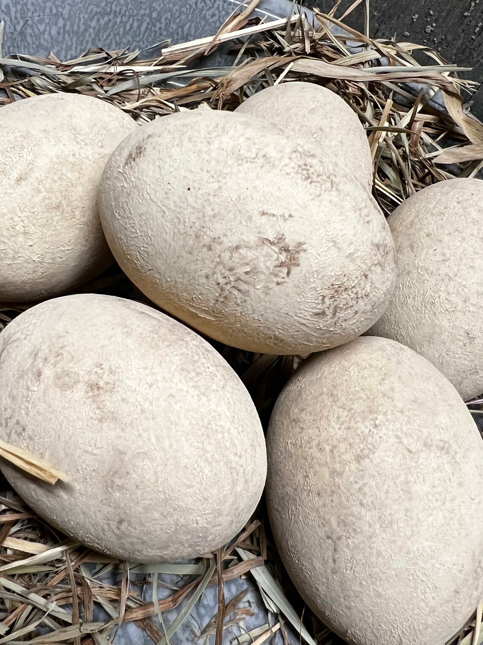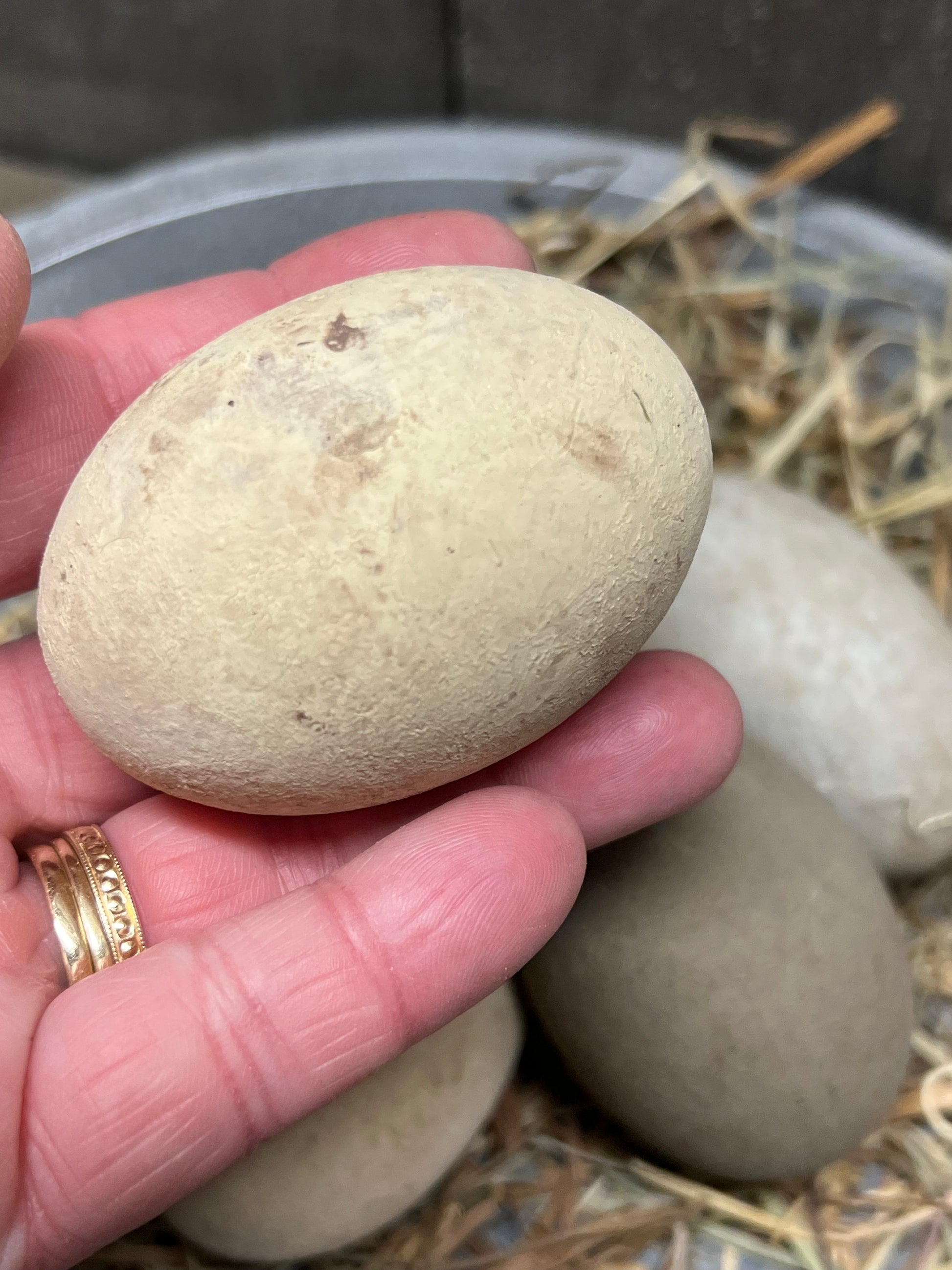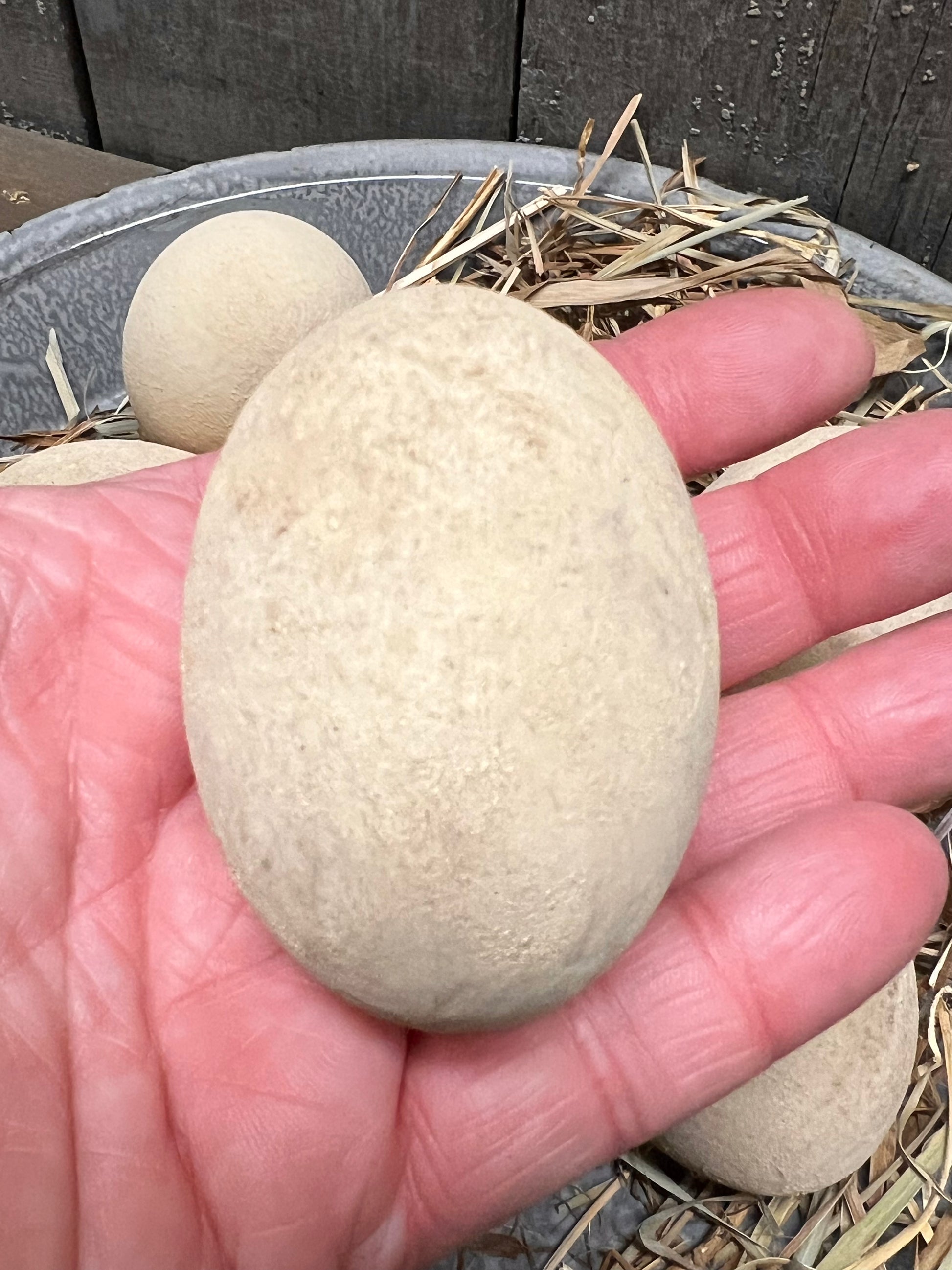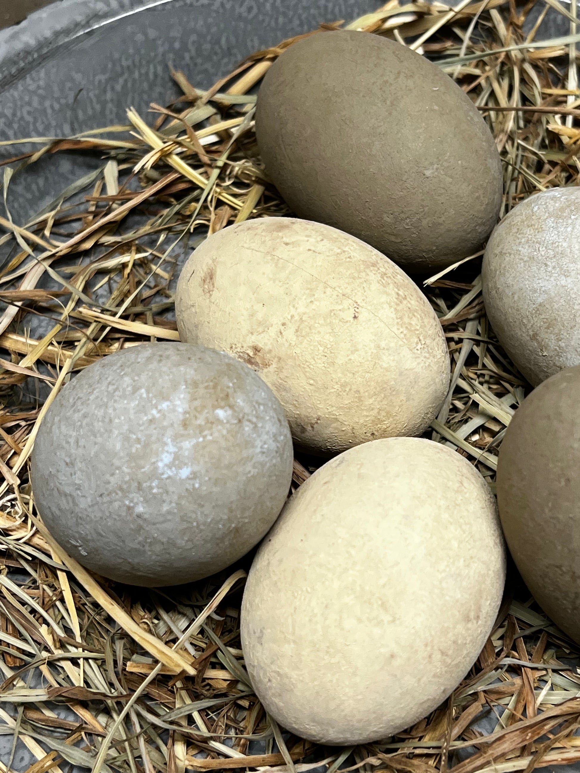 Our wooden eggs are painted with milk paint and "dabbled" with color to look like fresh laid eggs. About 2.5" long, the size is close to that of a real chicken egg. Expect color variations, dark areas, texture and maybe even a small crack...they are meant to fool even the most discerning hen. Painted with Milk Paint and grunged to leave marks and spots; dried grass included. You will receive your choice of 6 Cream or a set of 2 Brown, 2 Blue and 2 Cream.