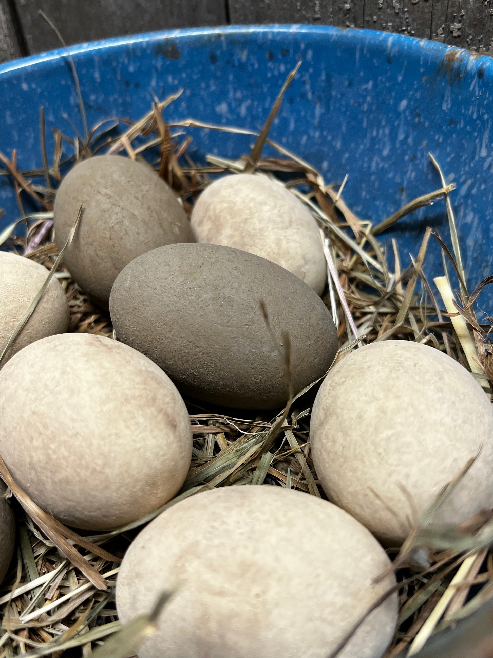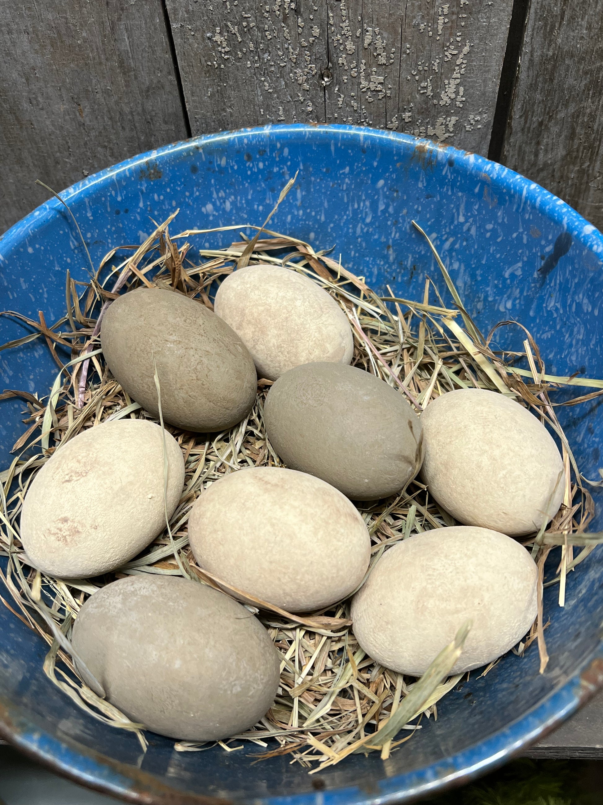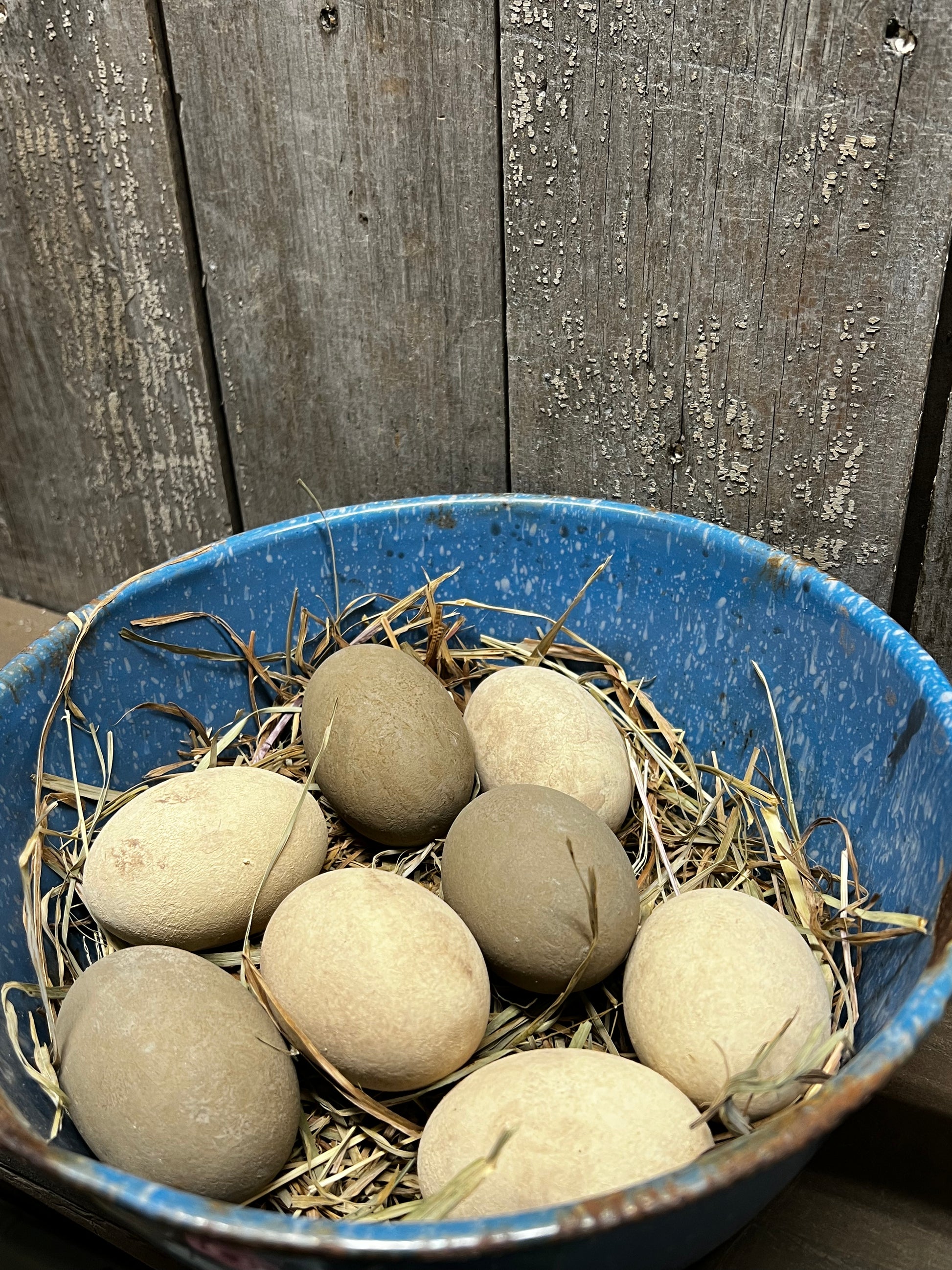 Our wooden eggs are painted with milk paint and "dabbled" with color to look like fresh laid eggs. About 2.5" long, the size is close to that of a real chicken egg. Expect color variations, dark areas, texture and maybe even a small crack...they are meant to fool even the most discerning hen. Painted with Milk Paint and grunged to leave marks and spots; dried grass included. You will receive a set of 5 Cream eggs and 3 Brown eggs in dried grass.