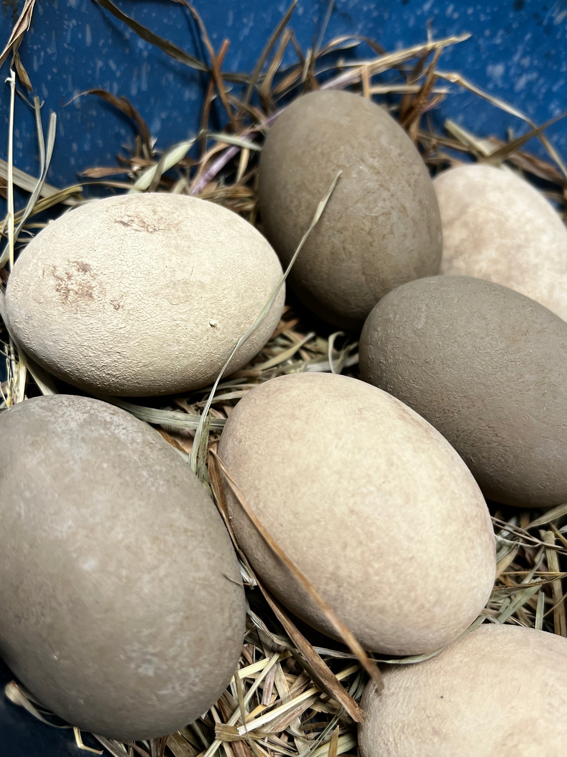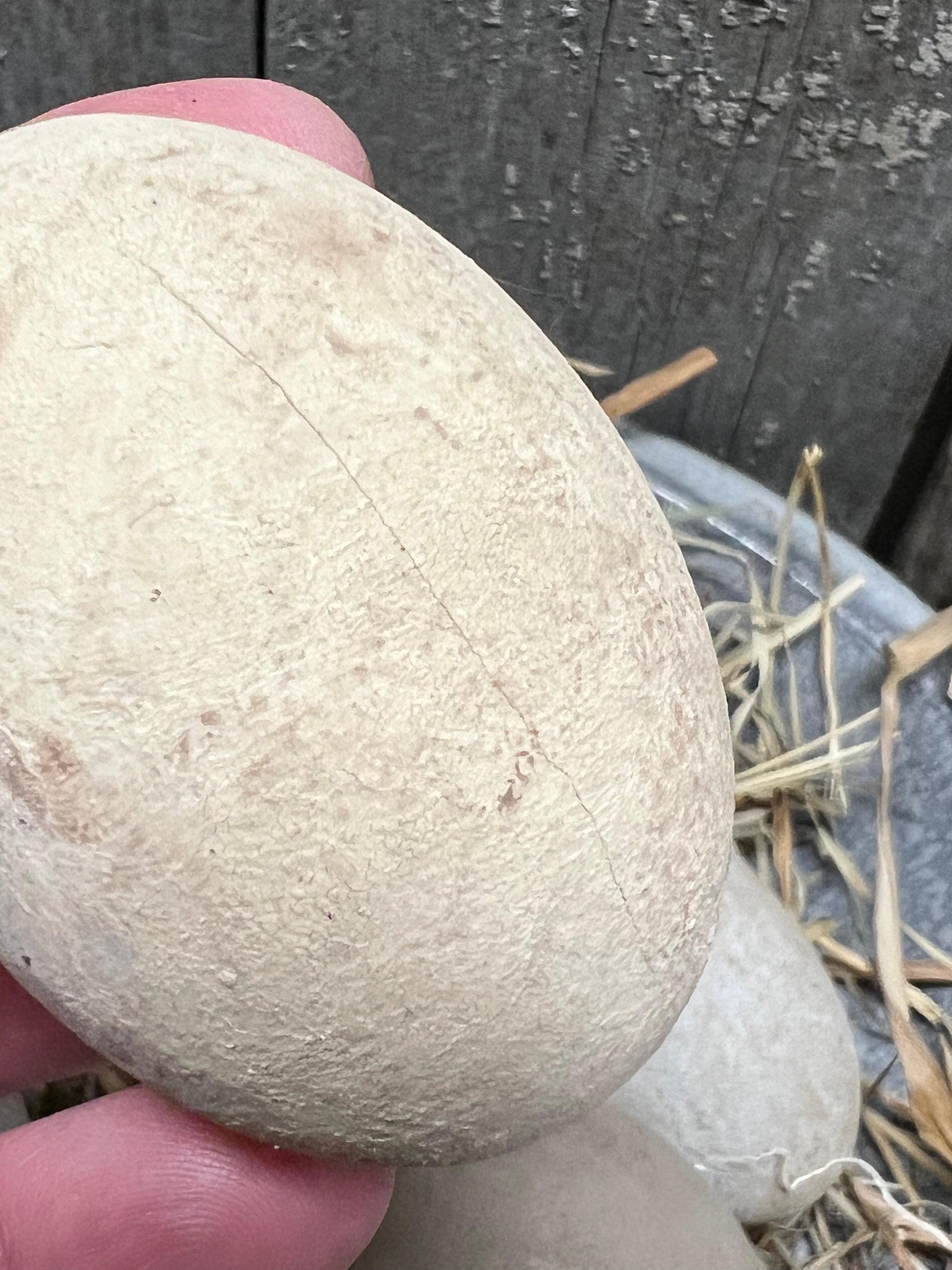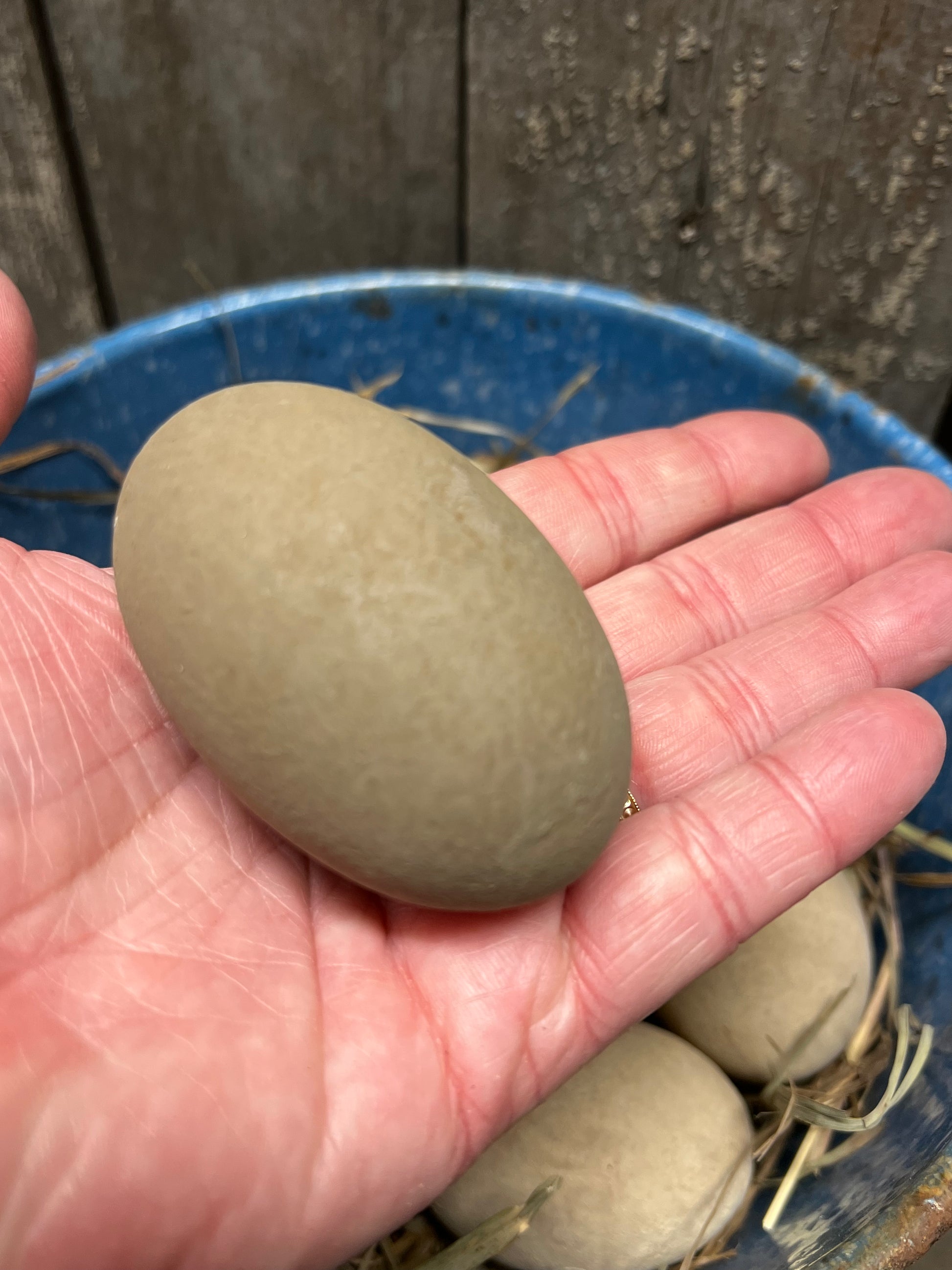 Our wooden eggs are painted with milk paint and "dabbled" with color to look like fresh laid eggs. About 2.5" long, the size is close to that of a real chicken egg. Expect color variations, dark areas, texture and maybe even a small crack...they are meant to fool even the most discerning hen. Painted with Milk Paint and grunged to leave marks and spots; dried grass included. You will receive a set of 5 Cream eggs and 3 Brown eggs in dried grass.