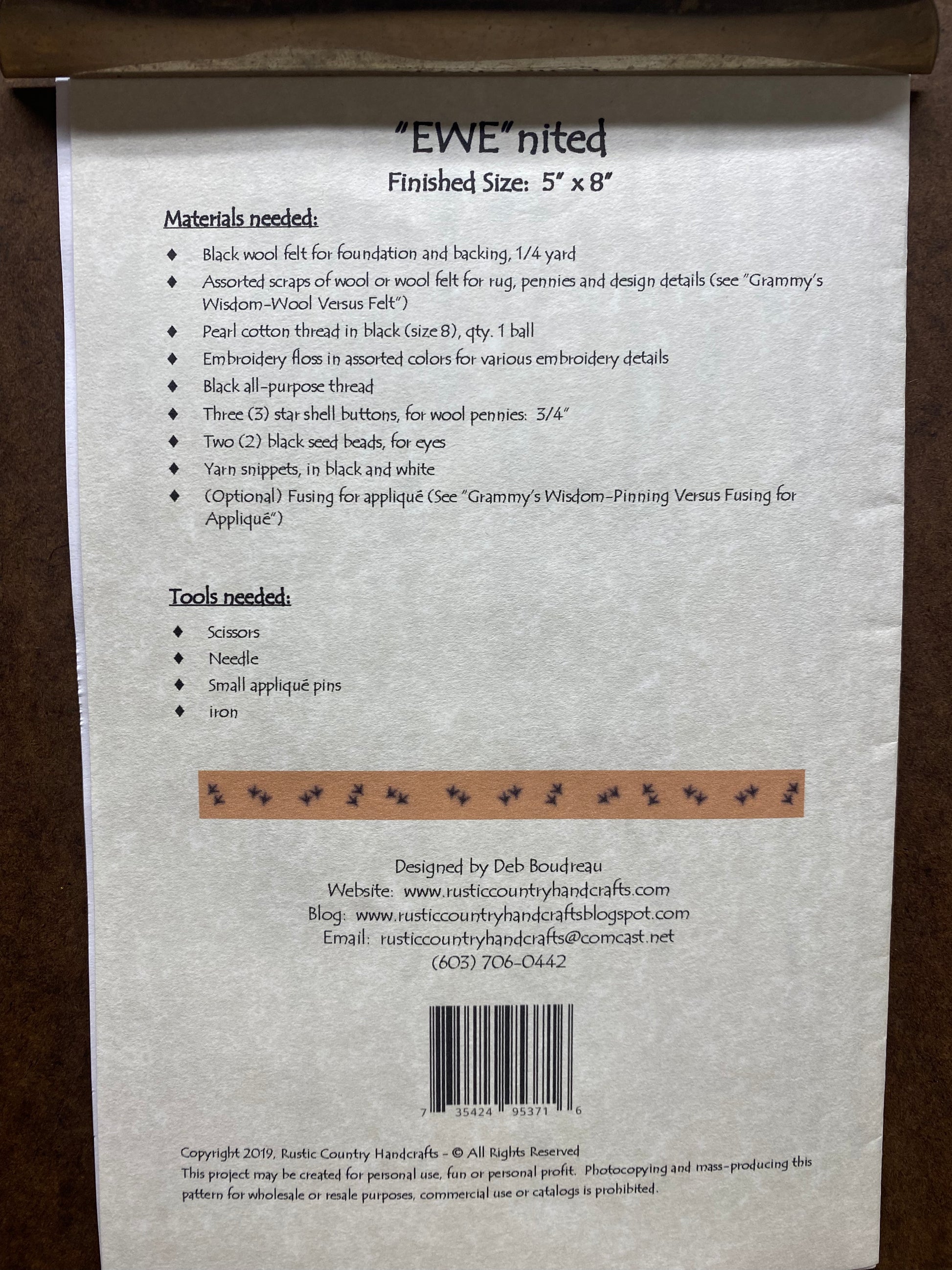 "EWE'nited" is a 5" X 8" wool applique pattern. This pattern is pre printed on paper. Don't forget to shop our assortment of Floss, Perle Cotton and Wool to complete this project.