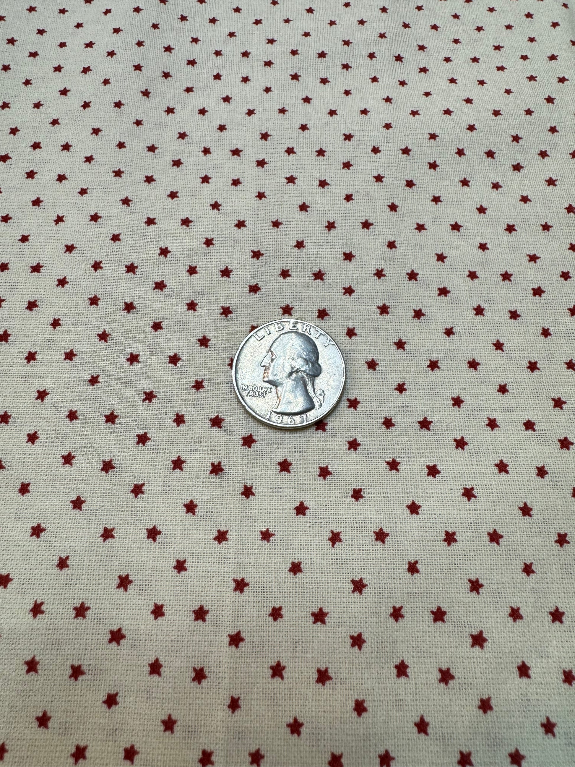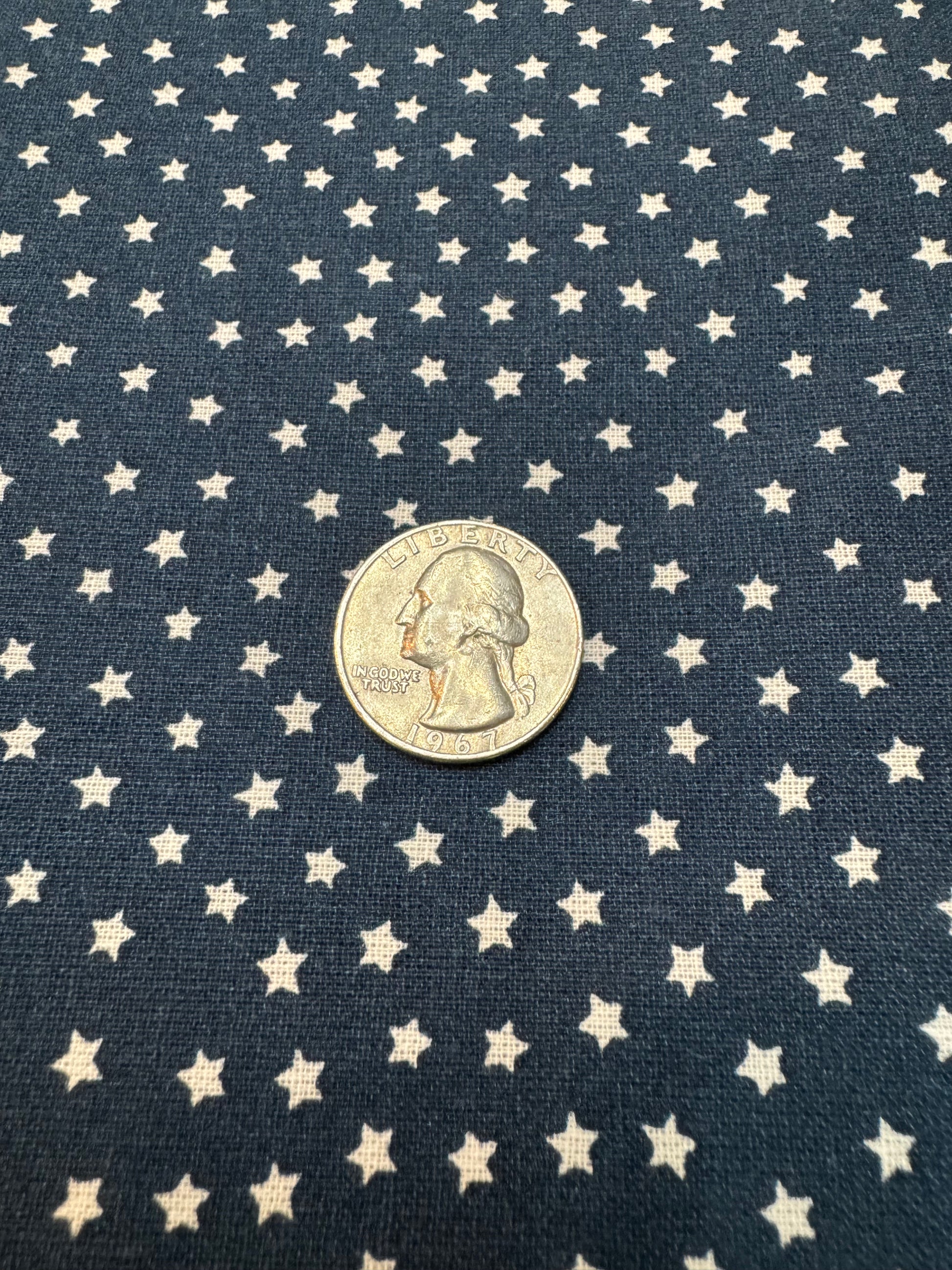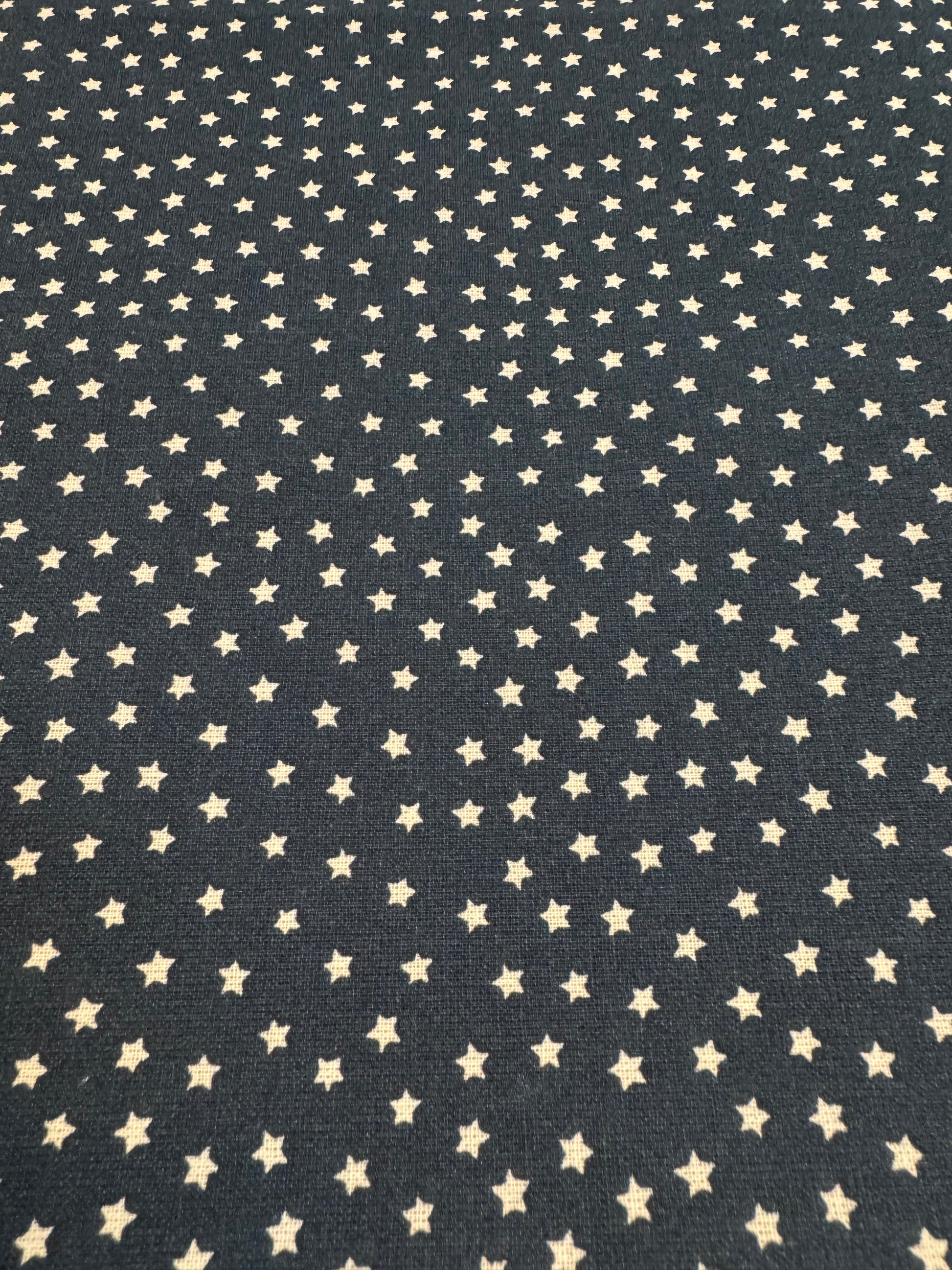 Beautiful and primitive! This navy fabric is printed with ecru stars...so patriotic! A quarter is shown next to the stars for size. Great for dolls, dresses, background fabric and more! 100% cotton. Sold in YARDS only. 44/45 inches