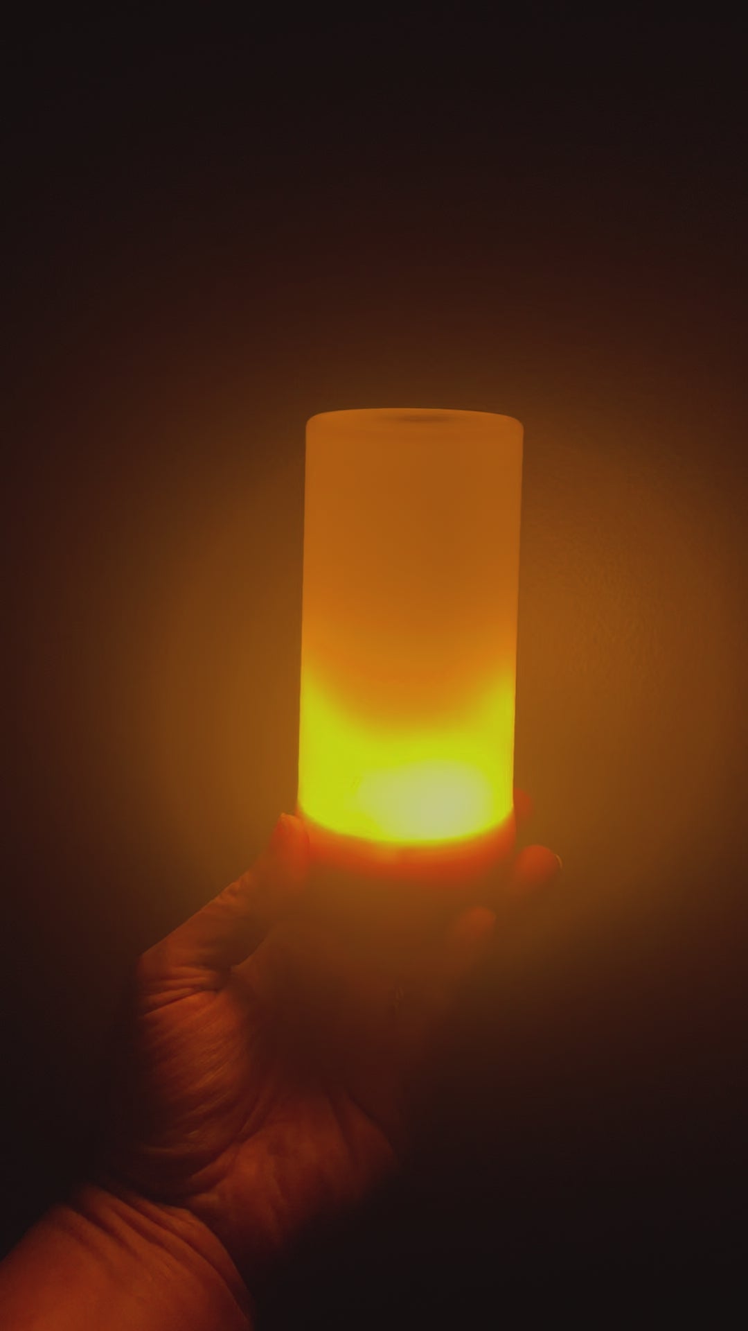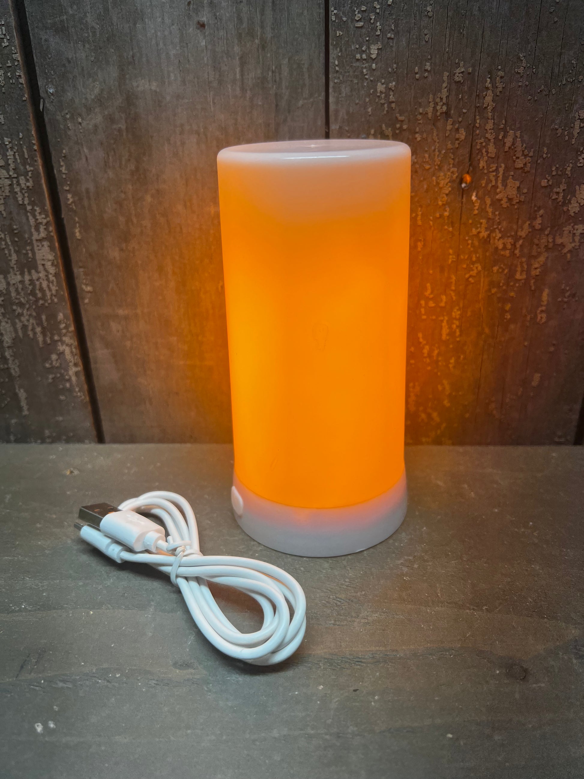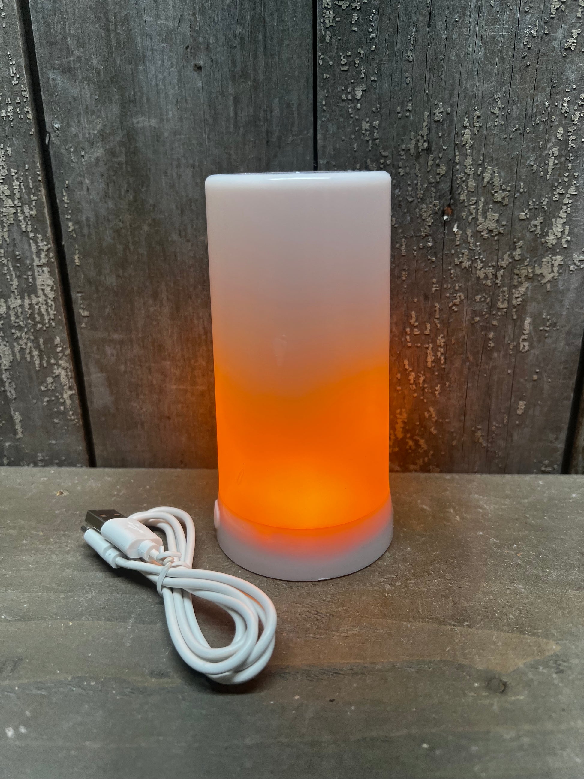 The look of real flame! Perfect for lanterns, pumpkins, snowmen and cut out metal pails. The LED FireGlow Flame has a Reverse Direction Flame effect and a USB port for the rechargeable Battery. Approximate 20 Hour Run time and a 4 Hour Charge Time. 5 hour TIMER and 3 Functions...FLAME, SOLID ON & DIM. Magnetic base. 2.75"D x 5"H.