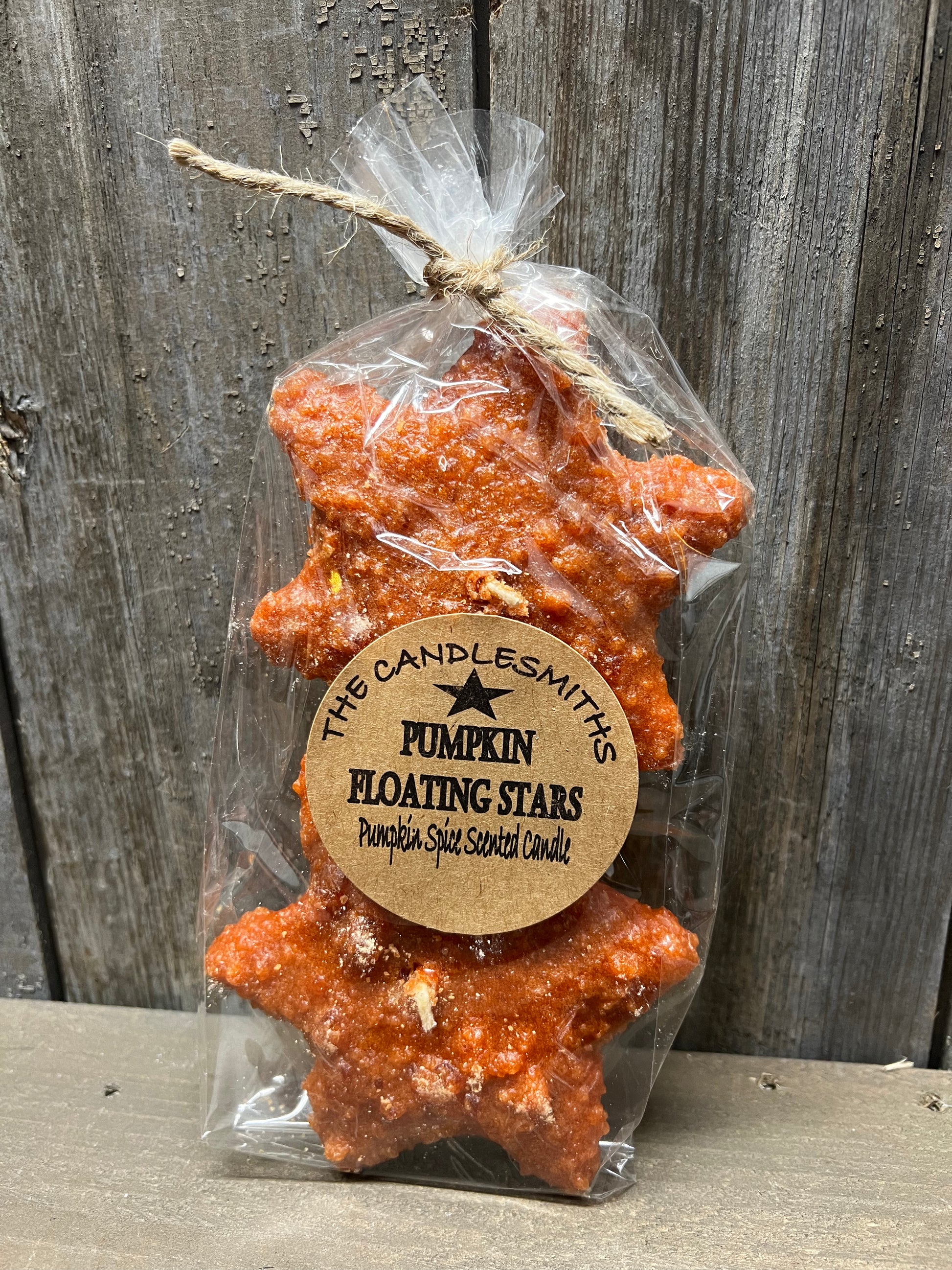 The fragrance of Pumpkin & Spices make a lovely centerpiece placed in a bowl or crock of water. The hand poured wax stars come in a set of 2. Each small candle is 4.5" wide. DO NOT BURN UNATTENDED.