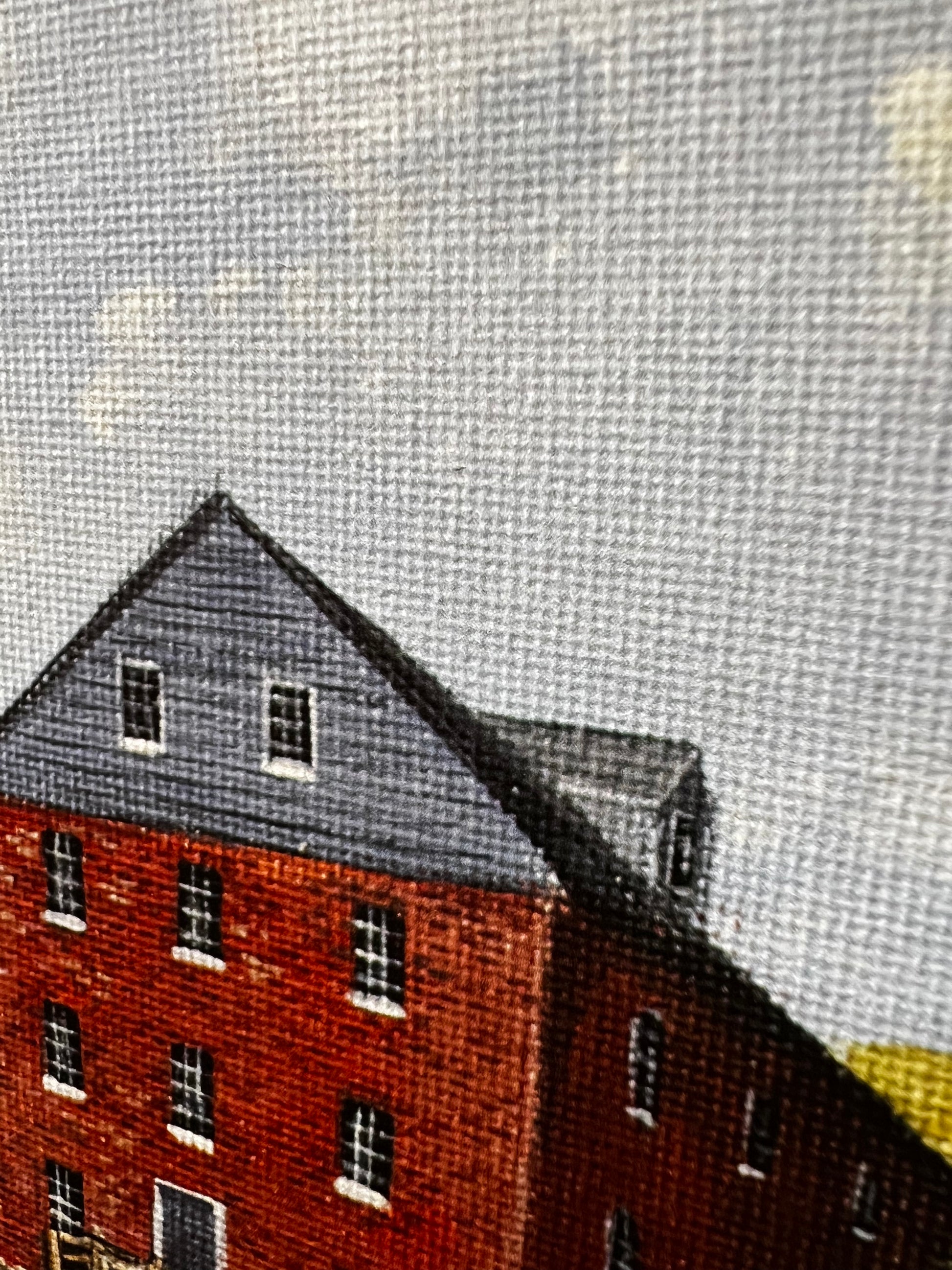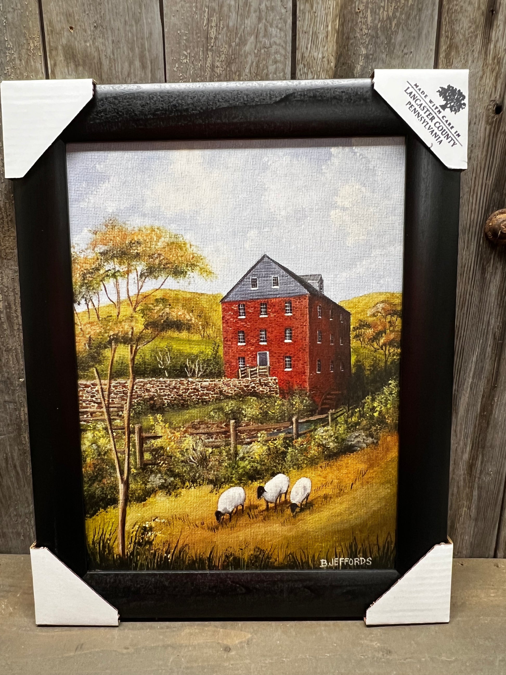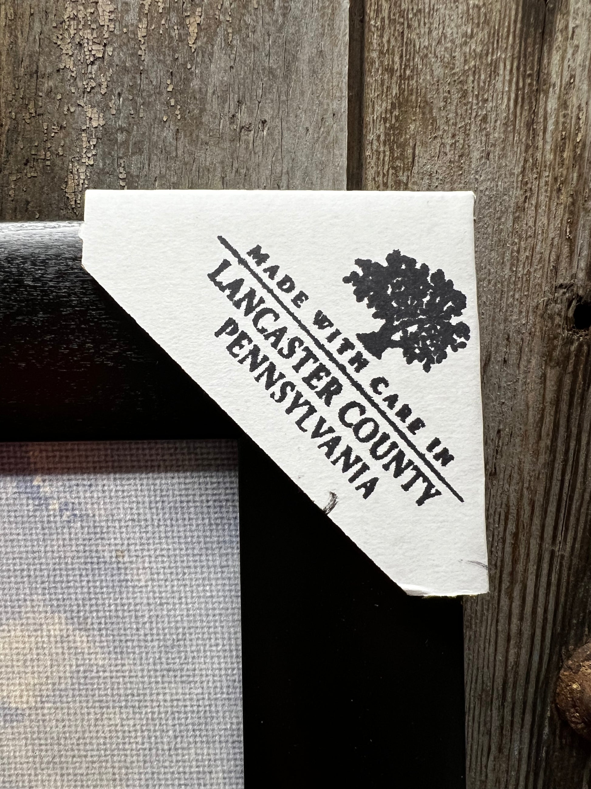 Our PA made framed art is lovely in quality and appearance. Professionally printed on canvas textured wood, the piece is given the look of a hand painted original. Made in Lancaster County, the ridge in the back of the frame makes for easy hanging. No glass. Protective covers protect the corners for shipping and are easily removed. Simple Black Frame.