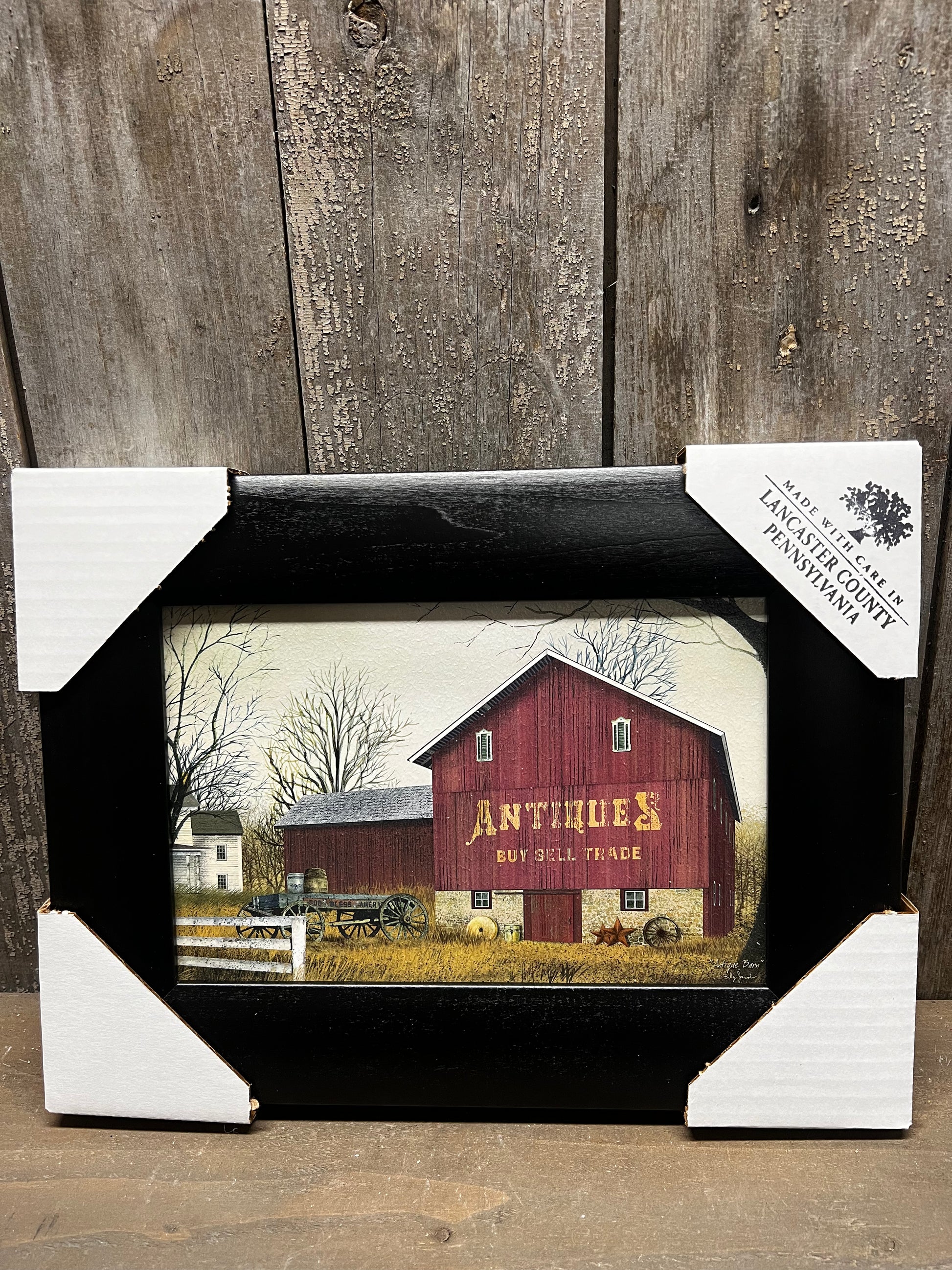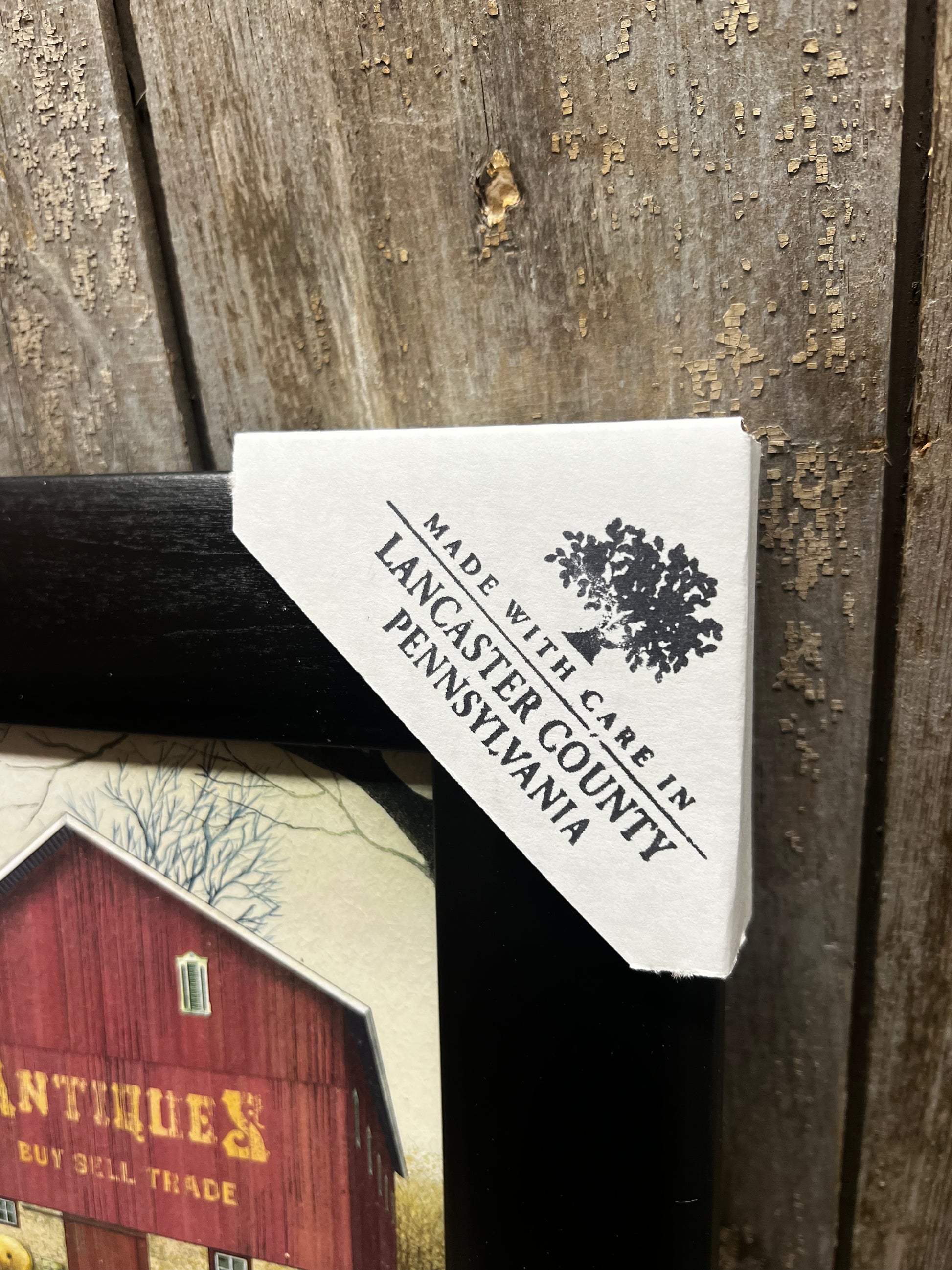 Our PA made framed art is lovely in quality and appearance. Professionally printed on canvas textured wood, the piece is given the look of a hand painted original. Made in Lancaster County, the ridge in the back of the frame makes for easy hanging. No glass. Protective covers protect the corners for shipping and are easily removed. Simple Black Frame.