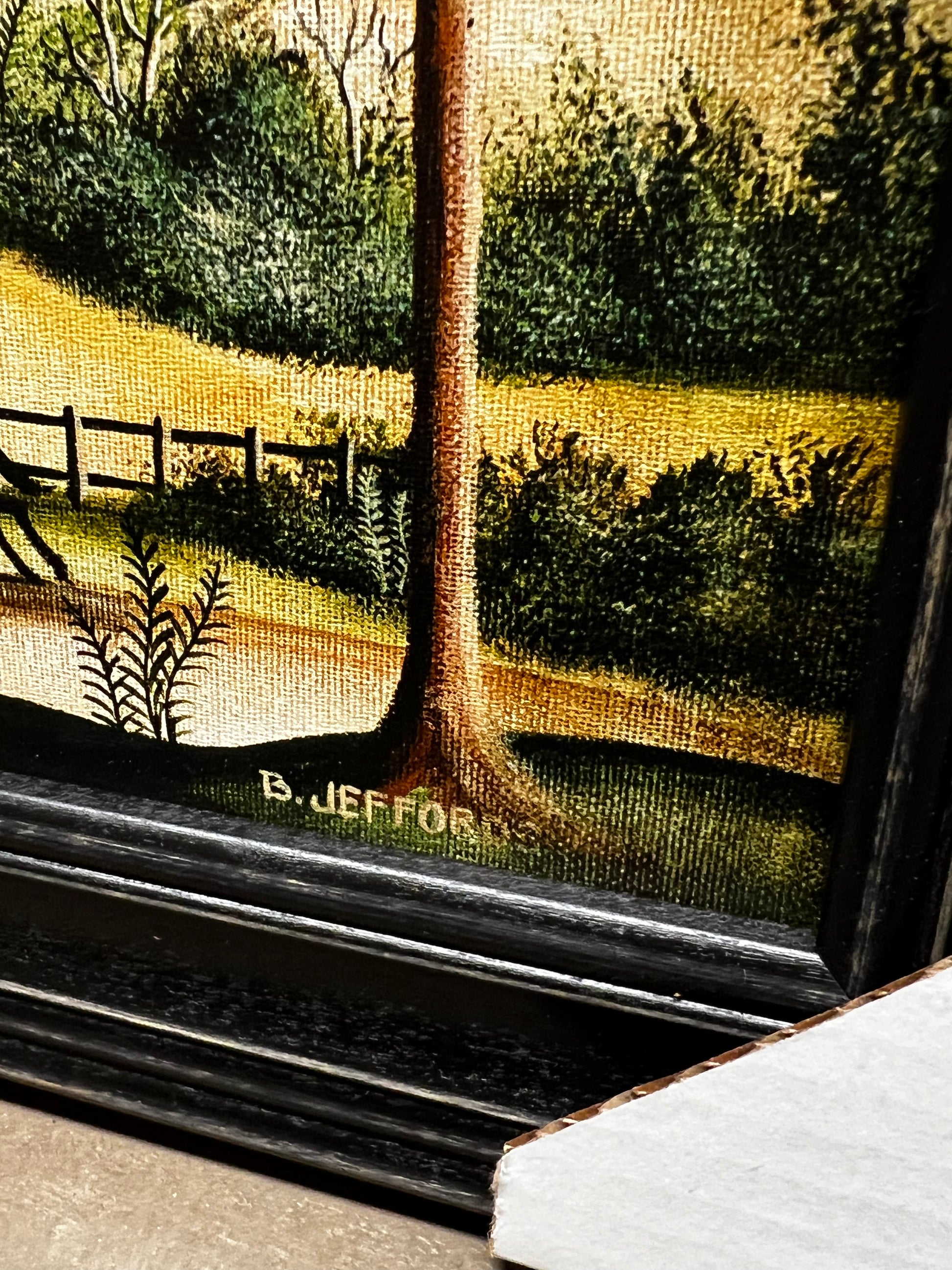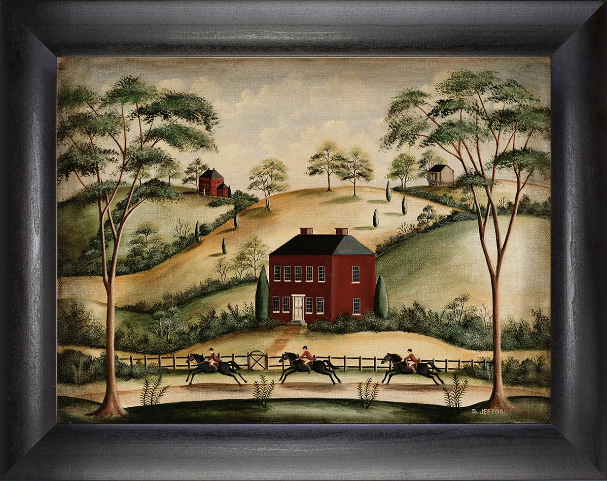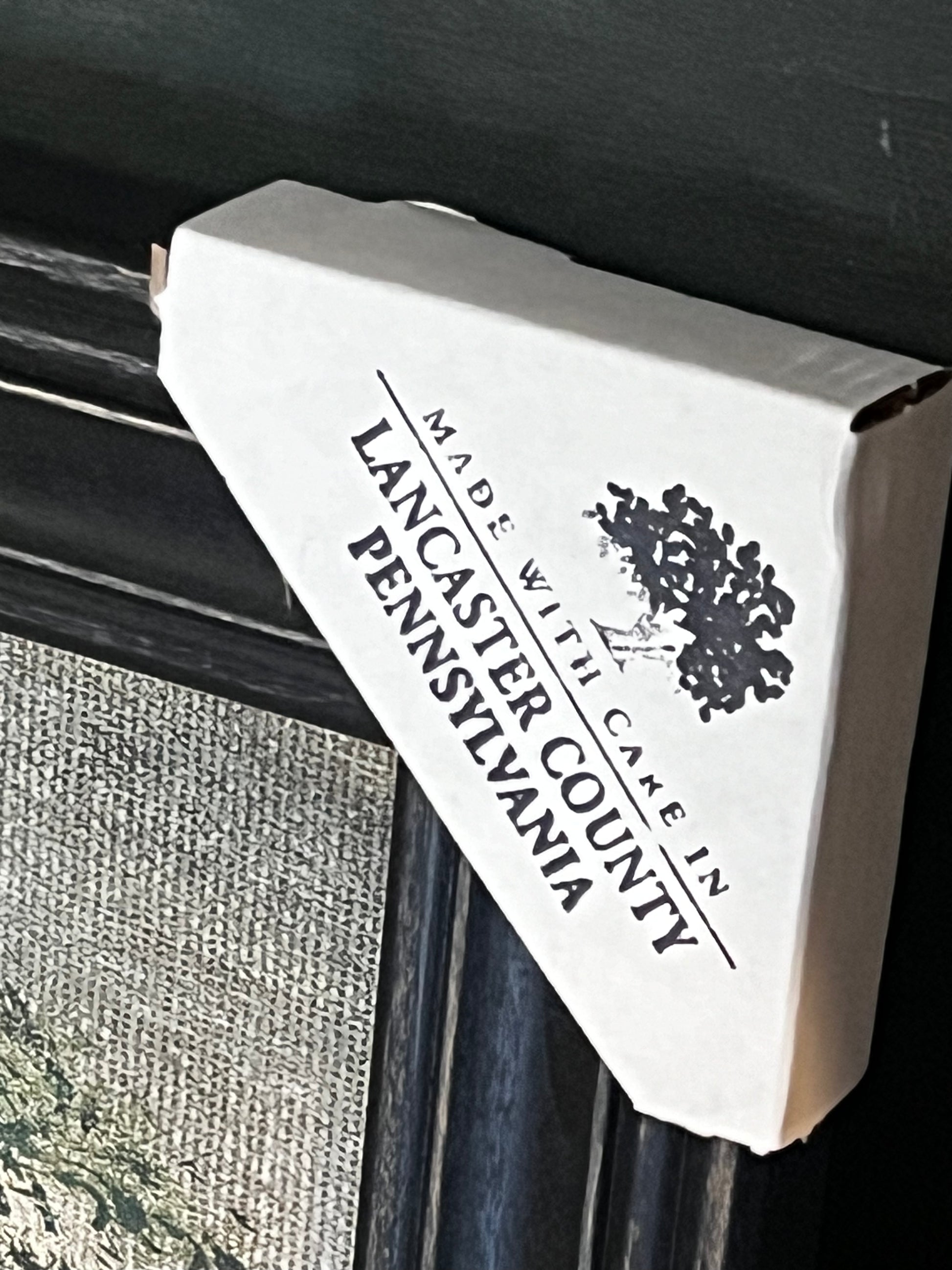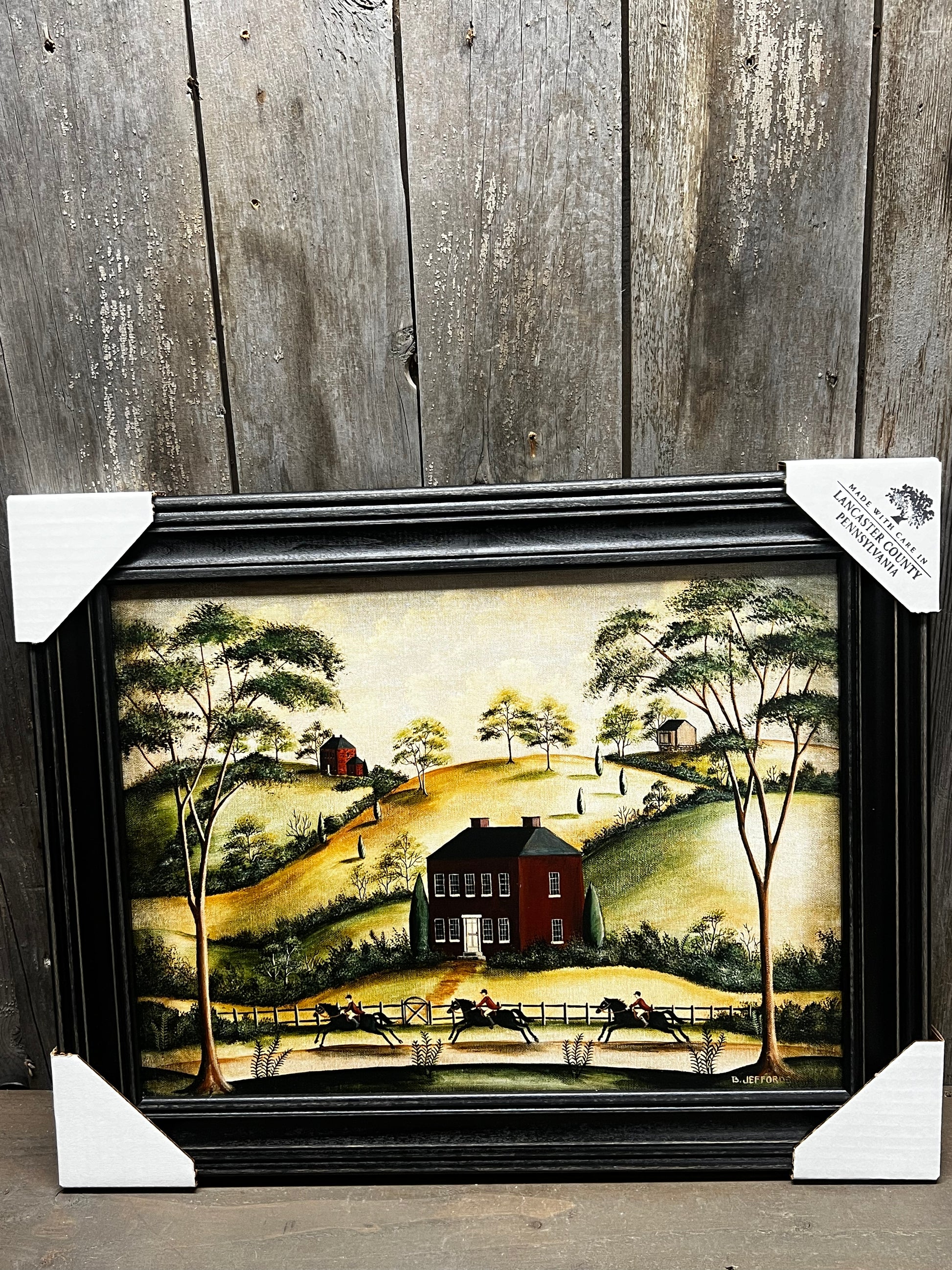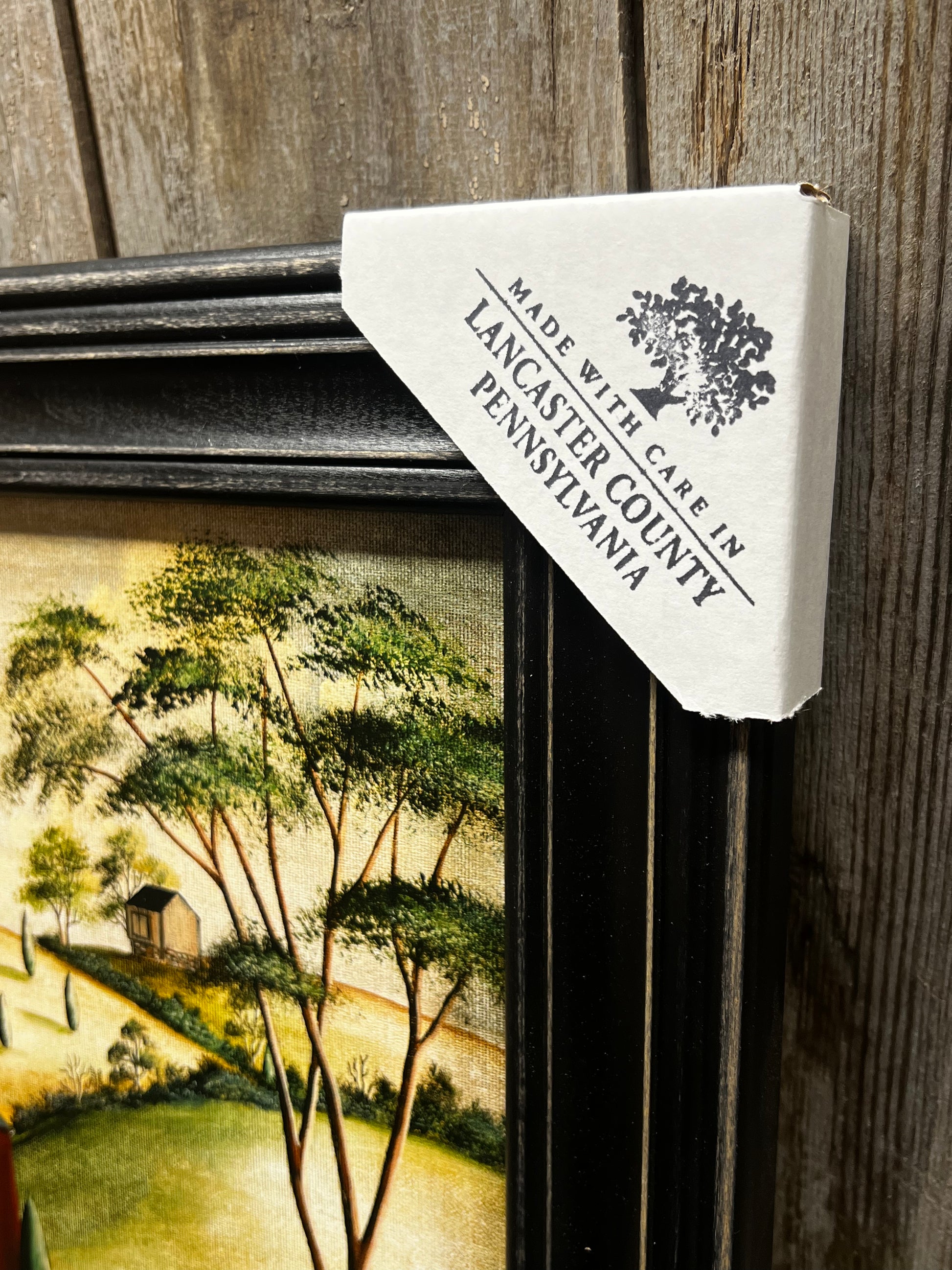 Our PA made framed art is lovely in quality and appearance. Professionally printed on canvas textured wood, the piece is given the look of a hand painted original. Made in Lancaster County, the ridge in the back of the frame makes for easy hanging. No glass. Protective covers protect the corners for shipping and are easily removed. Colonial Black Frame.
