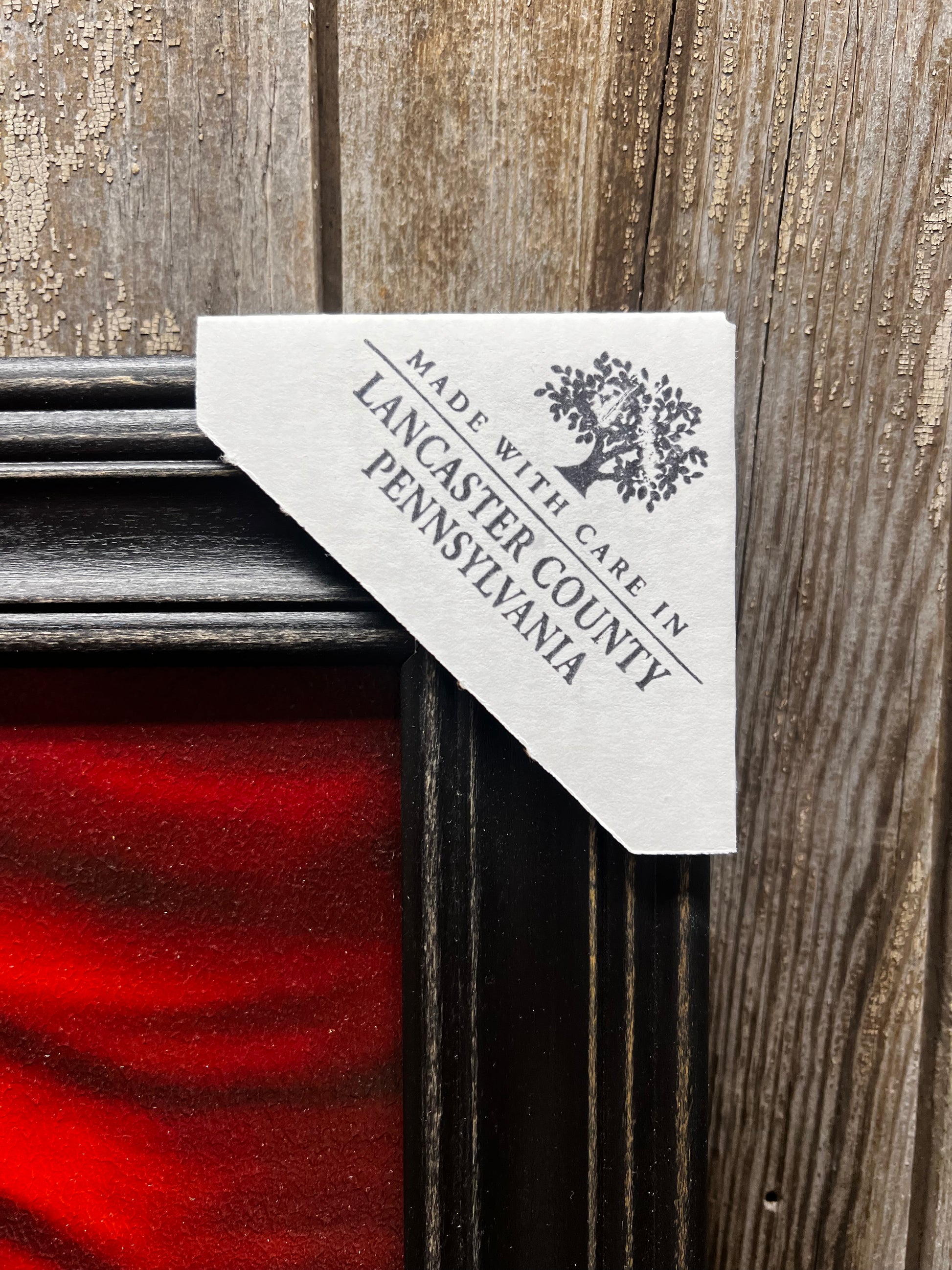 Our PA made framed art is lovely in quality and appearance. Professionally printed on canvas textured wood, the piece is given the look of a hand painted original. Made in Lancaster County, the ridge in the back of the frame makes for easy hanging. No glass. Protective covers protect the corners for shipping and are easily removed. Colonial Black Frame