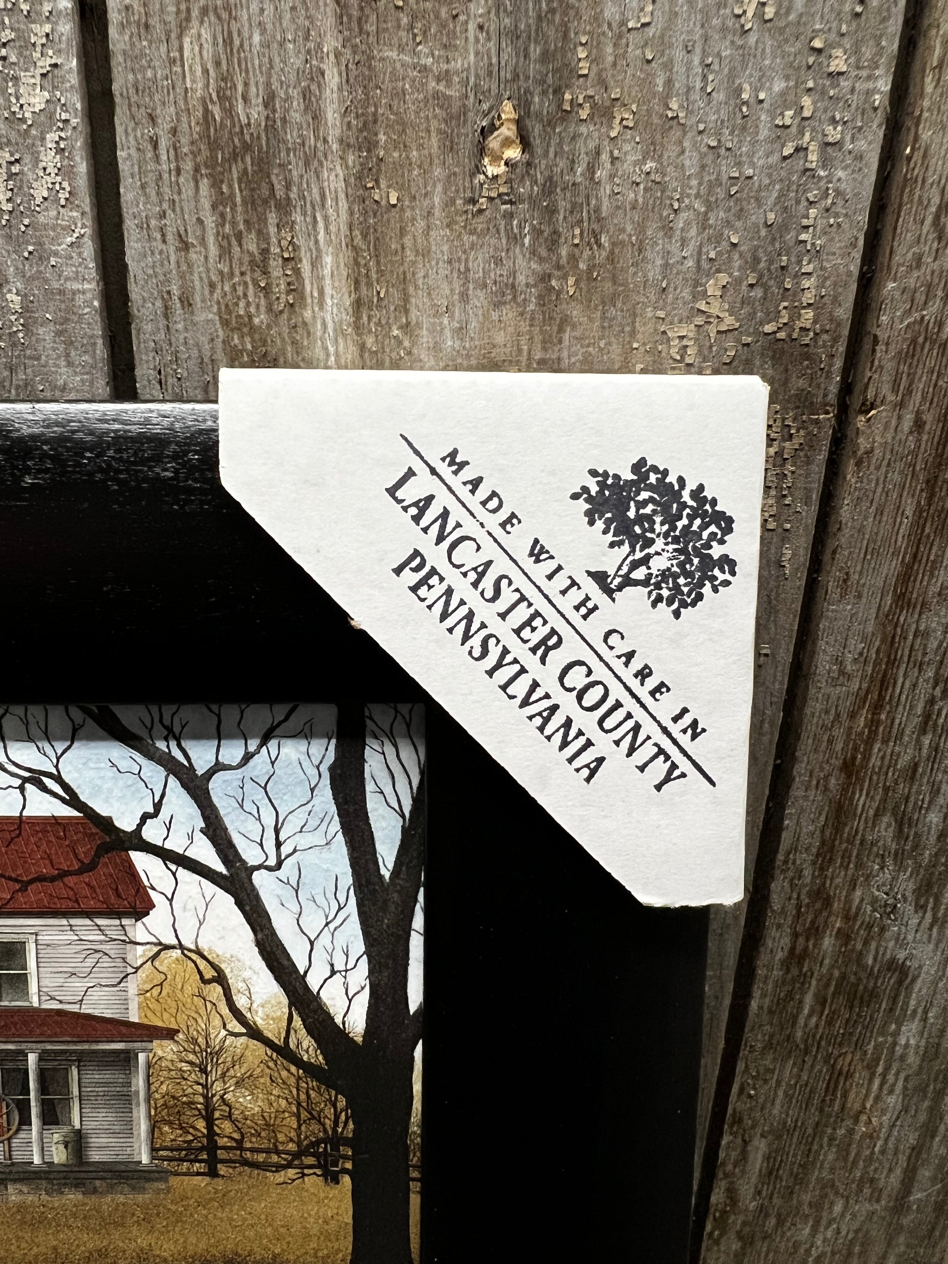 Our PA made framed art is lovely in quality and appearance. Professionally printed on canvas textured wood, the piece is given the look of a hand painted original. Made in Lancaster County, the ridge in the back of the frame makes for easy hanging. No glass. Protective covers protect the corners for shipping and are easily removed. Simple Black Frame.