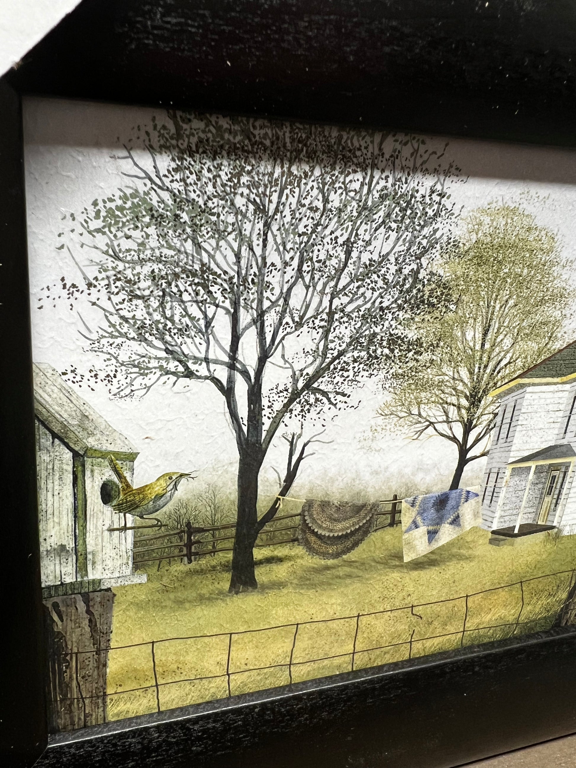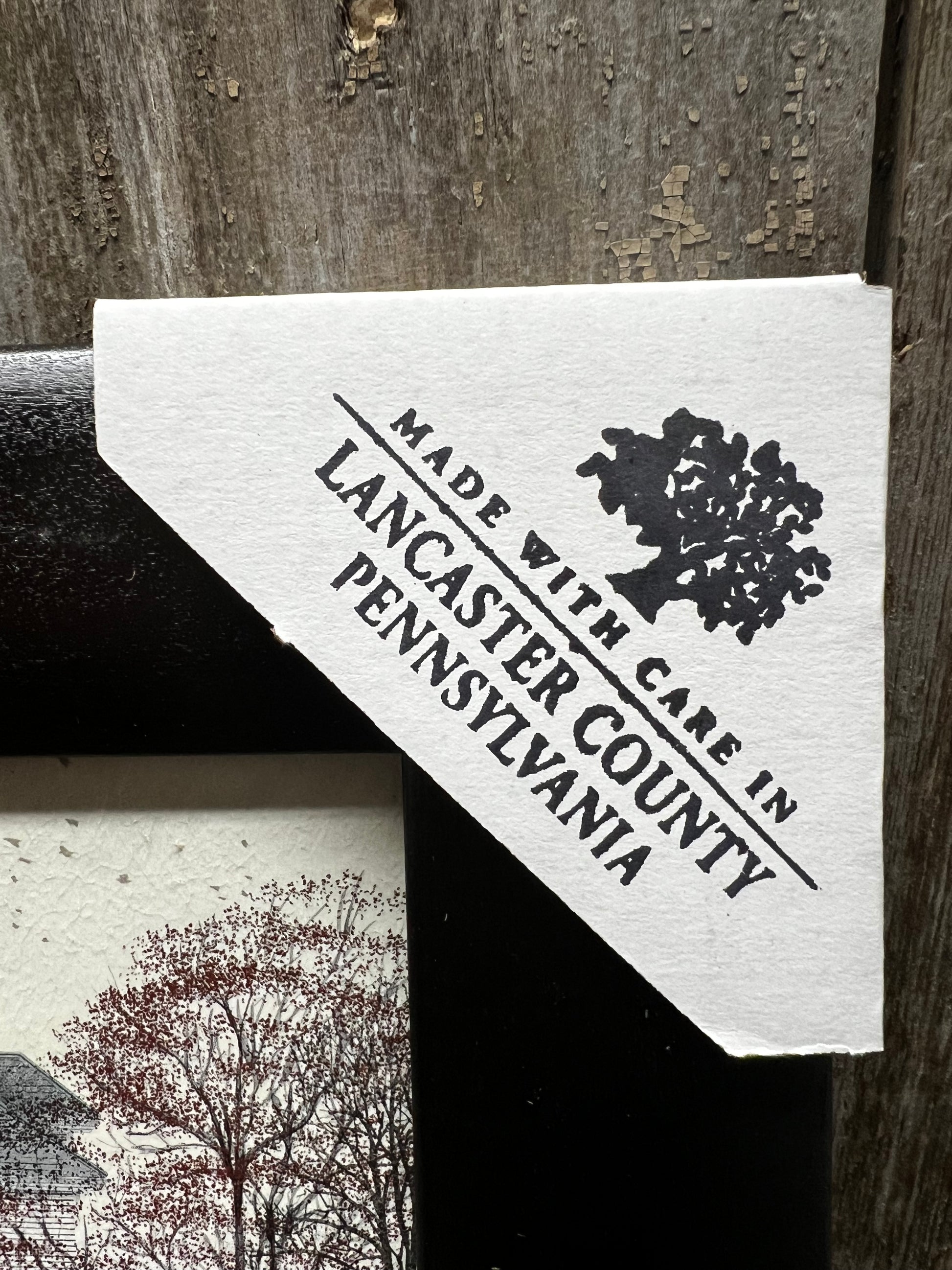 Our PA made framed art is lovely in quality and appearance. Professionally printed on canvas textured wood, the piece is given the look of a hand painted original. Made in Lancaster County, the ridge in the back of the frame makes for easy hanging. No glass. Protective covers protect the corners for shipping and are easily removed. Simple Black Frame.
