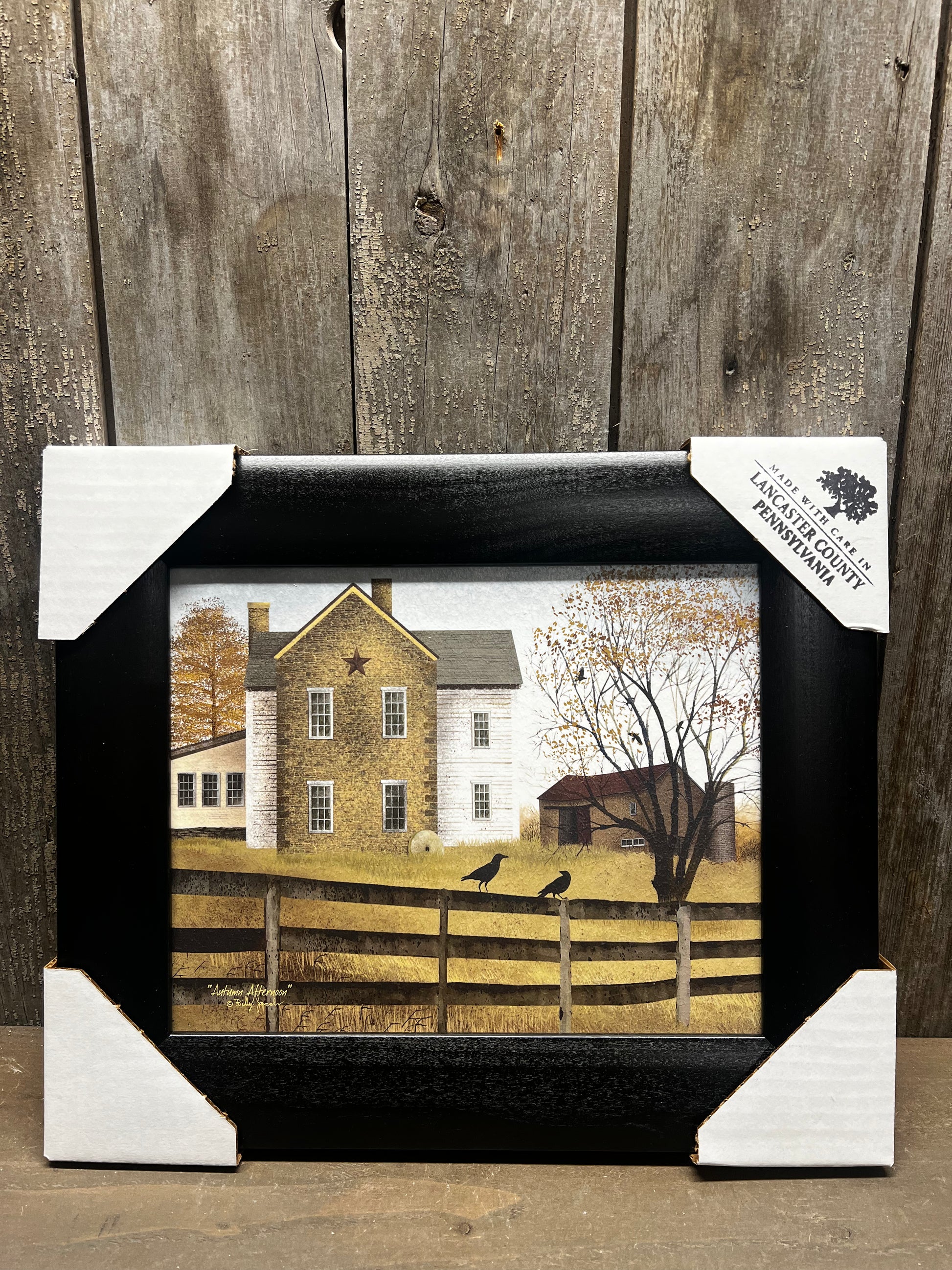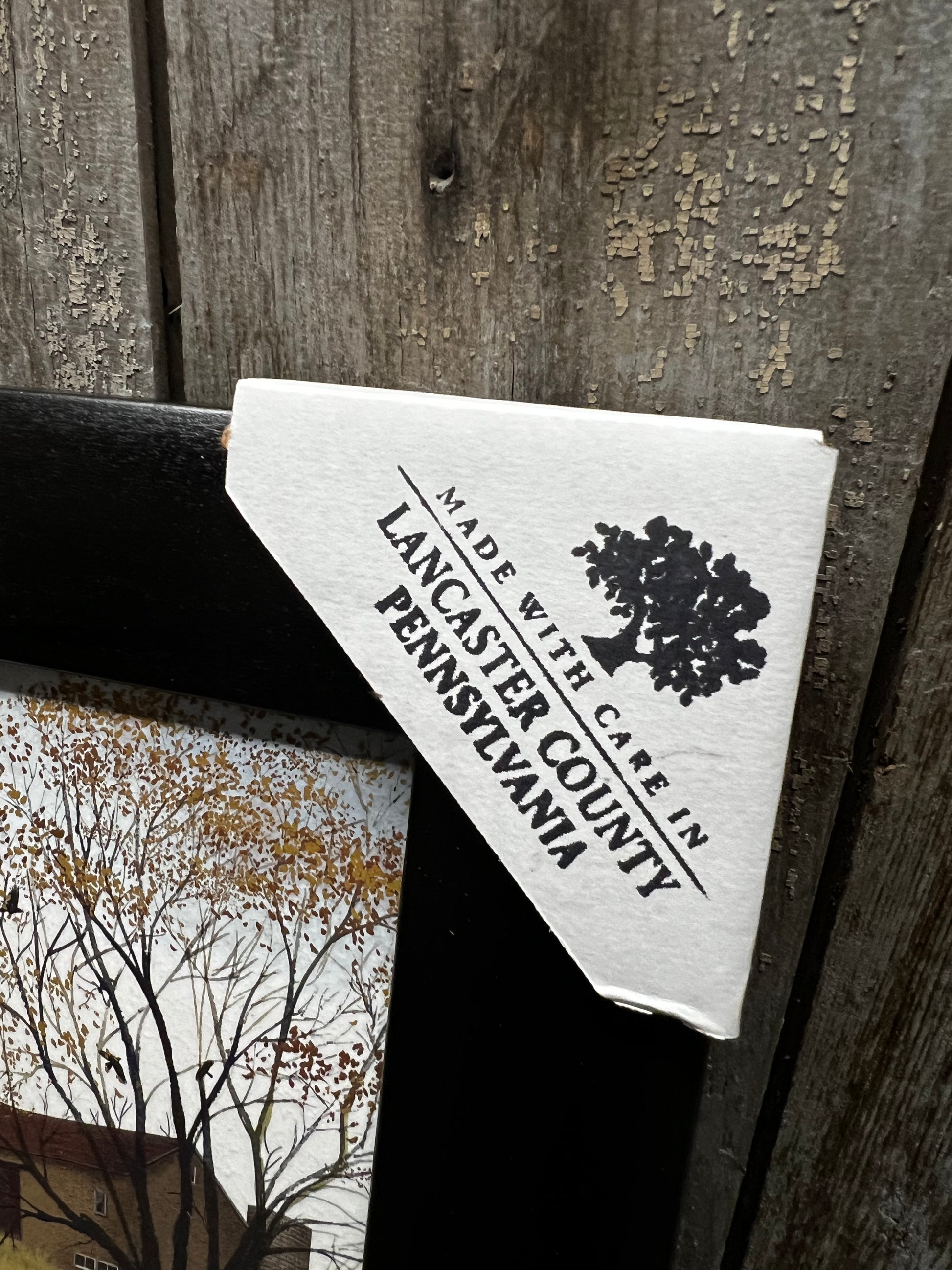 Our PA made framed art is lovely in quality and appearance. Professionally printed on canvas textured wood, the piece is given the look of a hand painted original. Made in Lancaster County, the ridge in the back of the frame makes for easy hanging. No glass. Protective covers protect the corners for shipping and are easily removed. Simple Black Frame.