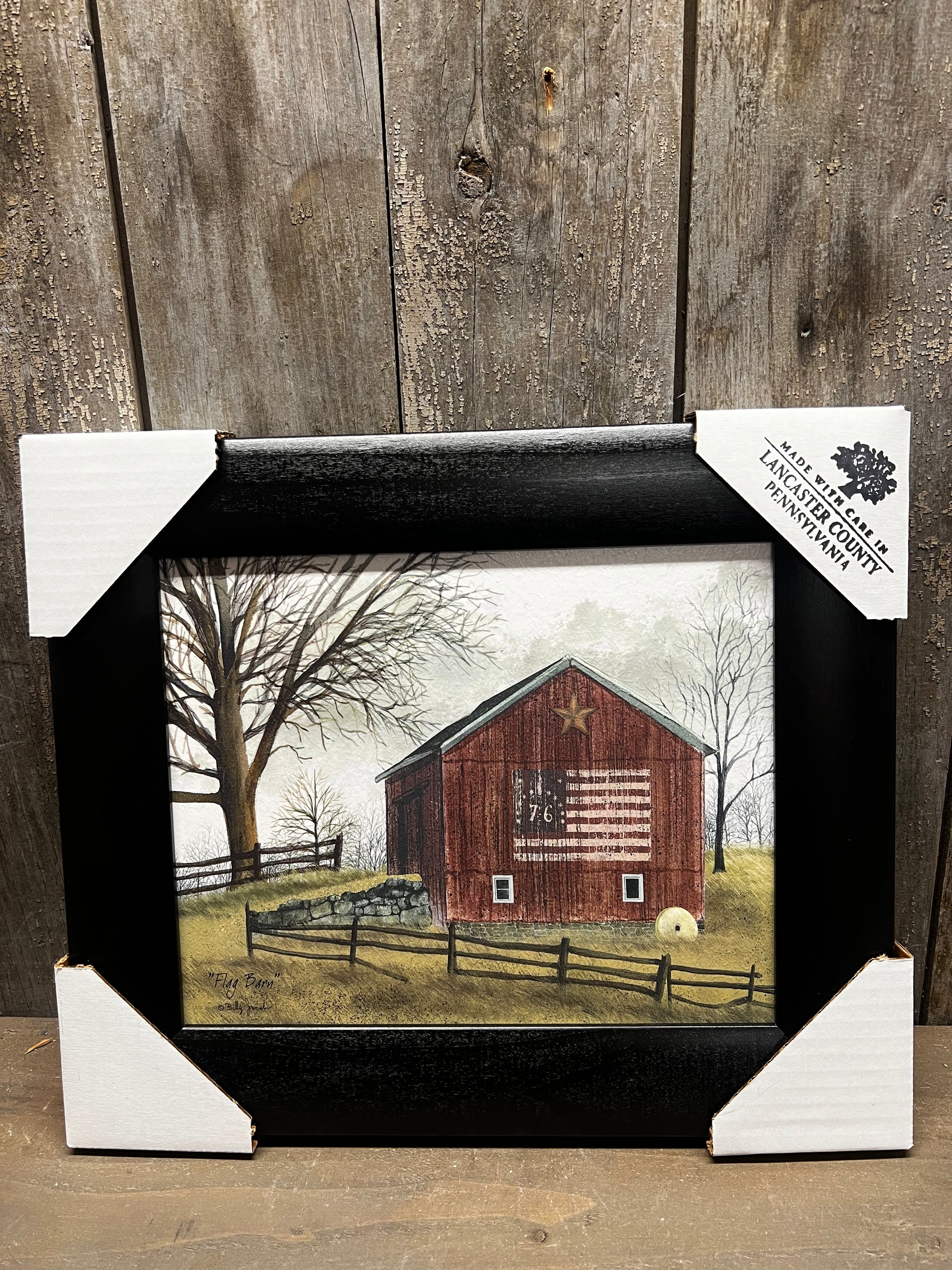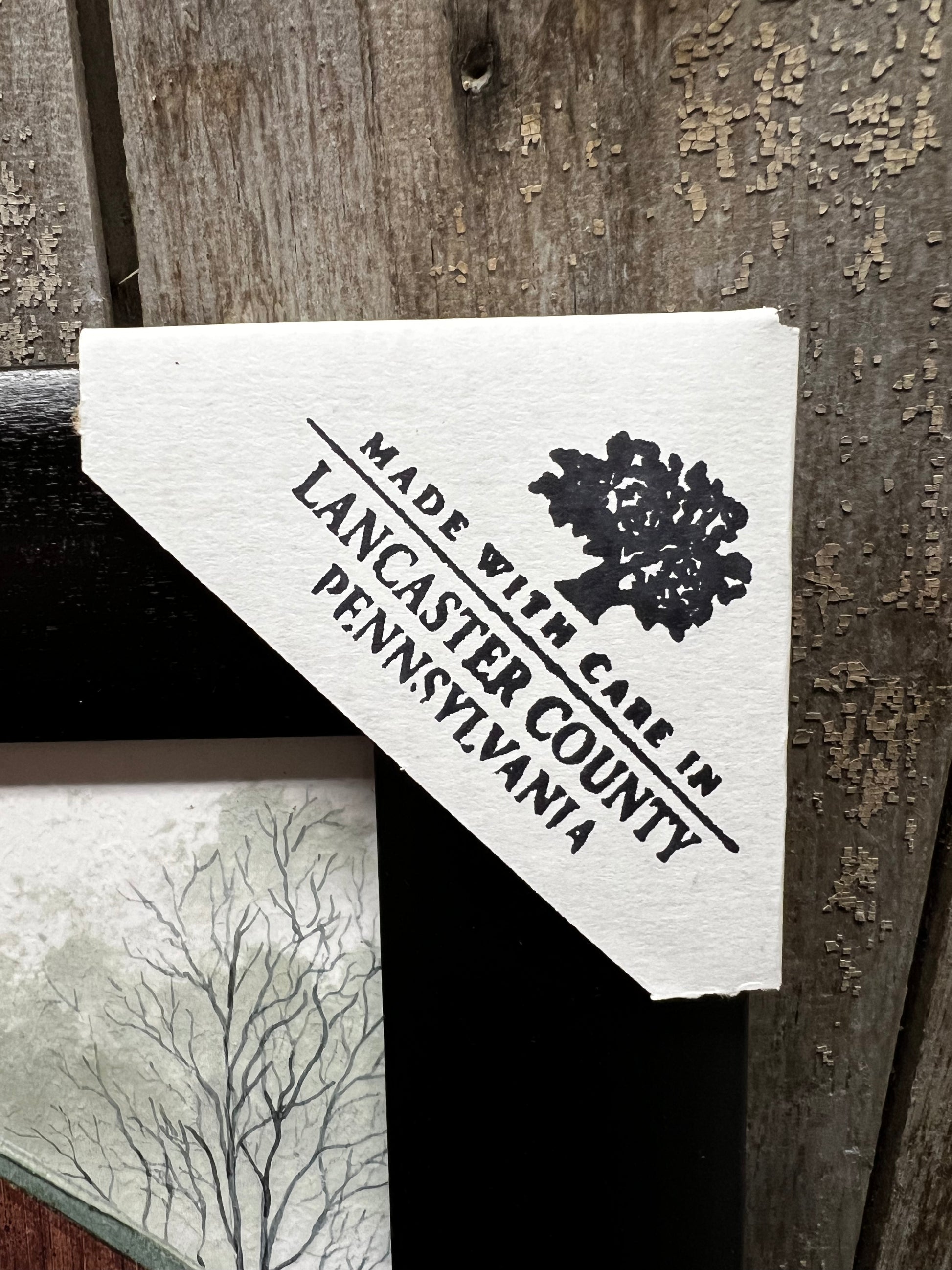 Our PA made framed art is lovely in quality and appearance. Professionally printed on canvas textured wood, the piece is given the look of a hand painted original. Made in Lancaster County, the ridge in the back of the frame makes for easy hanging. No glass. Protective covers protect the corners for shipping and are easily removed. Simple Black Frame.