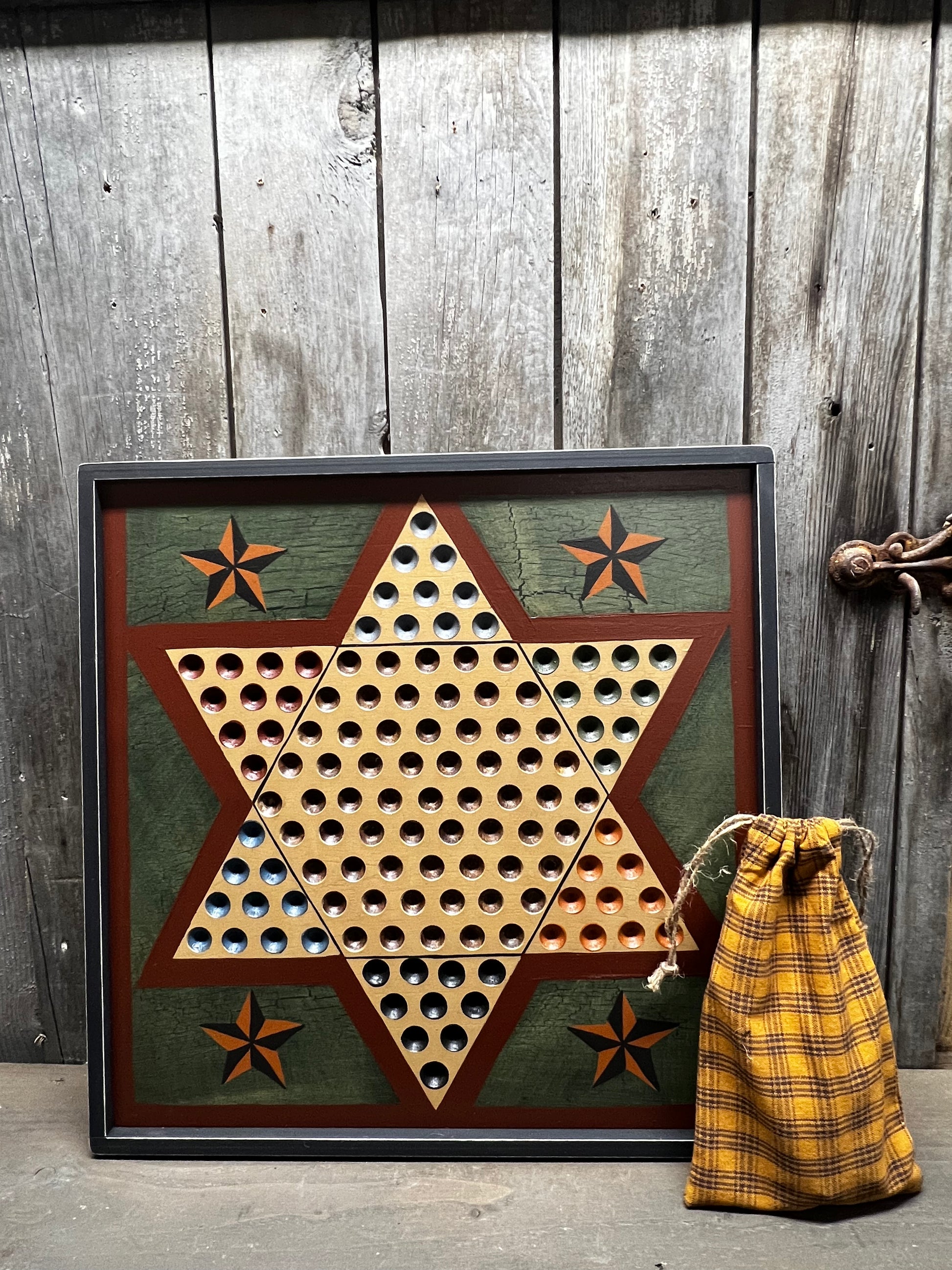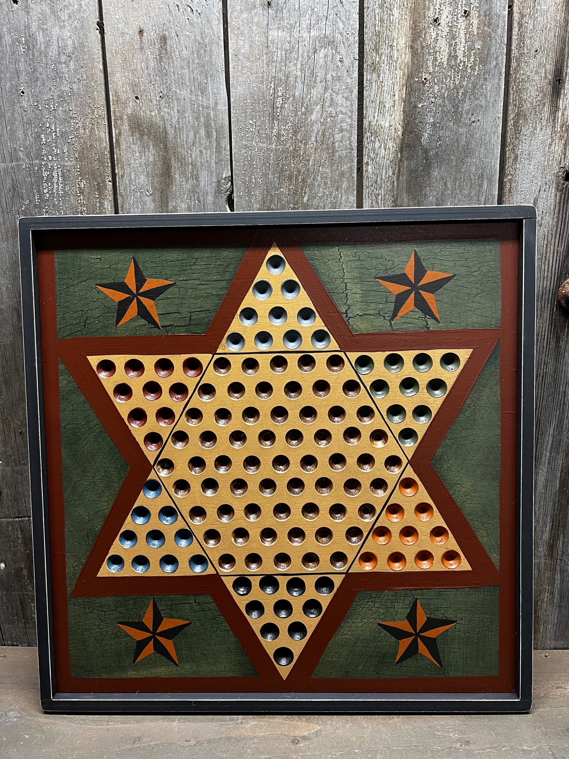 Made in PA. Each board is hand-crafted and hand-painted on wood, using milk paints, acrylics or oils. The game is antiqued and varnished to protect the painting and allow the board to be used and passed on to future generations. Some designs are Reproduction and the Folk Art style are original to the crafter. Chinese Checkers come with marbles in a Homespun sack and directions. This board measures 17.5" x 17.5" and has a slot for hanging.