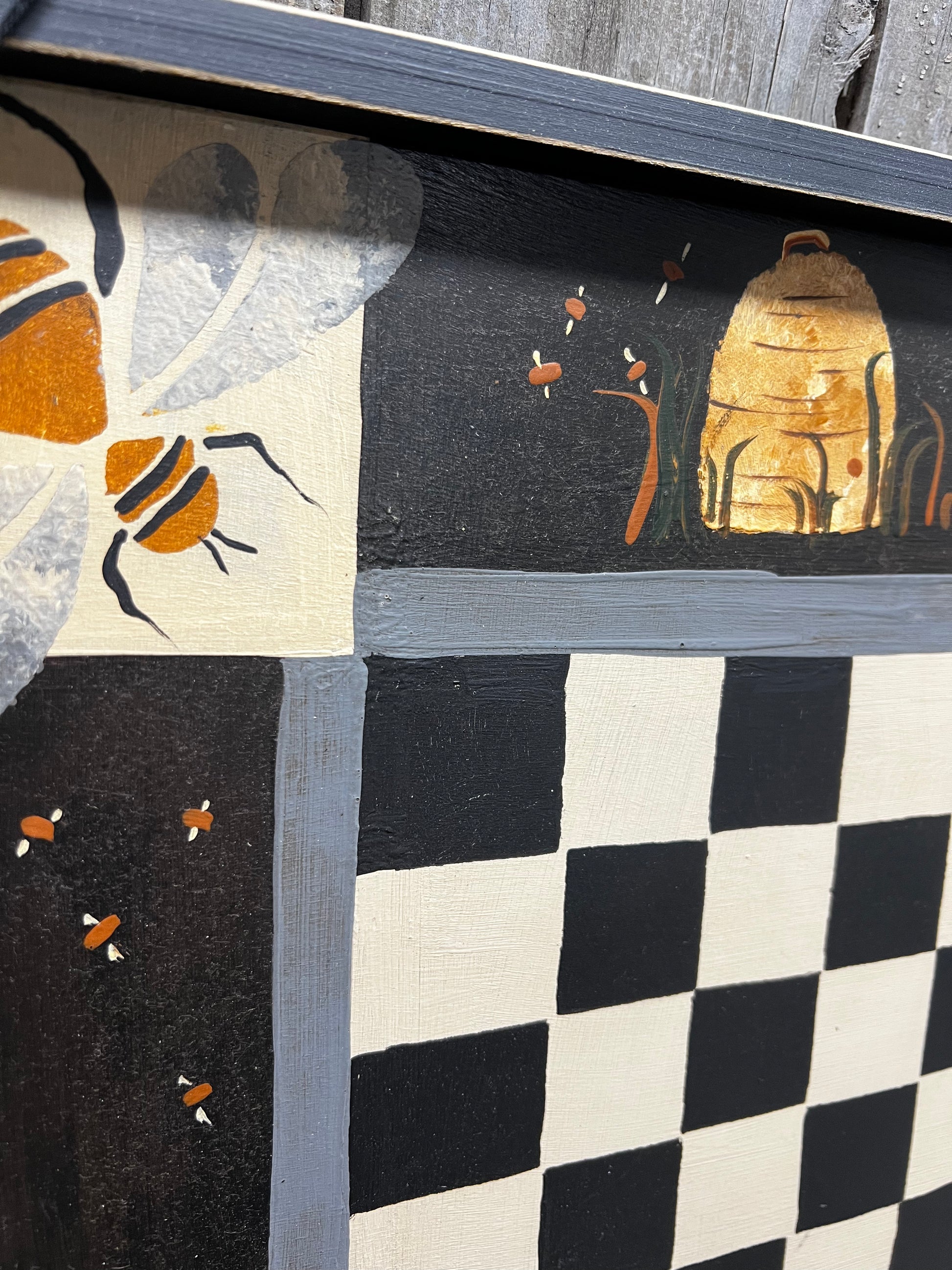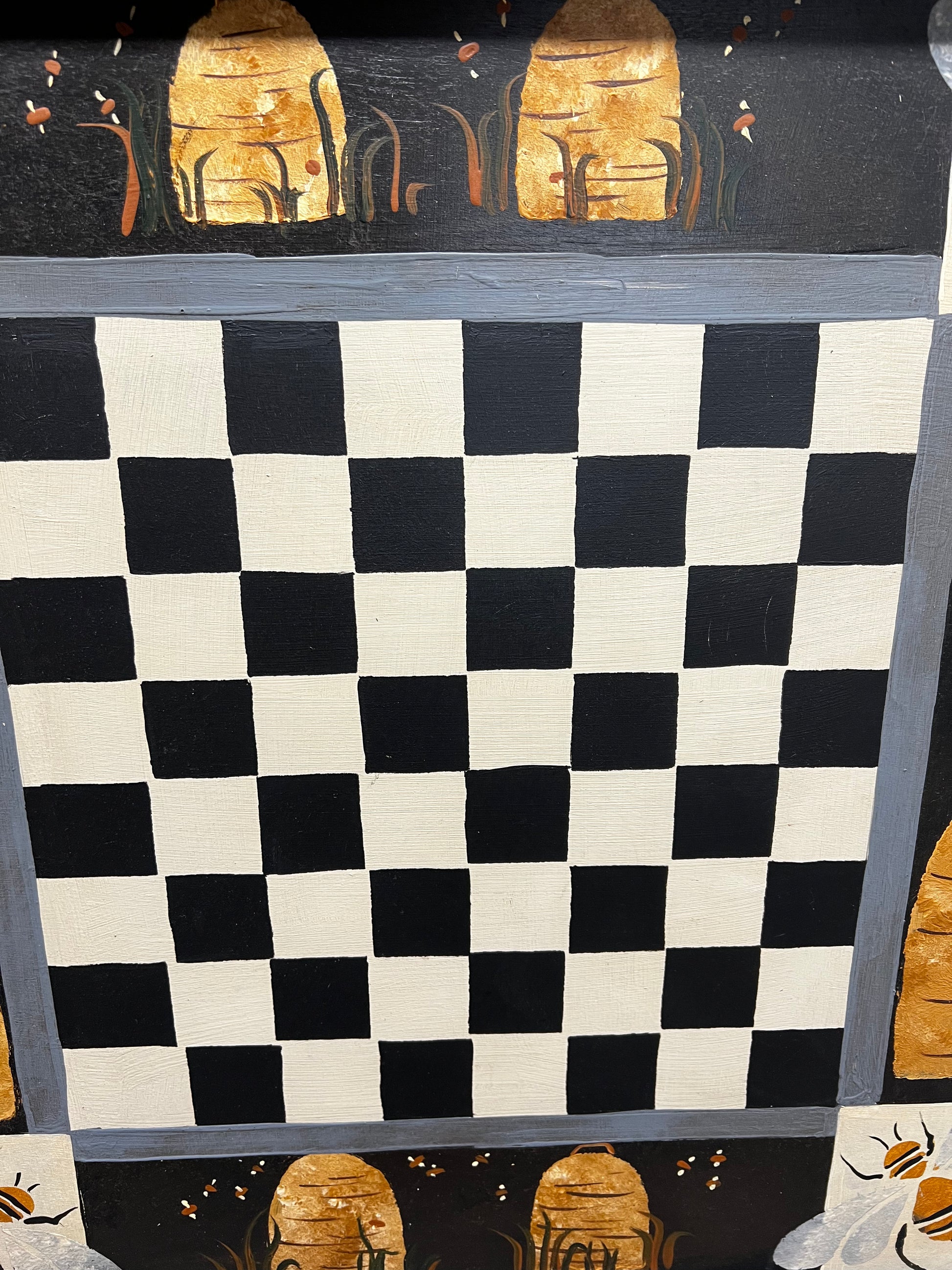 Made in PA. Each board is hand-crafted and hand-painted on wood, using milk paints, acrylics or oils. The game is antiqued and varnished to protect the painting and allow the board to be used and passed on to future generations. Some designs are Reproduction and the Folk Art style are original to the crafter. Checkers comes with wooden playing pieces and directions. This board measures 17.5" x 17.5" and has a slot for hanging.