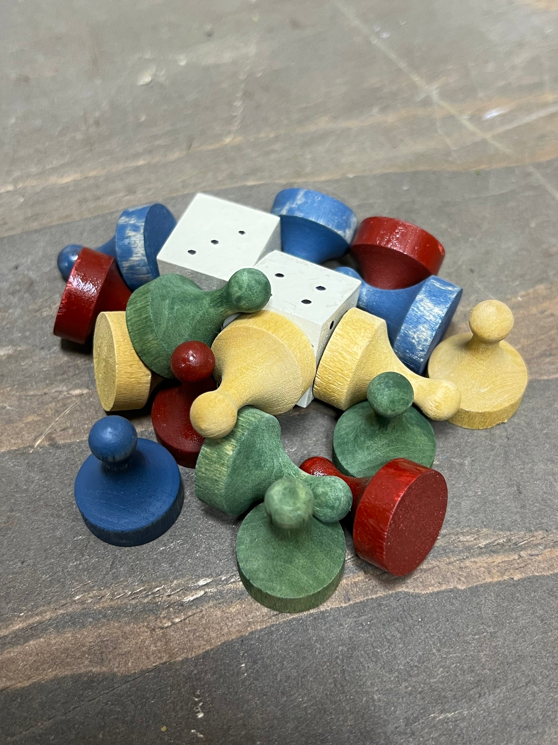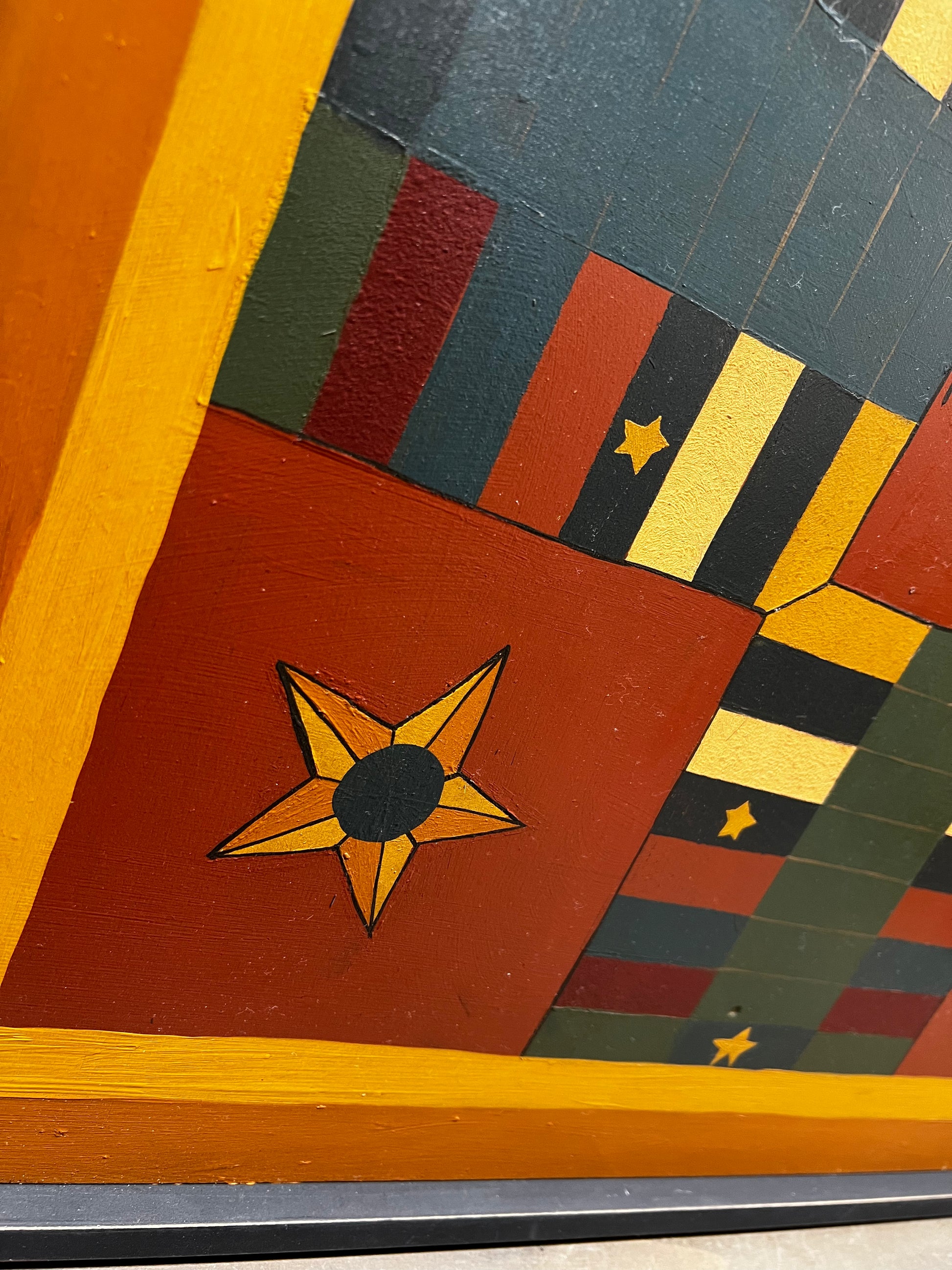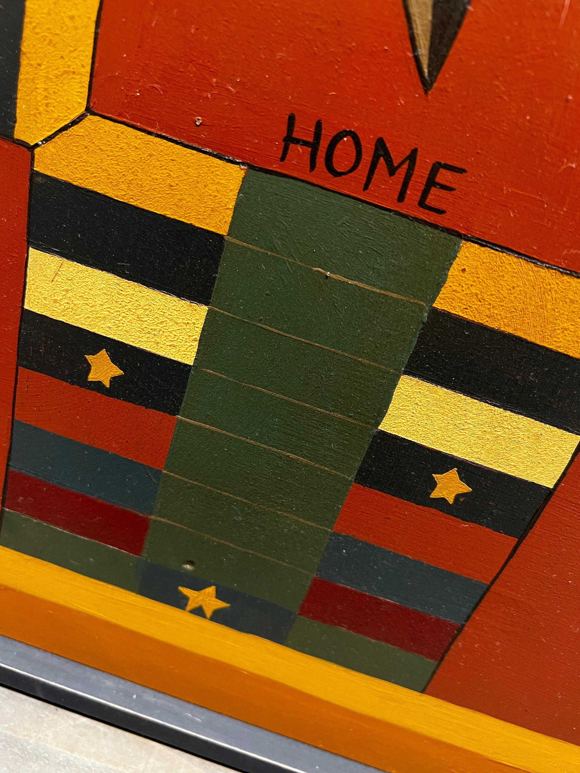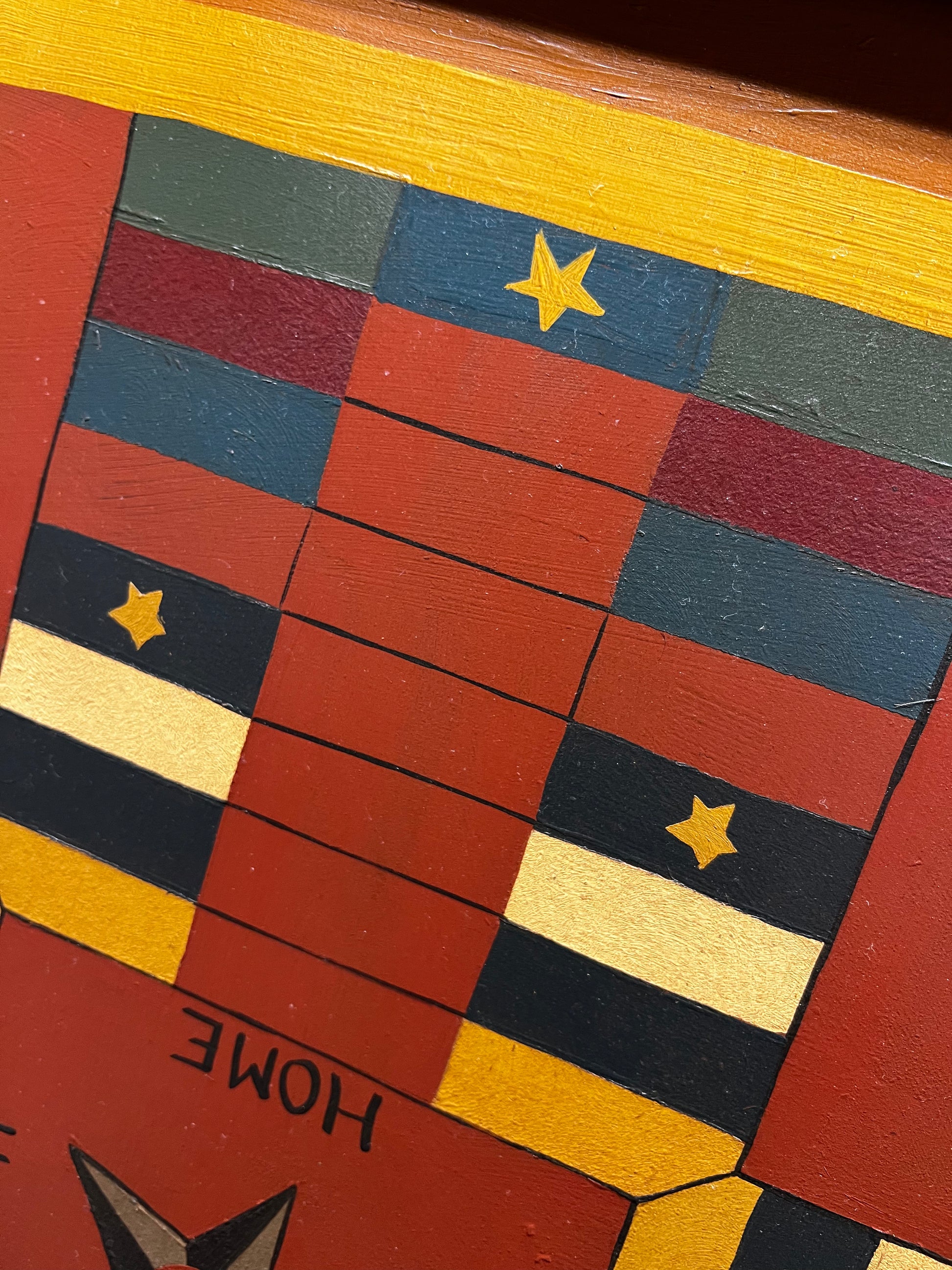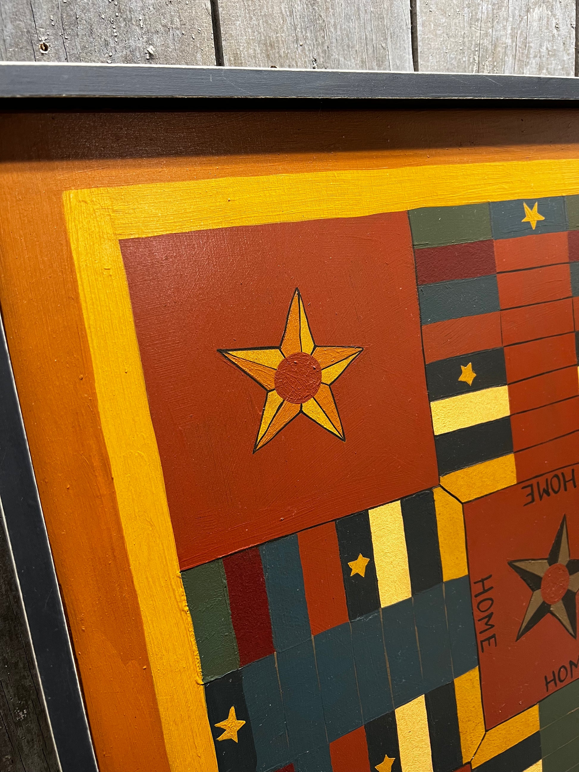 Made in PA. Each board is hand-crafted and hand-painted on wood, using milk paints, acrylics or oils. The game is antiqued and varnished to protect the painting and allow the board to be used and passed on to future generations. Some designs are Reproduction and the Folk Art style are original to the crafter. Parcheesi comes with wooden playing pieces and dice in a Homespun sack and directions. This board measures 21" x 21" and has a slot for hanging.