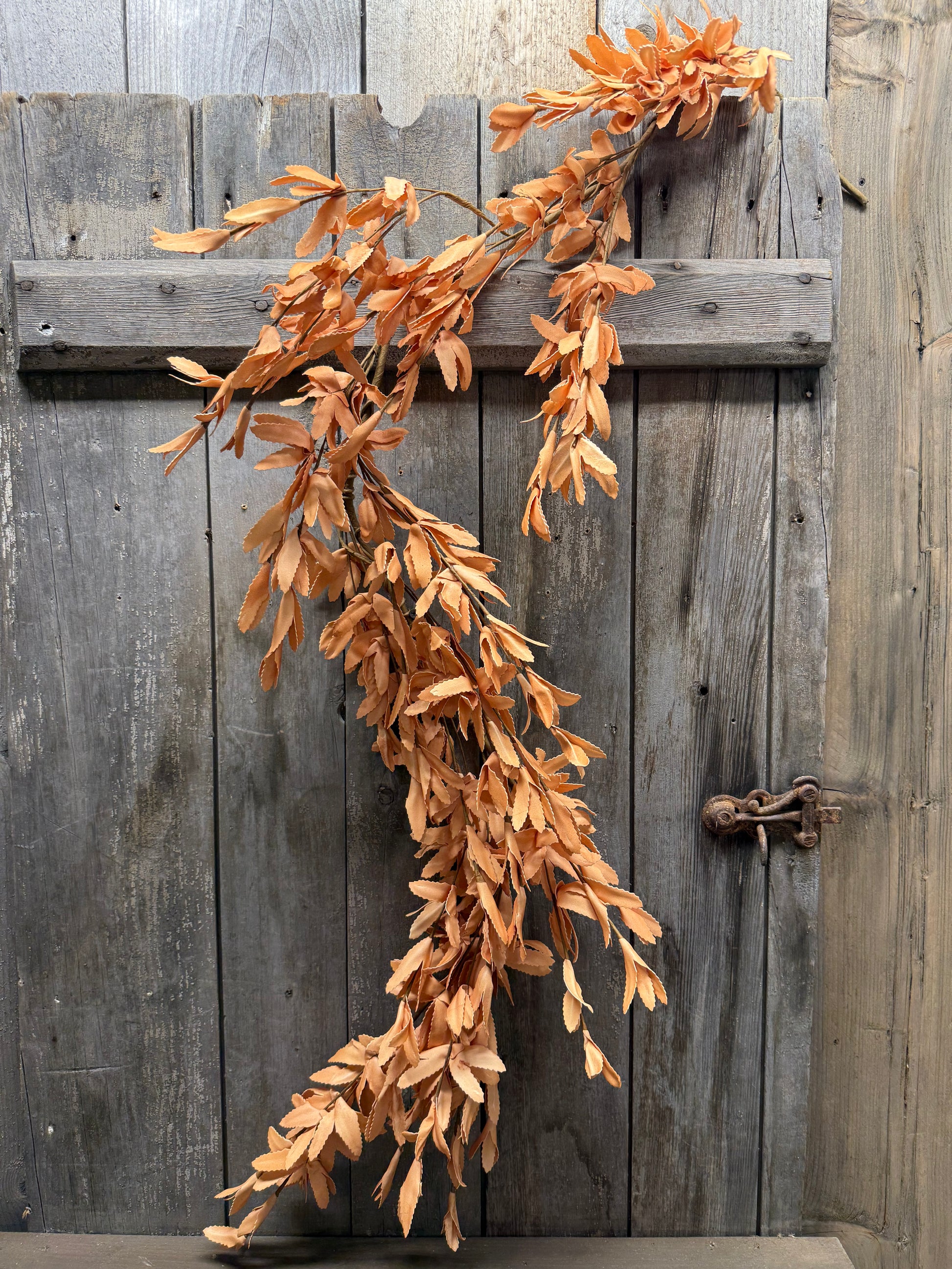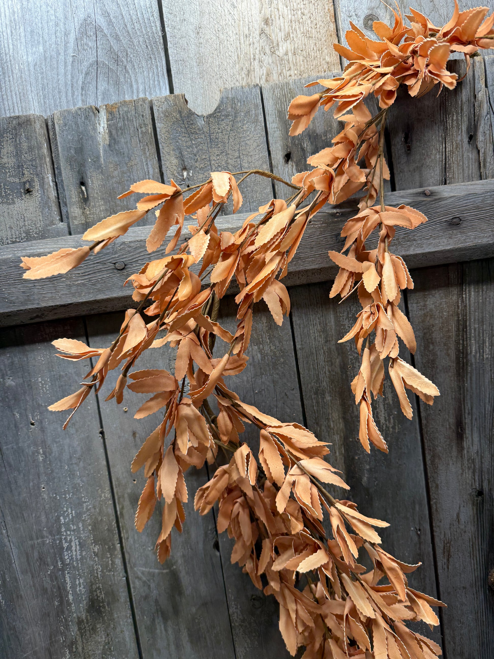 The look of dried leaves in a 5' garland. The "foam" leaves have a sun dried, tea stained look. Wired base so it is easy to bend, drape and pose! Measures 5' long.