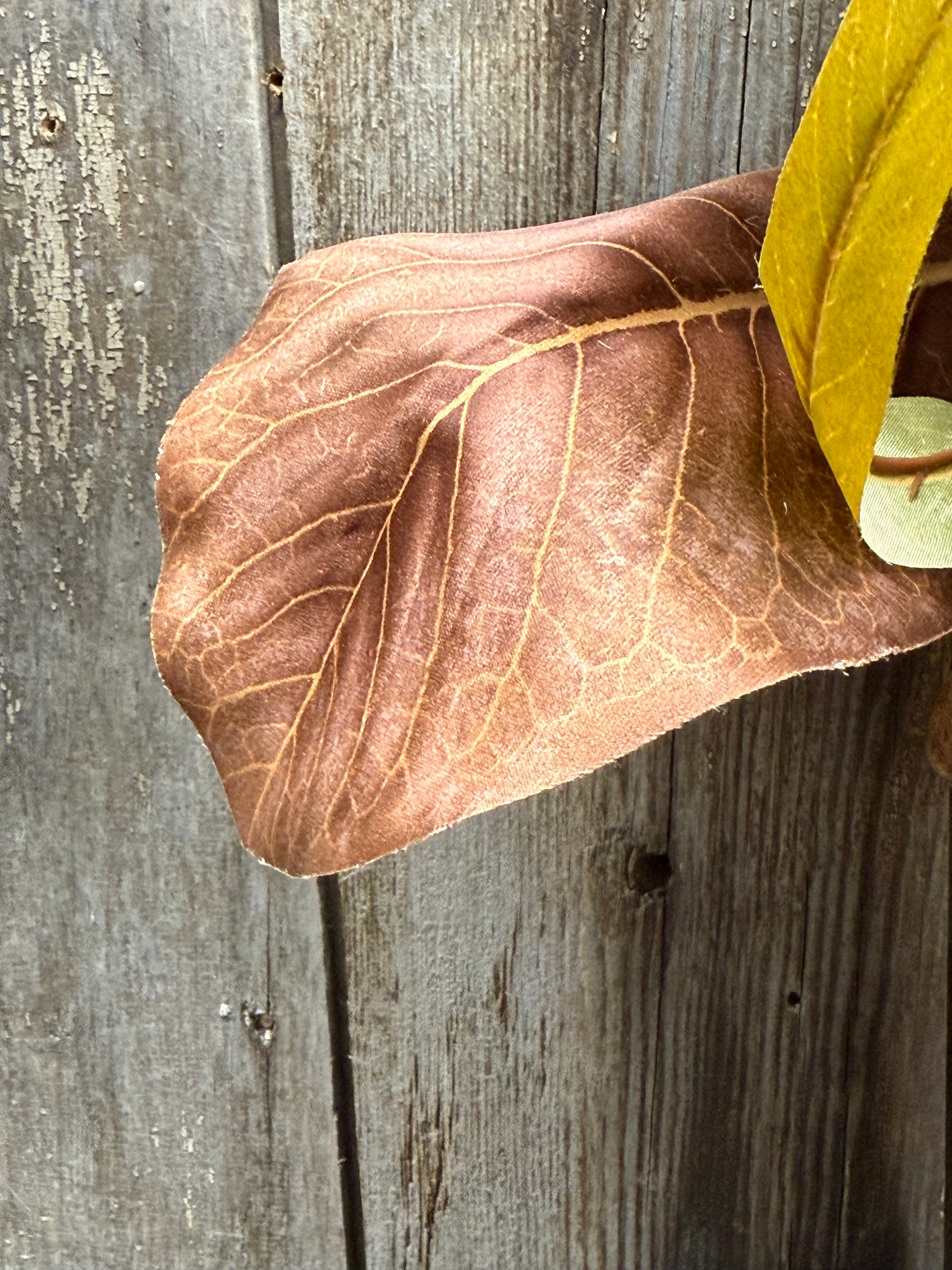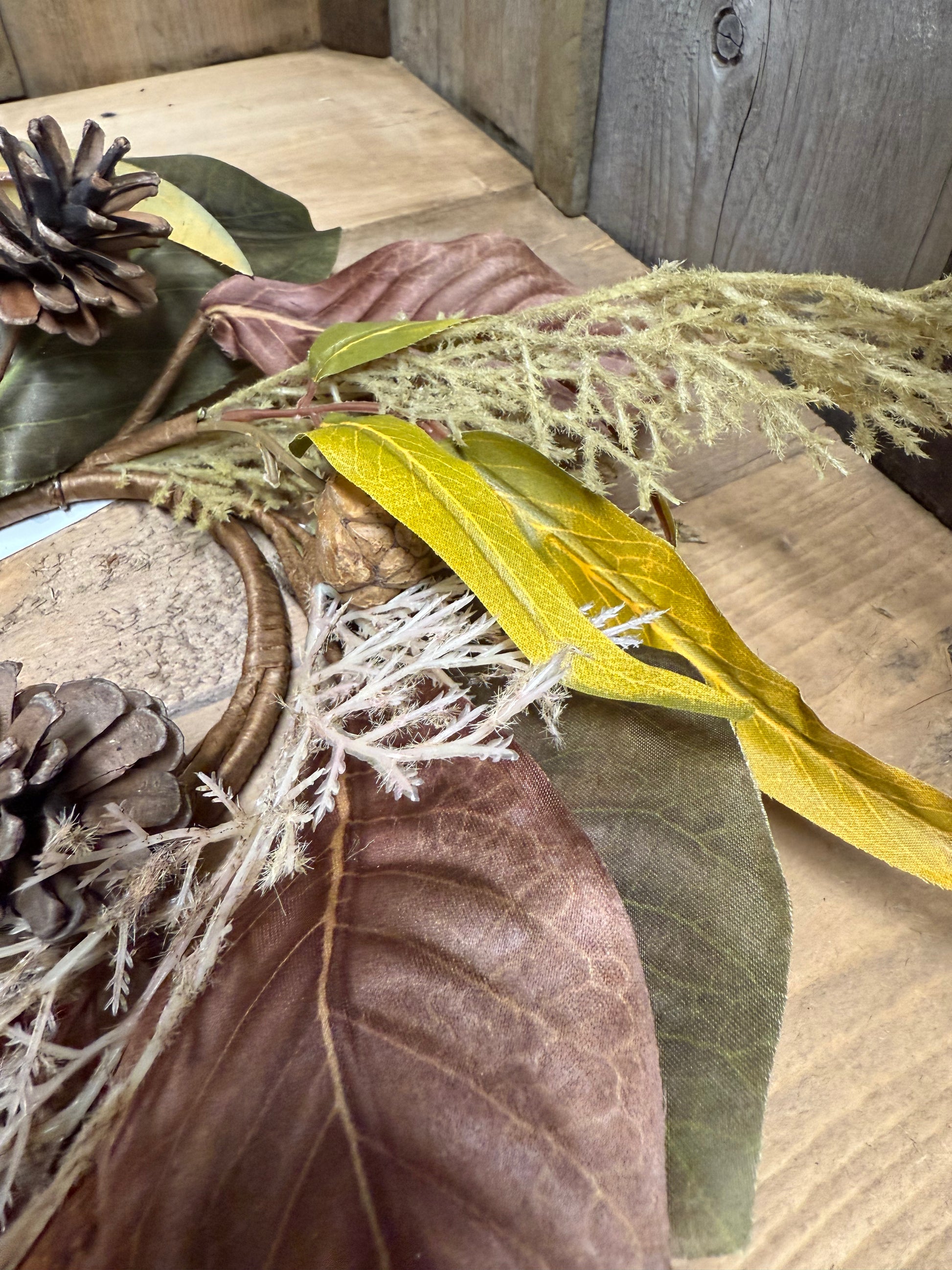 Stunner! Our Candle Ring is full of wired Magnolia leaves in drab Autumn shades, pinecones and pods, flocked leaves and wispy leaves. The inner ring measures 4" and it is easily 16" overall. Most pieces are wired so you can make them stay where you want them to. Pictures don't do it justice! Candle Ring only….candle sold separately.