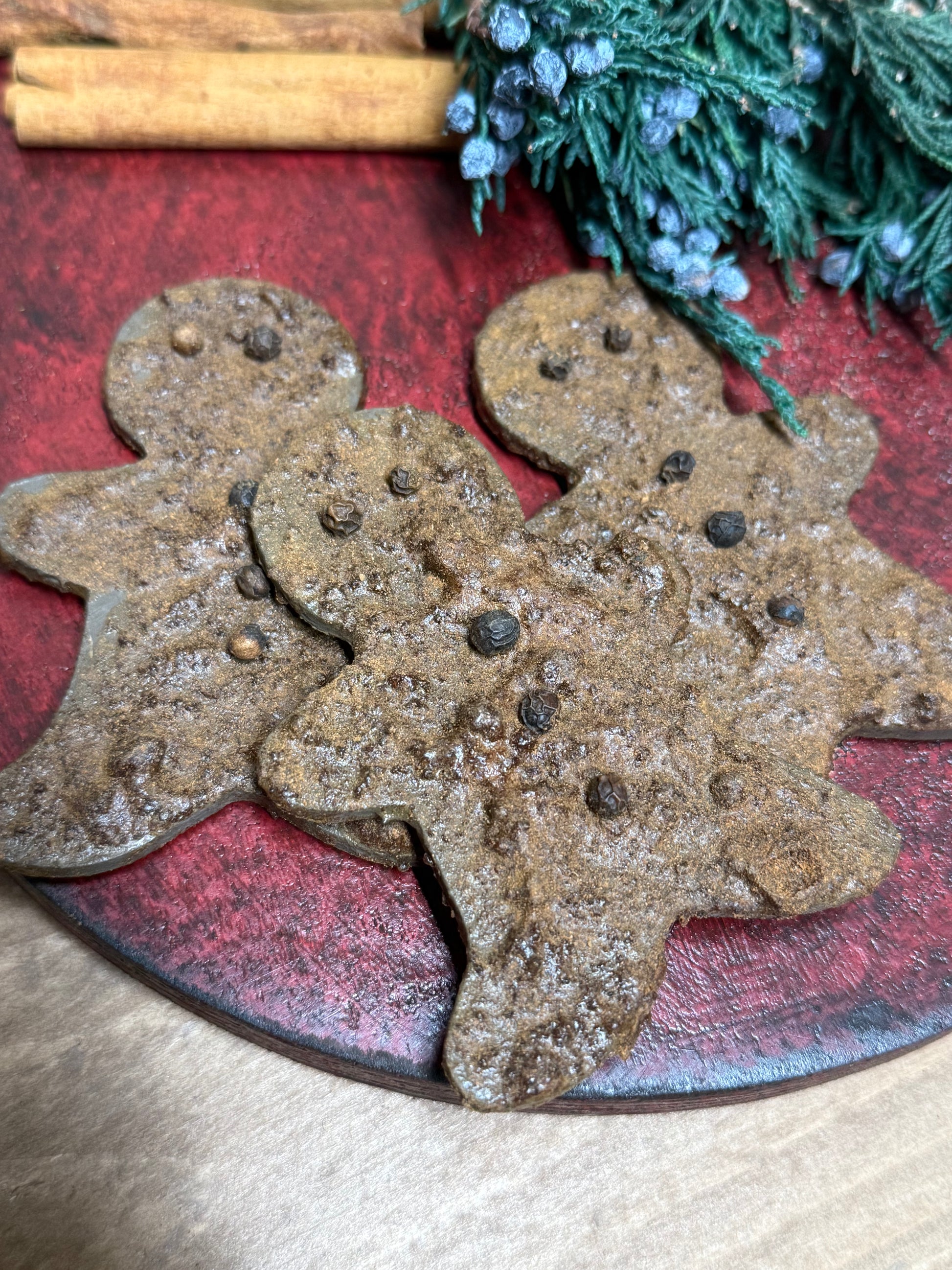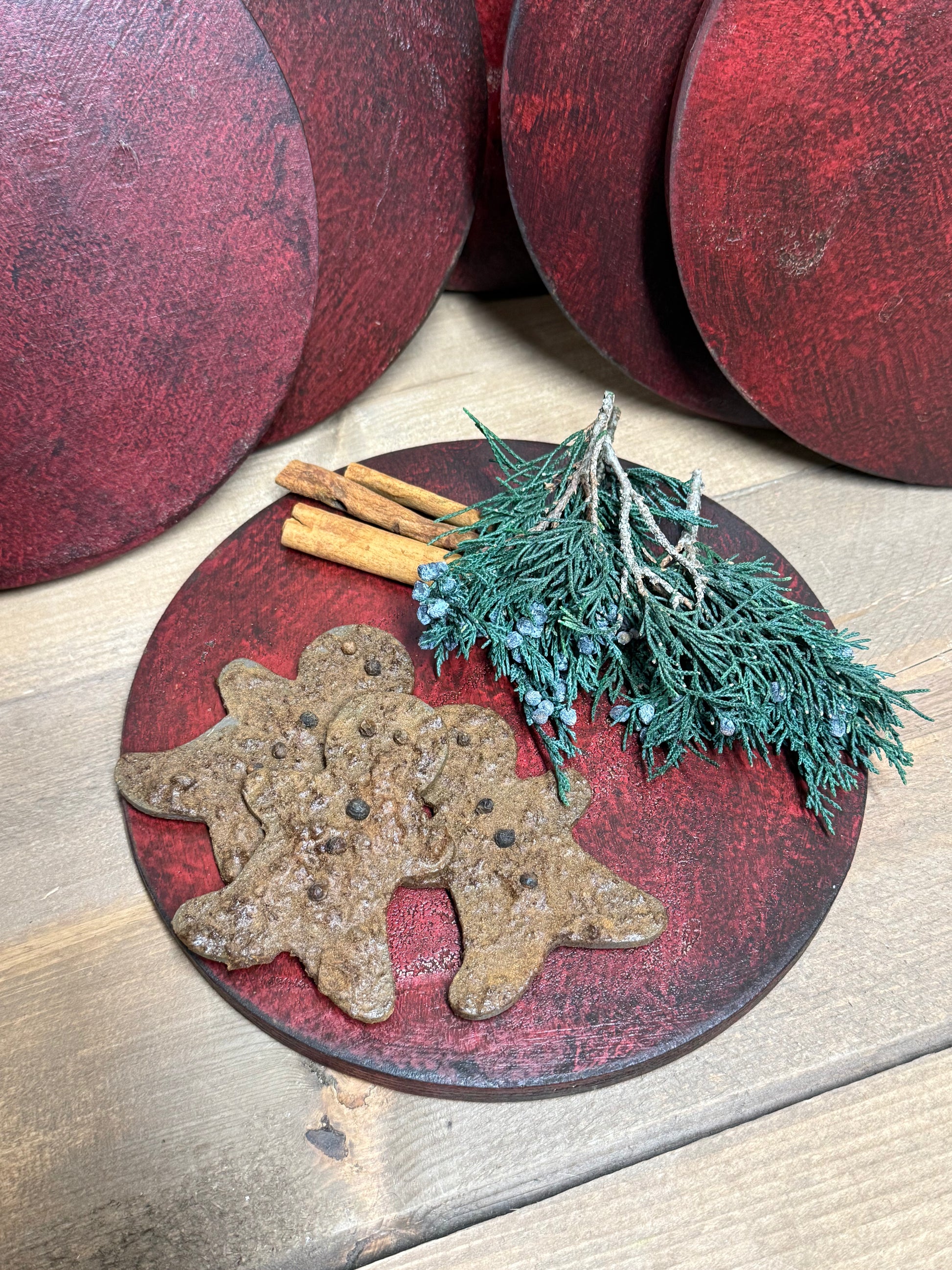 Our "treat" plate is full of Preserved Juniper, Cinnamon Sticks and 3 of our grungy Primitive Gingerbread men. Each plate and gingerbread man is done by hand so expect variations. Keep in mind we do our best to attach the peppercorn eyes and buttons but you may need a spot of glue after shipping.