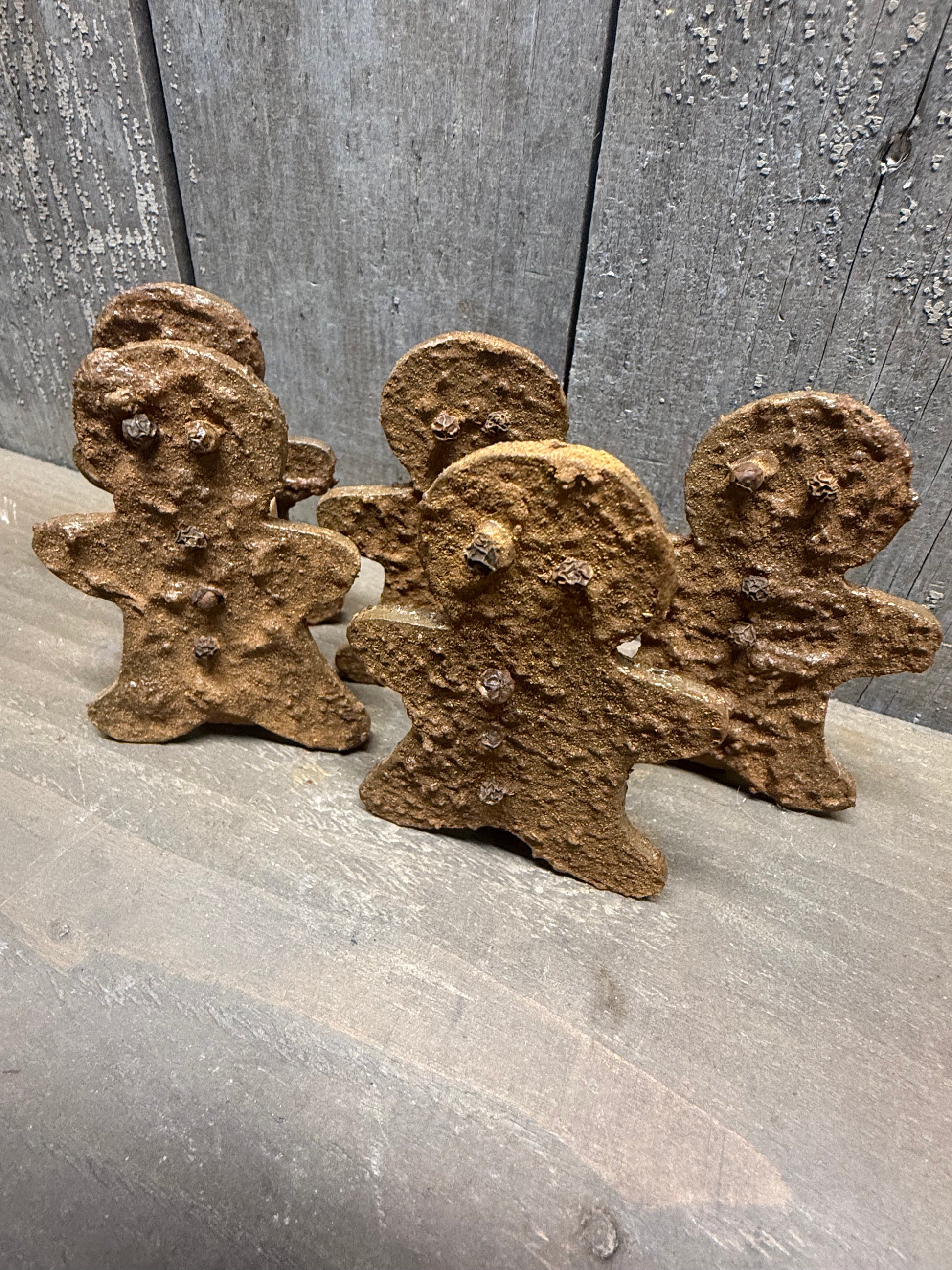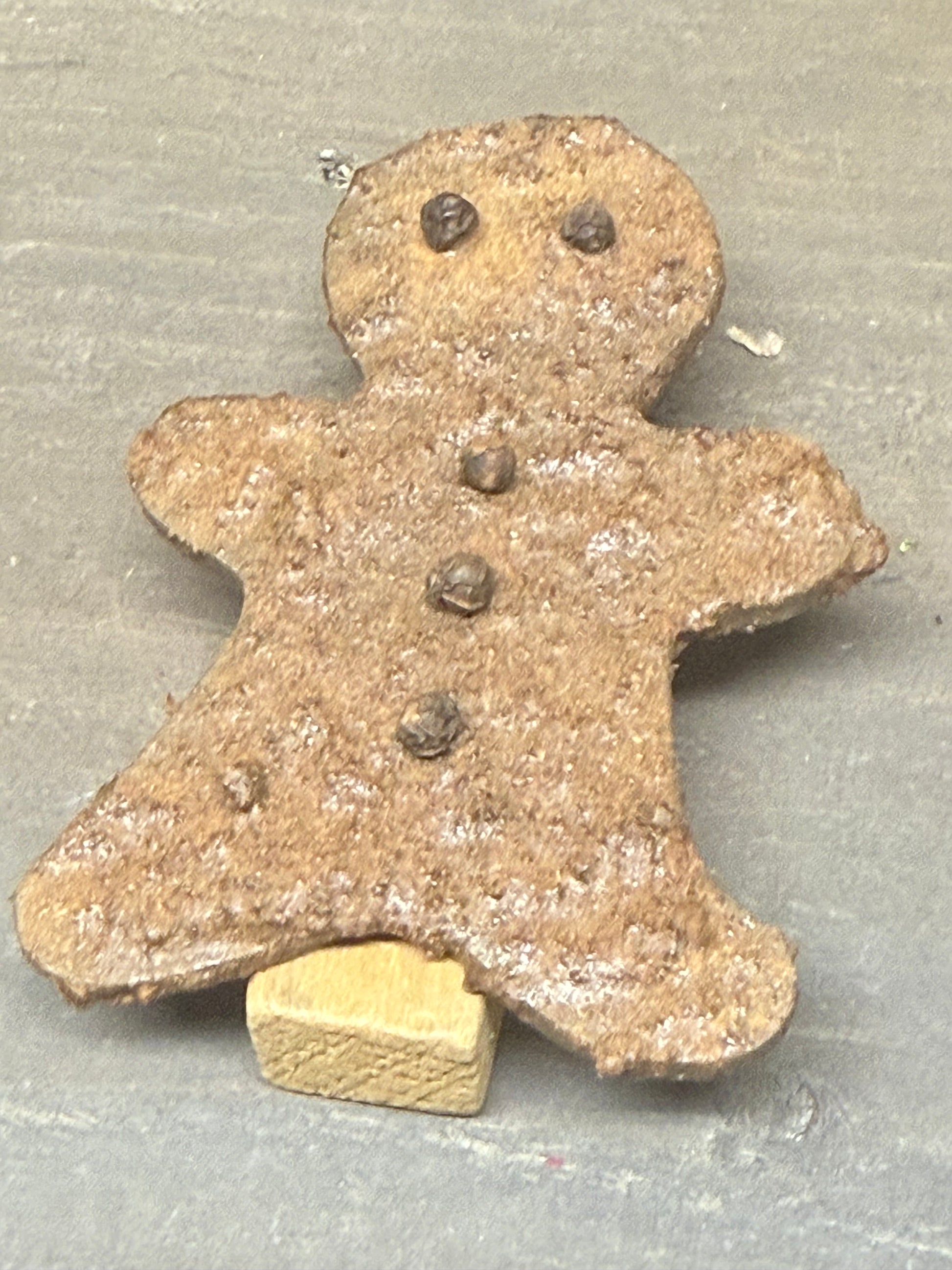 Our Maine cut wood Gingerbread men are super textured with lumps and bumps; cinnamon, spices and peppercorn eyes. Each measures 3.5"x 2.25" and is attached to a vintage toy block. ***** We use the best glue we can to make sure the eyes and buttons stay attached but shipping my cause you to need to re glue.*****