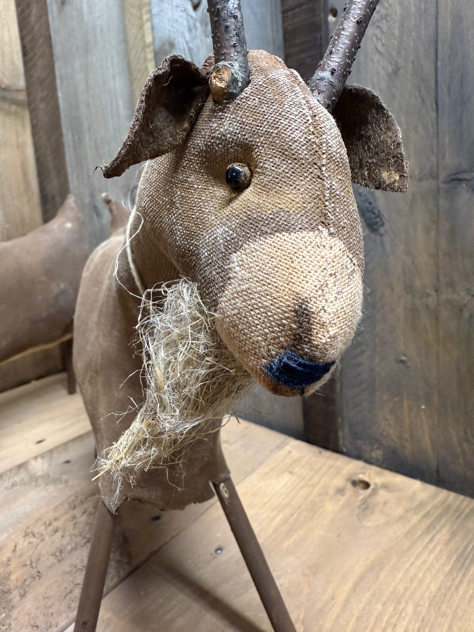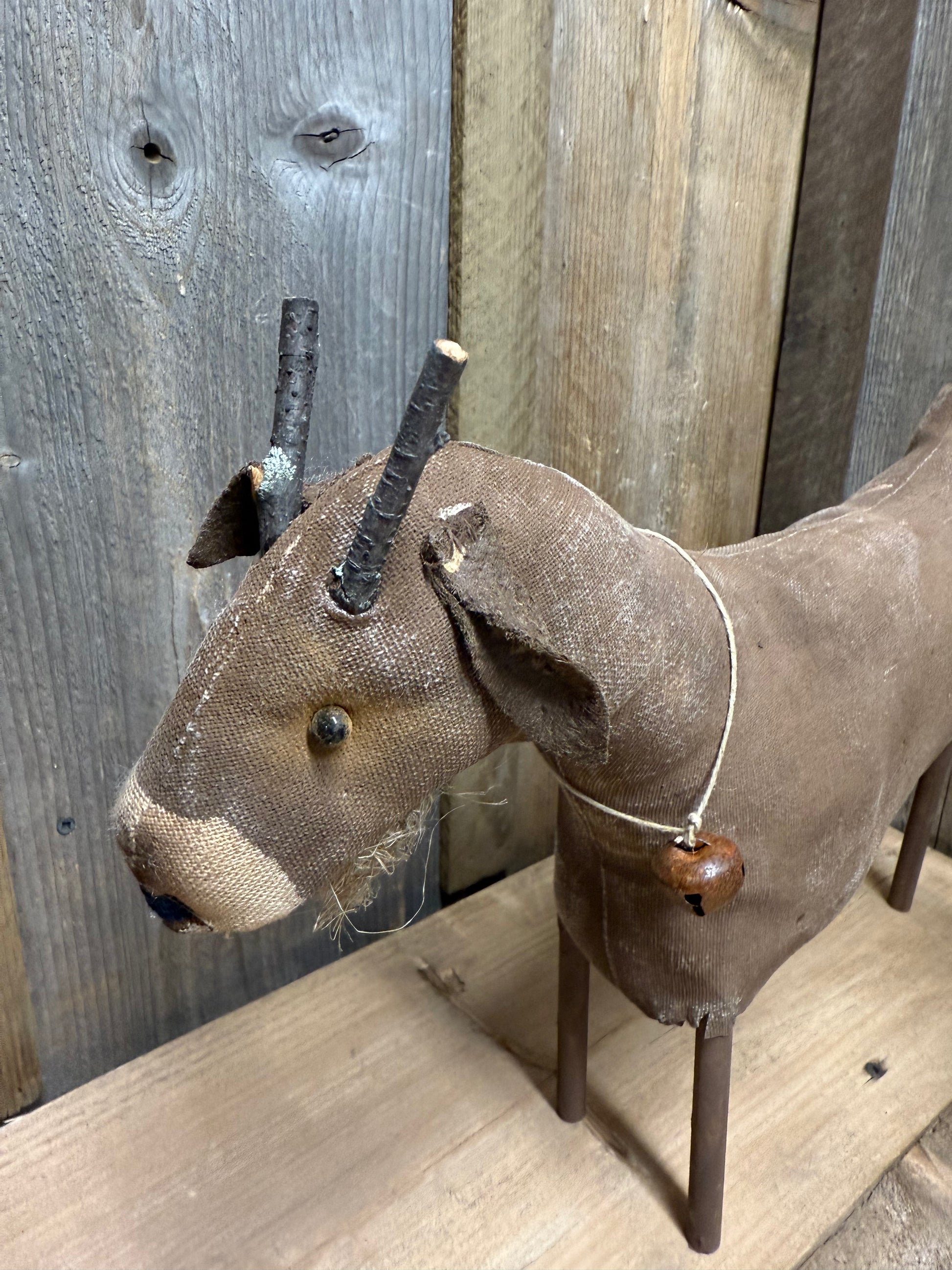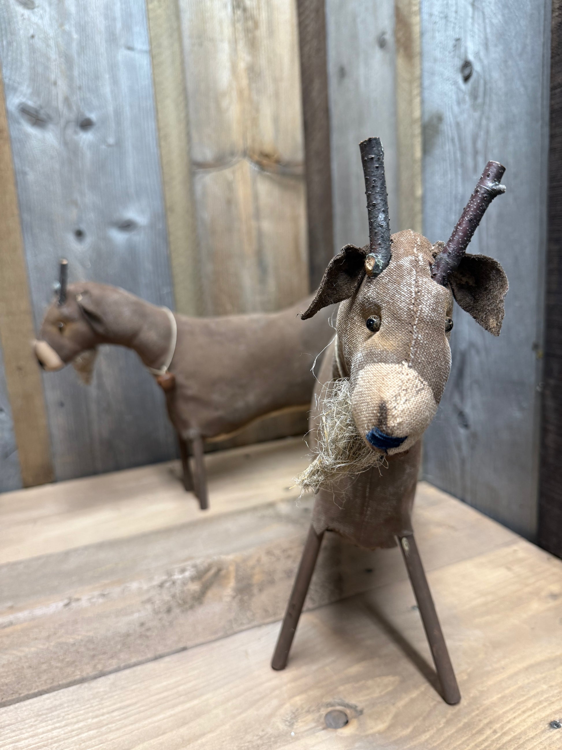 Handmade and oh so fun! Billy Goat measures roughly 13" x 11" and has 4 wooden dowel legs. He is made from muslin that has been painted and sanded. You may need to work with his legs to get him to stand the way you would like. I have 2 similar.