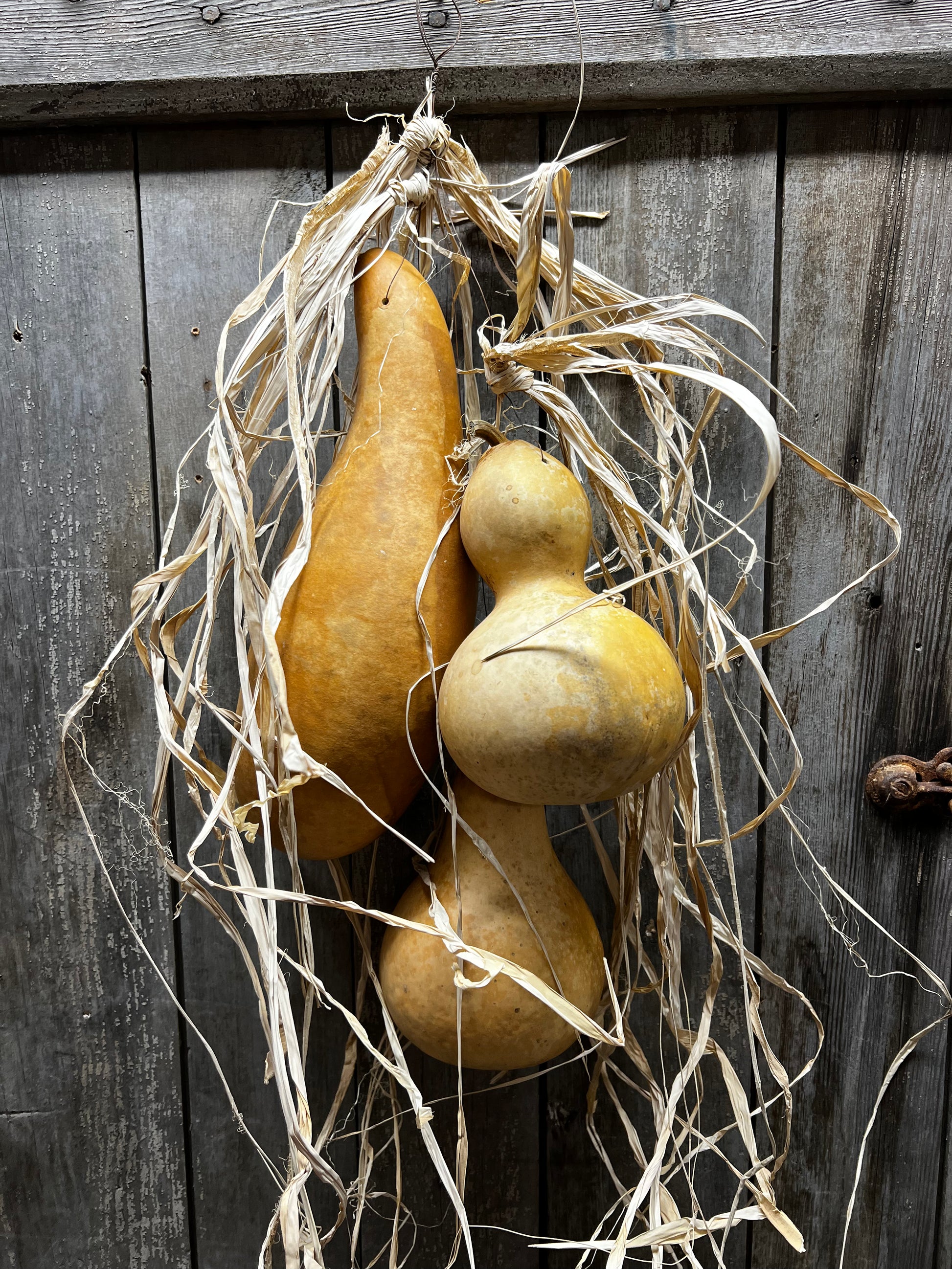 Our gourd bundles are made with 3 medium size gourds and raffia making it perfect for just about any spot. Hang on a door and add bittersweet or display on a peg or even a bed post. Tied with rusty wire.