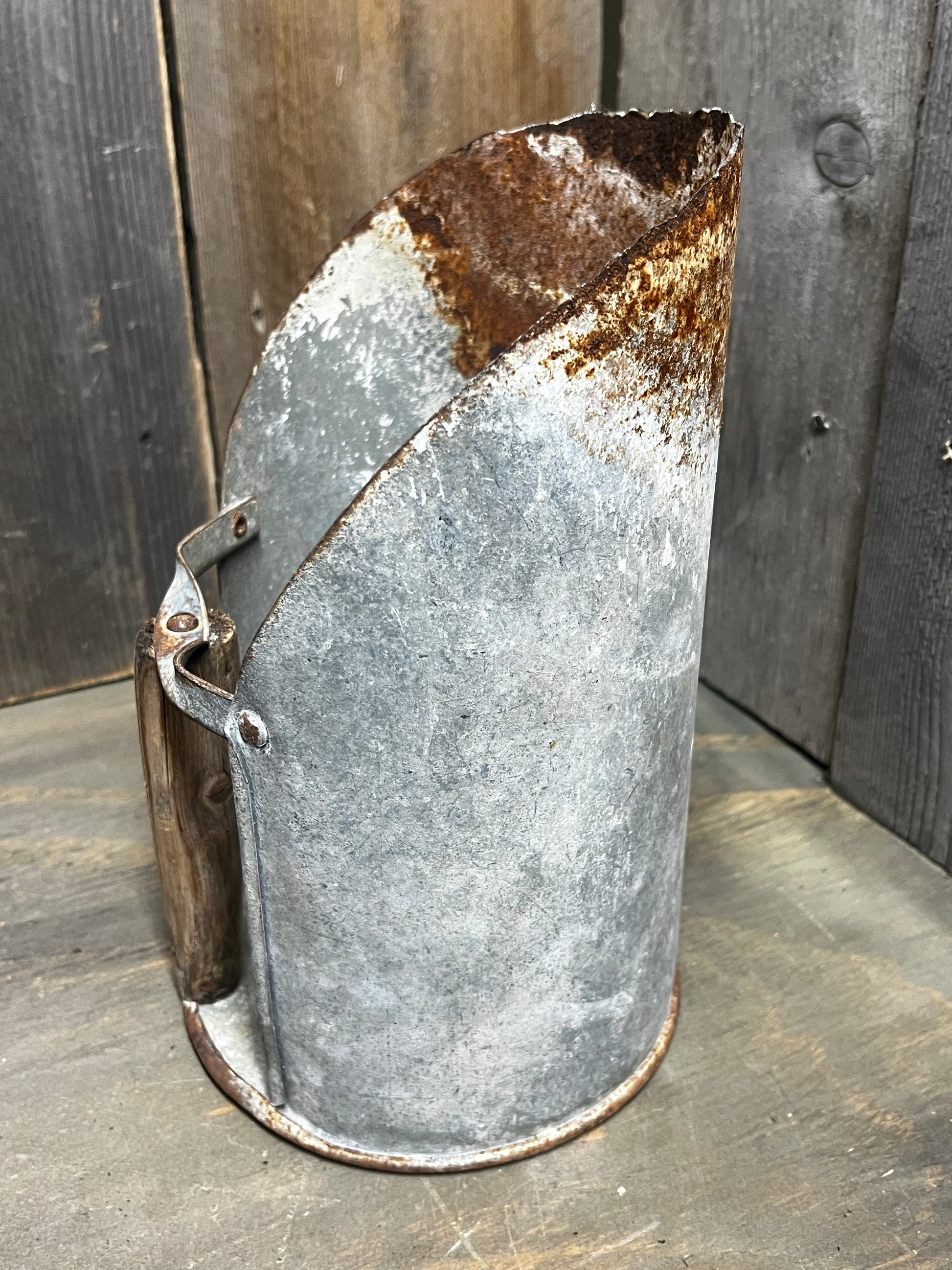 Grain Scoops! A must have for decorating; so many ways to display. Add a Battery Pillar Candle or even a Black Crow Candle, fill it with greens or scraps of fabric or display on its own. These are old scoops that has been used and shows wear and tear; both have wooden handles adding to the charm. One scoop has much more rust around the top; order accordingly. Shown decorated with baby grass and a candle sold separately.