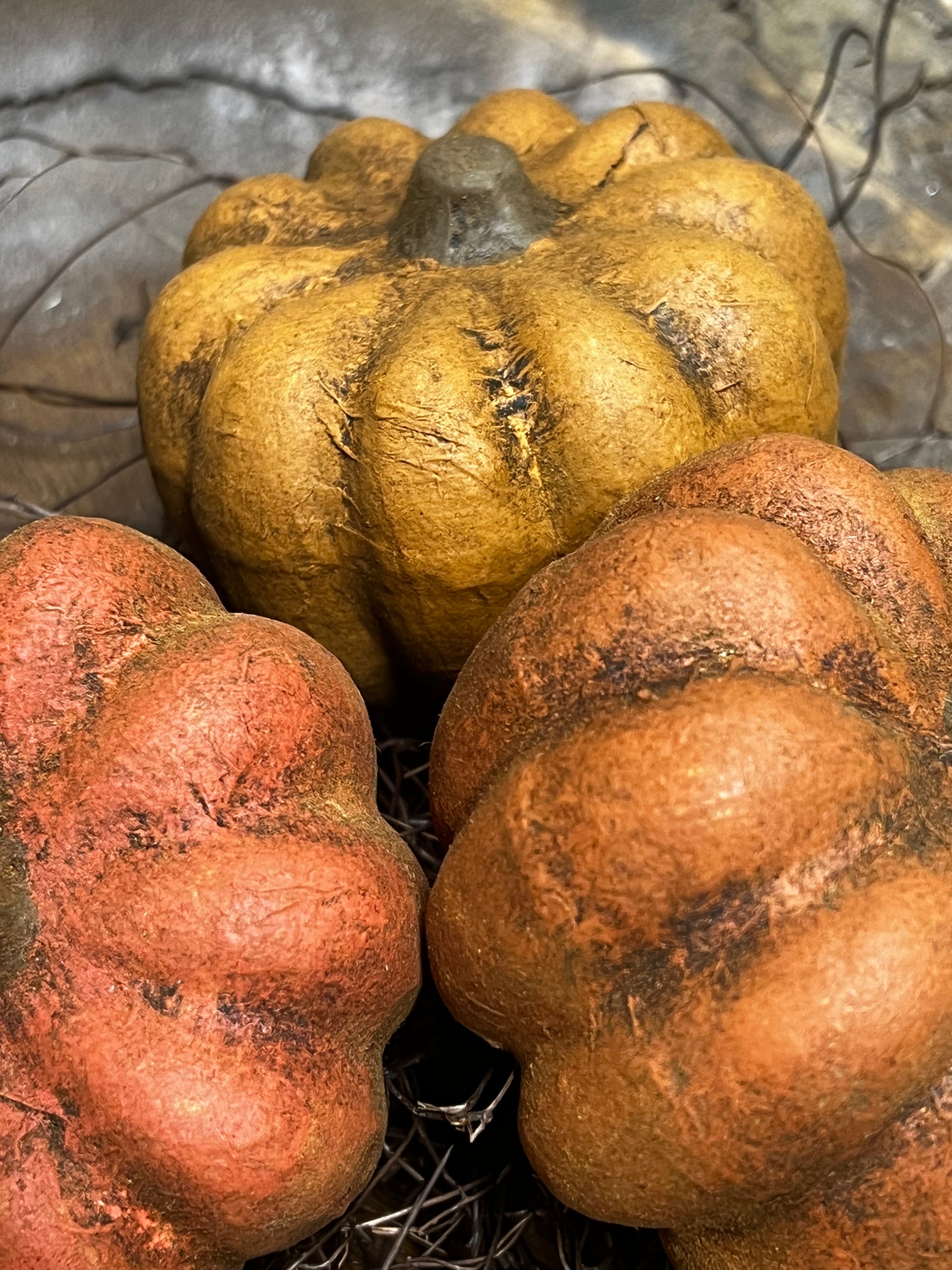 Oh, how fun! A lovely mix of 3.25" x 2.5" paper mache pumpkins that we painted, waxed and dusted with cinnamon. Comes with angel hair. You will get a set of 3. ***Colors are more muted and drab than shown***