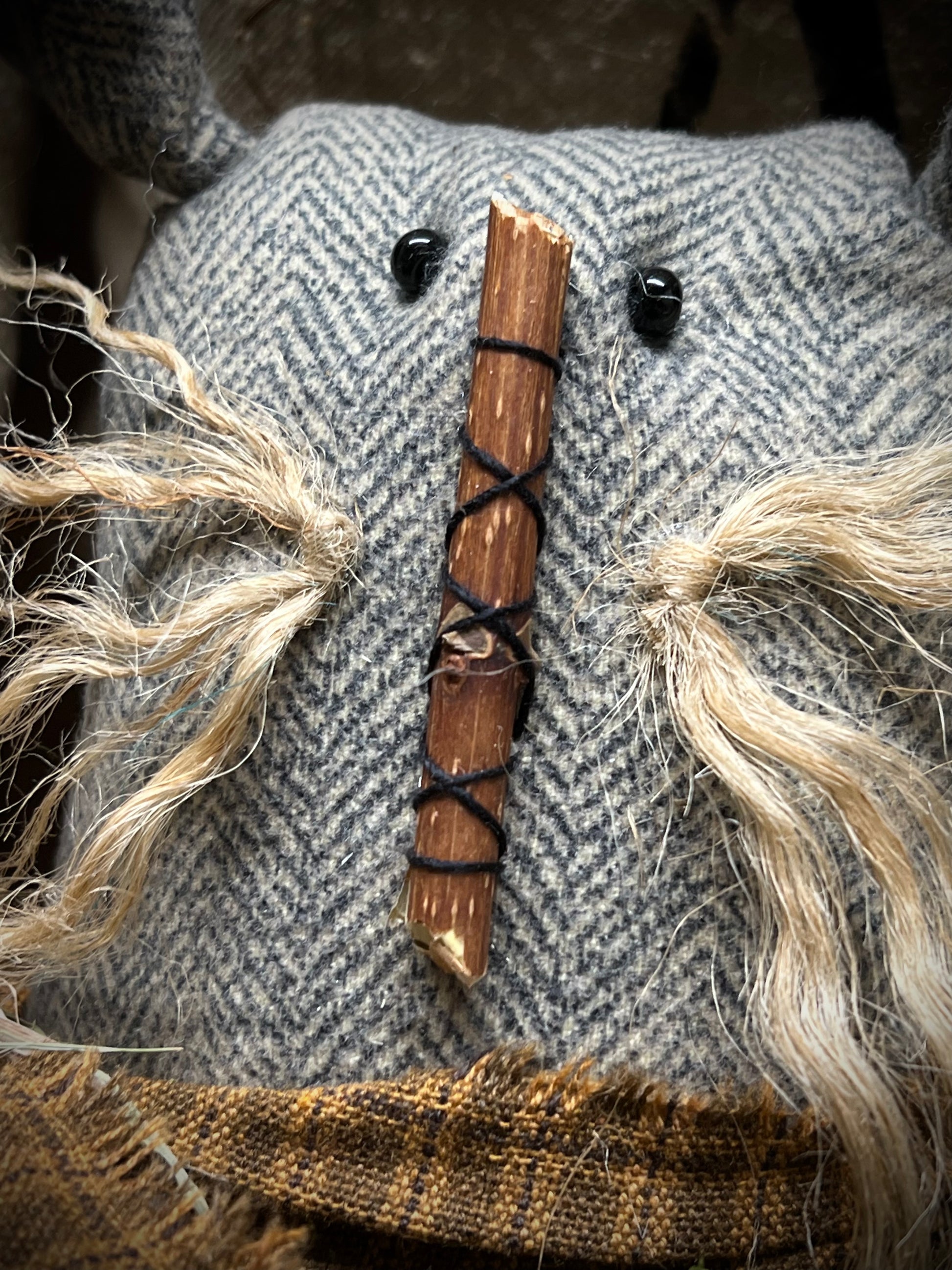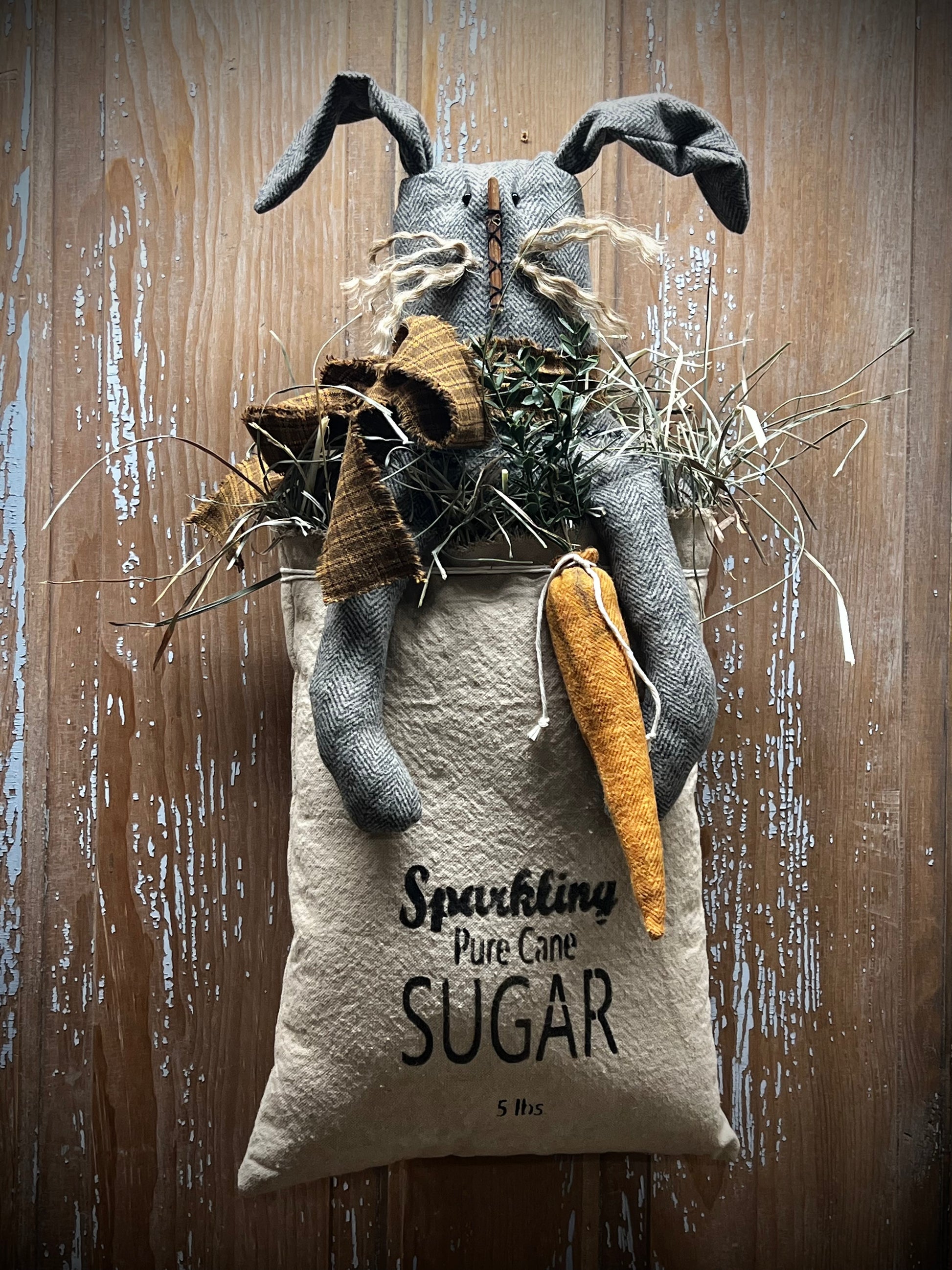 Now, Feed Sack Frank is a sweet rabbit! Just look at that face peeking out of our hand created stenciled sack. Frank is sewn from Herringbone Flannel, has wired ears so you can pose him how you like and is tucked into a stenciled sack, designed and made by us. Stuff with Poly Fil and topped with spring grass, he holds a carrot and our hearts! A twig nose is stitched and he has small button eyes. A homespun bow completes the look and doubles as a hanger. He also looks adorable propped on a chair or bench. He measures 18" tall and about 10" wide. Please note due to him being entirely hand crafted, each and every one, stenciled and sewn, may vary in size and look. However, we assure you, each is as cute and the next!