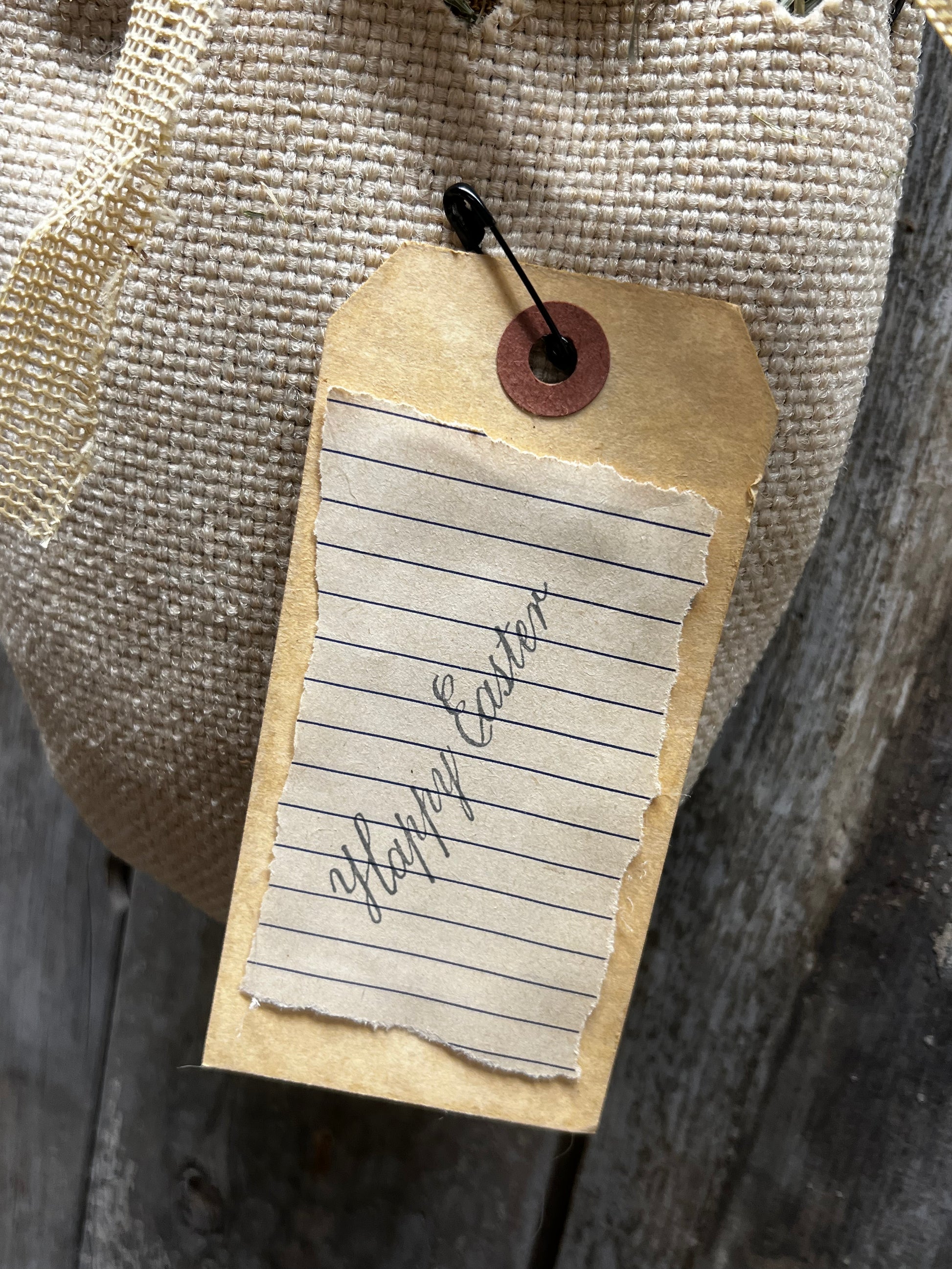Handcrafted and such a delight! The sweet little chick is nestled in a bed of sweet grass held by a burlap type egg. Measures 9" tall and 6.25" wide; handcrafted expect slight variations.