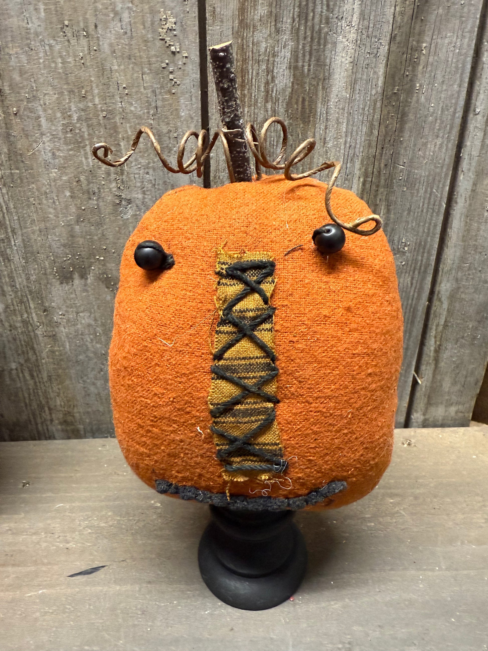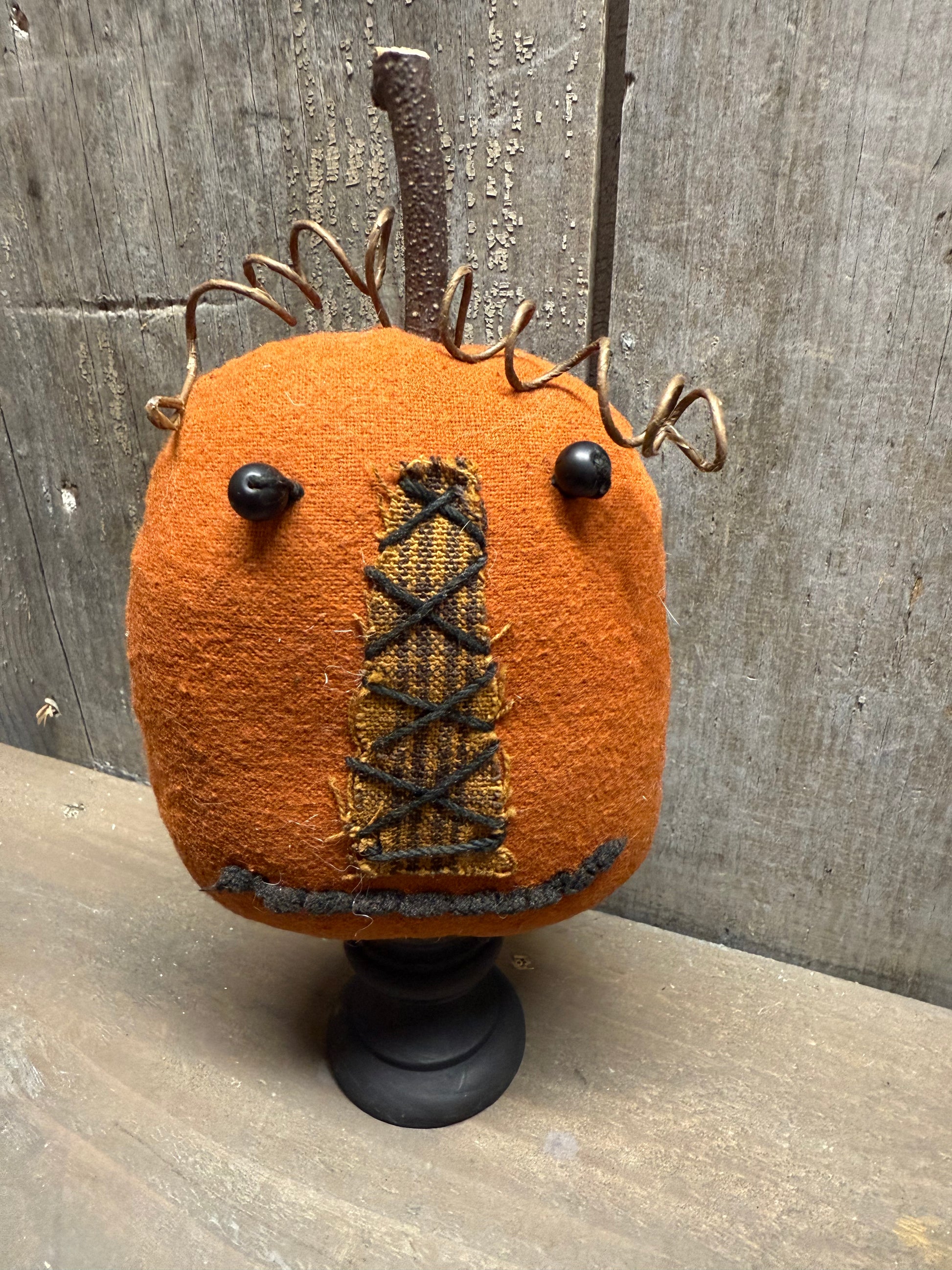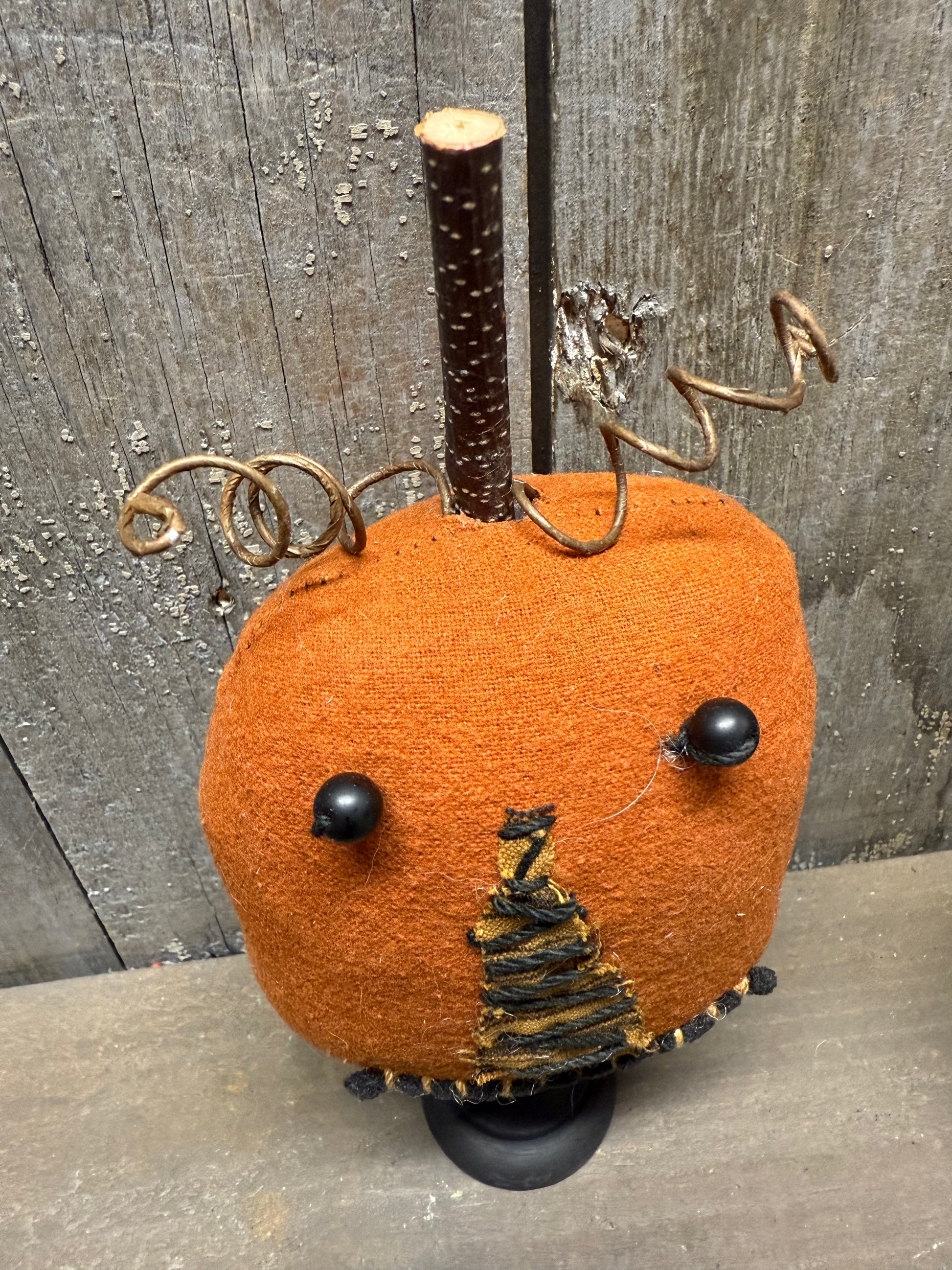 Flannel Jack on a wooden base, hand stitched face and a curly stem make for a Fall favorite. Each one is hand stitched so expect slight variations in fabric and expression. Made in PA