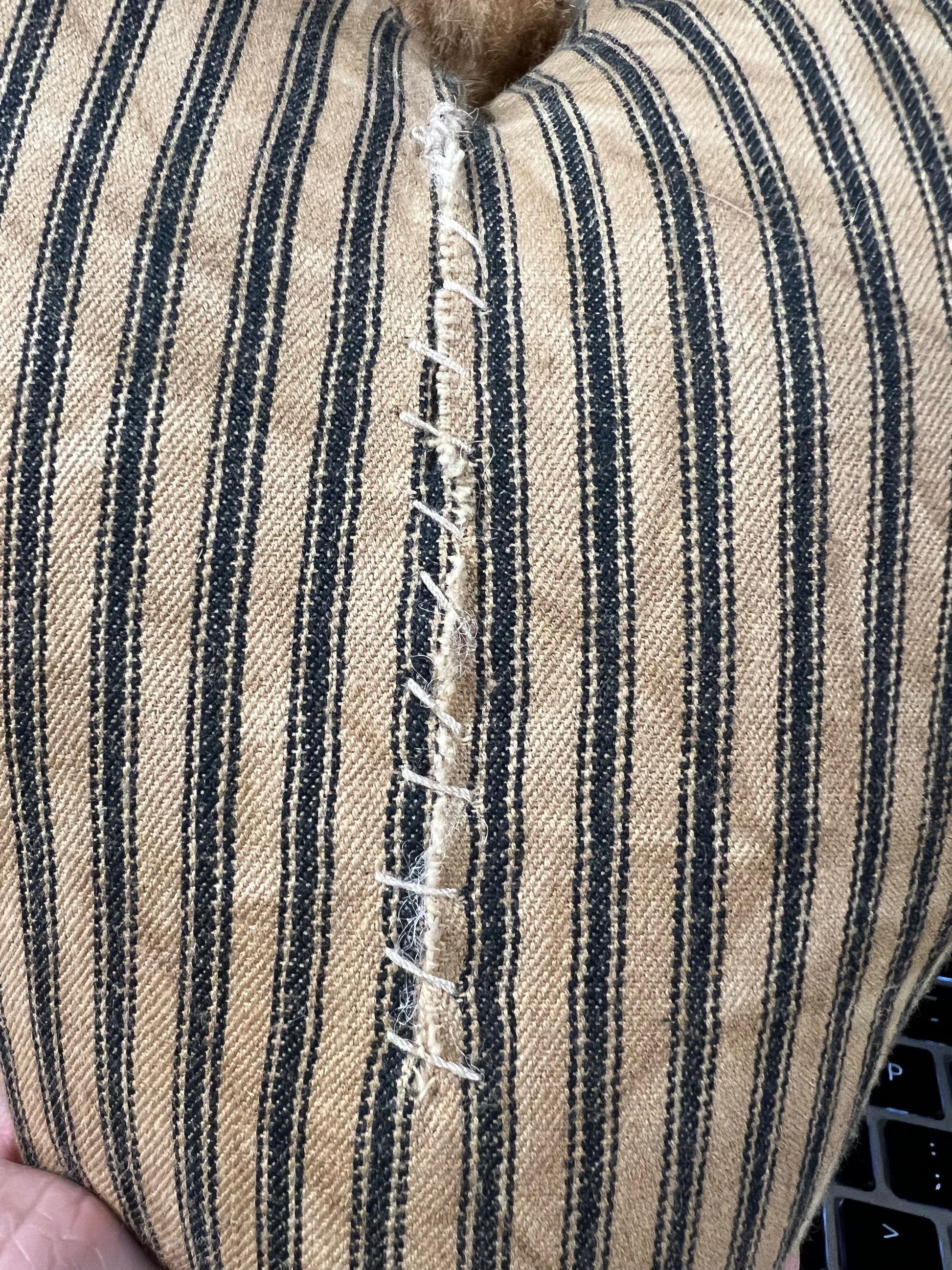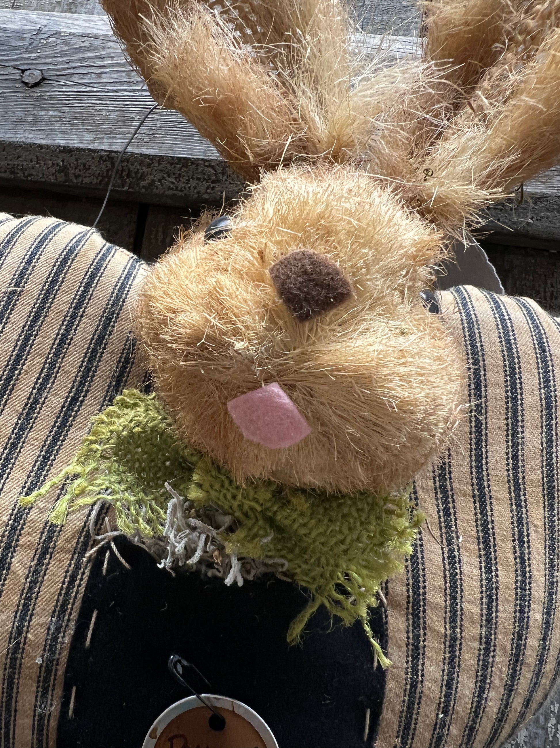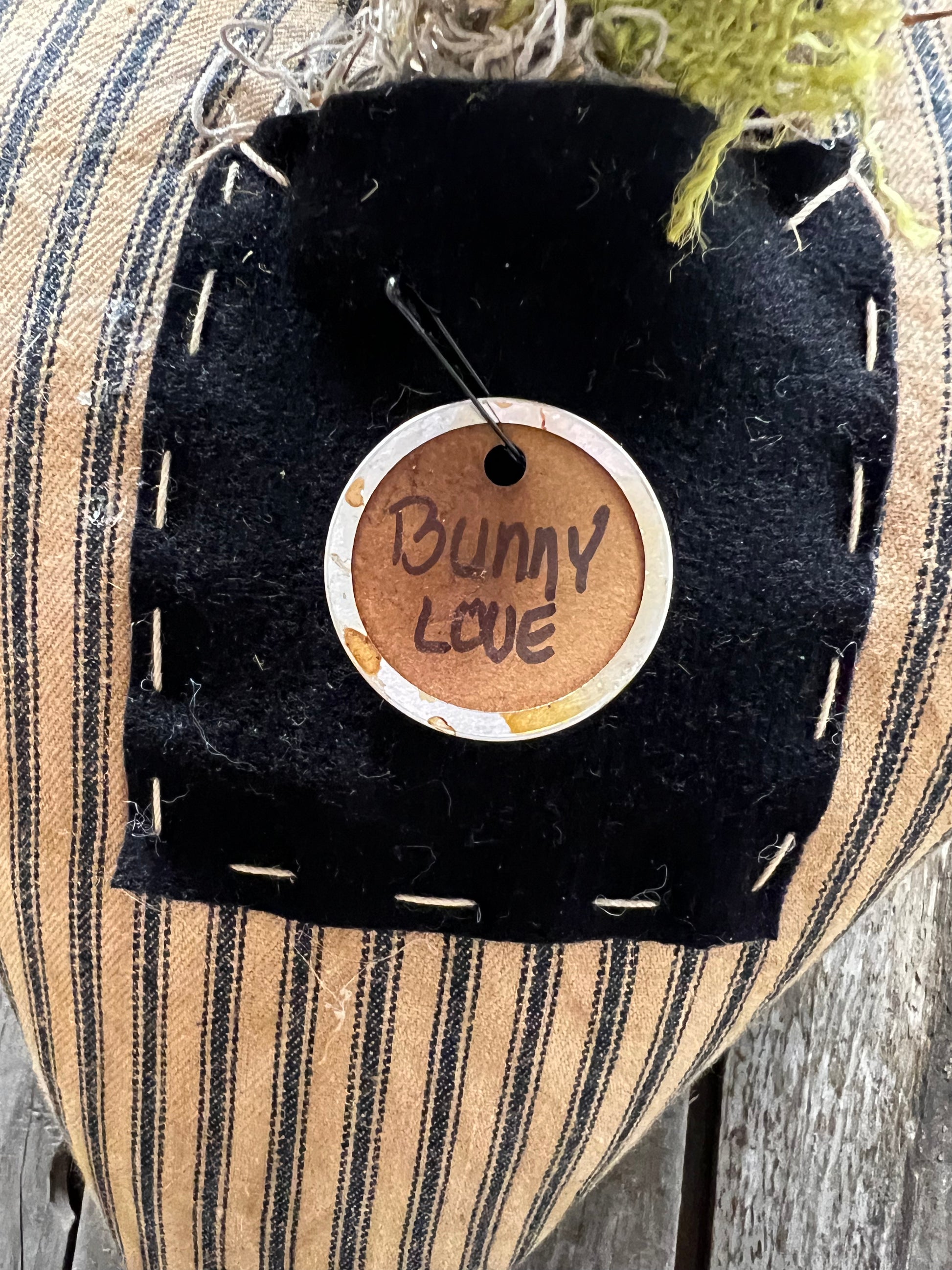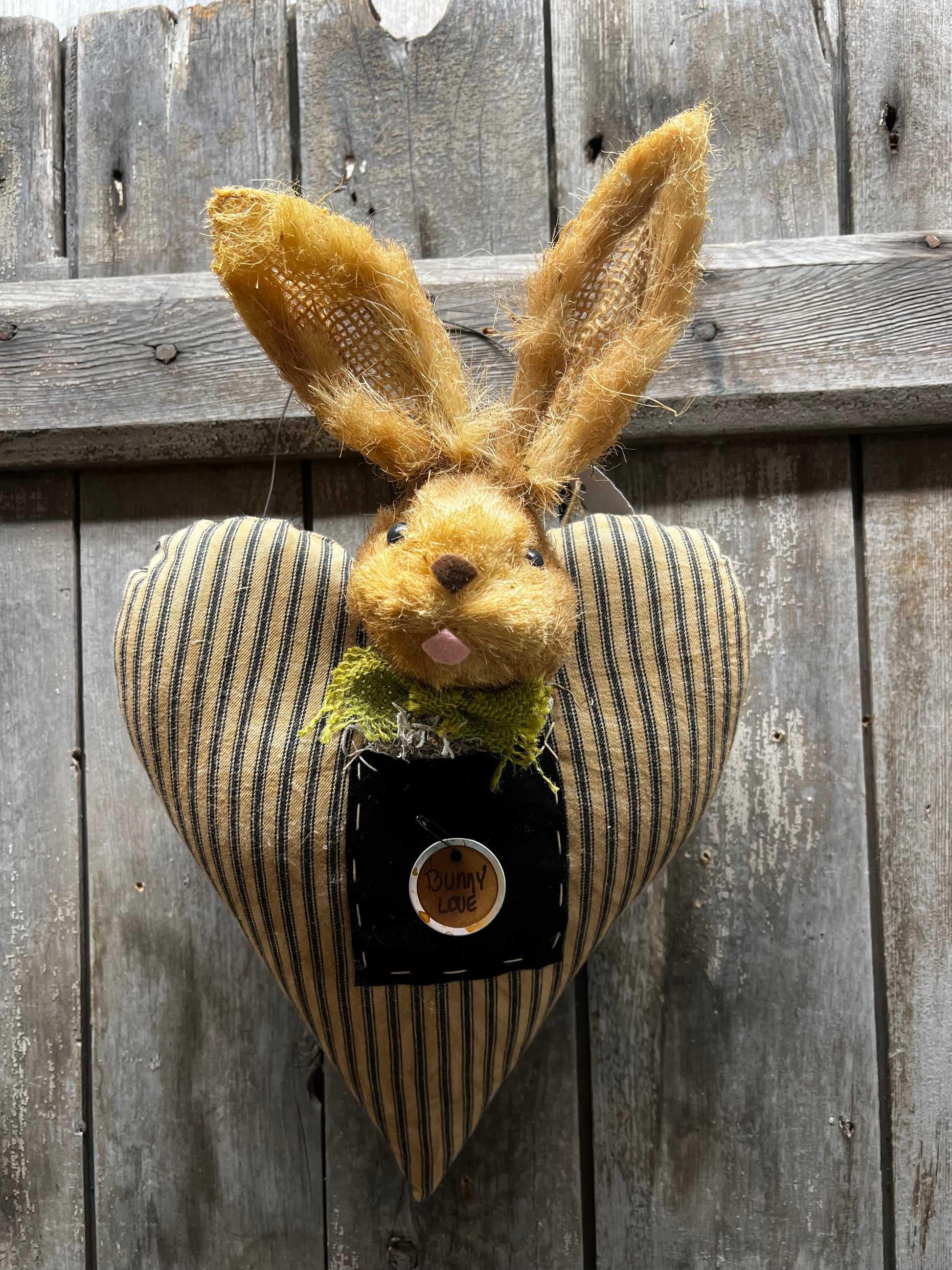 Hand made with "bunny love". Measuring 16"x 9", this stuffed ticking heart has a felt pocket sewn on with a straw type bunny head poking out. A Bunny Love tag is attached. The back is sewn with simple stitches.