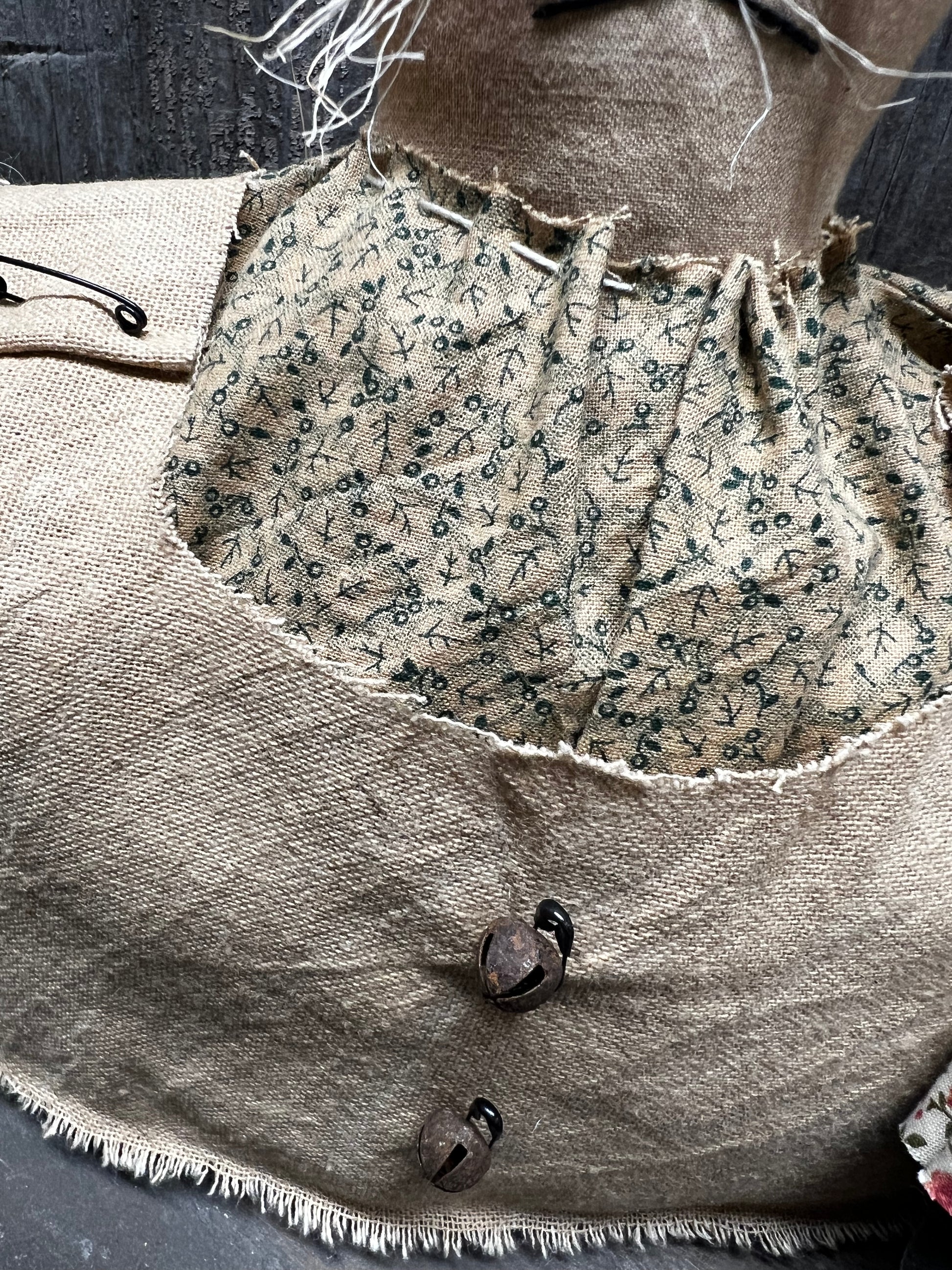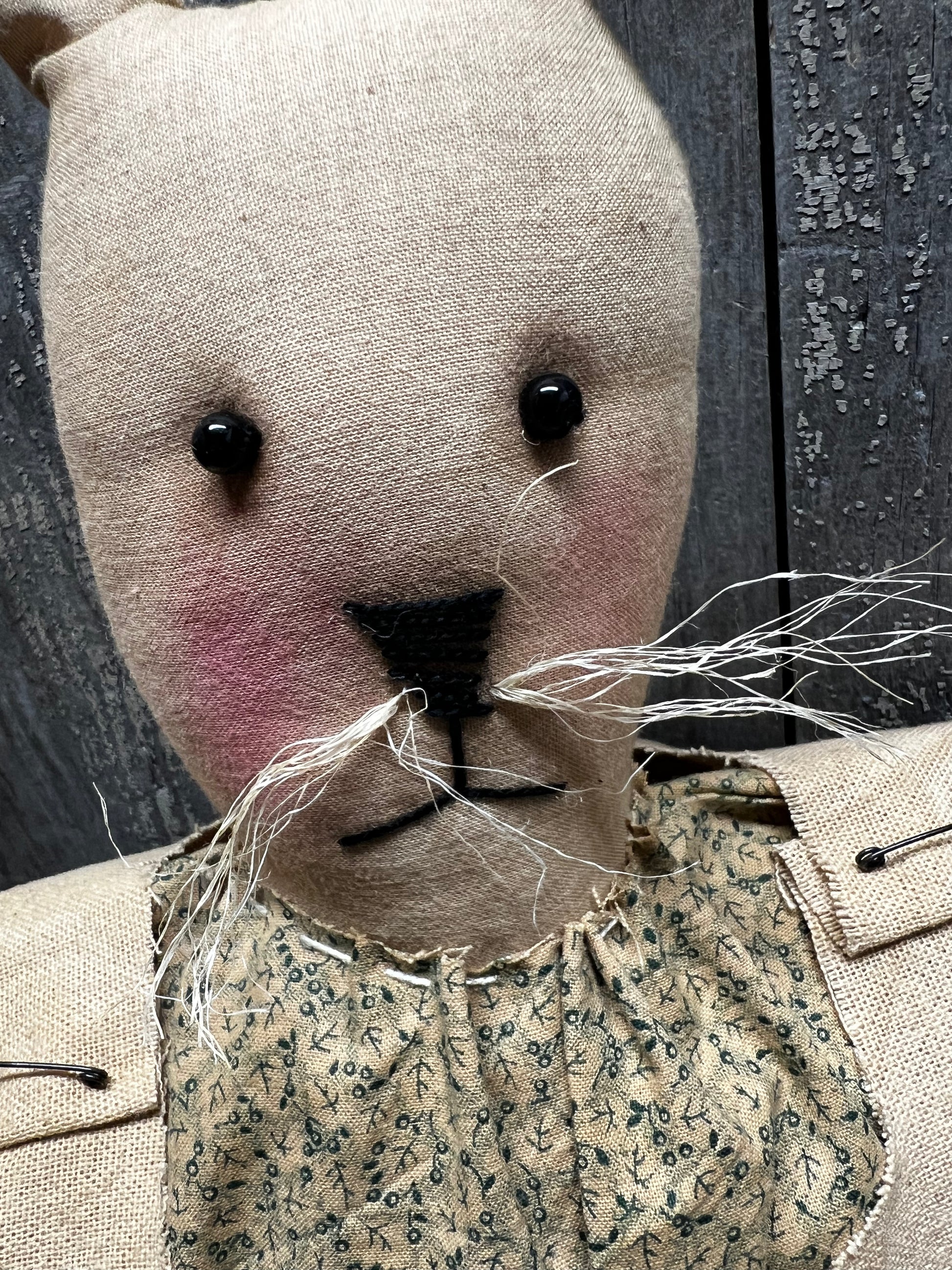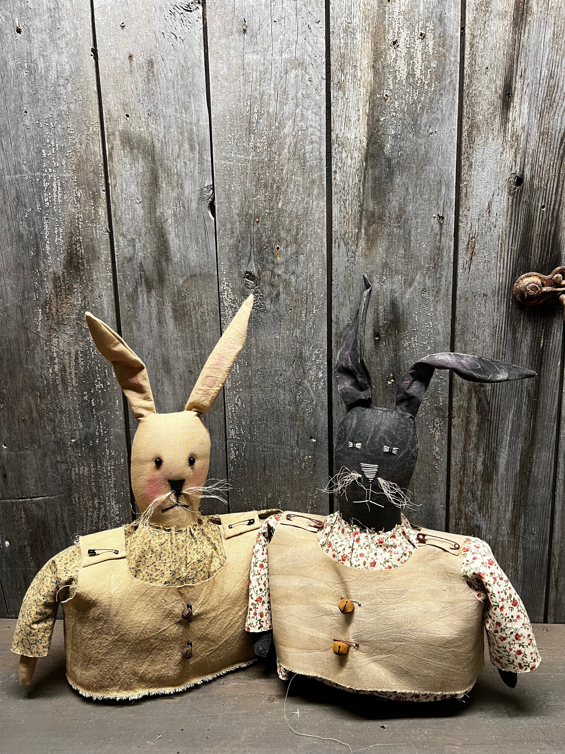 Handmade and oh "sew" cute! Each bunny has its own style and features. Considering they are hand made expect variations; some have button eyes and others sewn eyes. Floral printed shirts and tan vests complete the look. Oh and don't forget about the safety pins and rusty bells. Ears are wires and posable. Weighted bottoms. Measures 15" high and 8" wide.