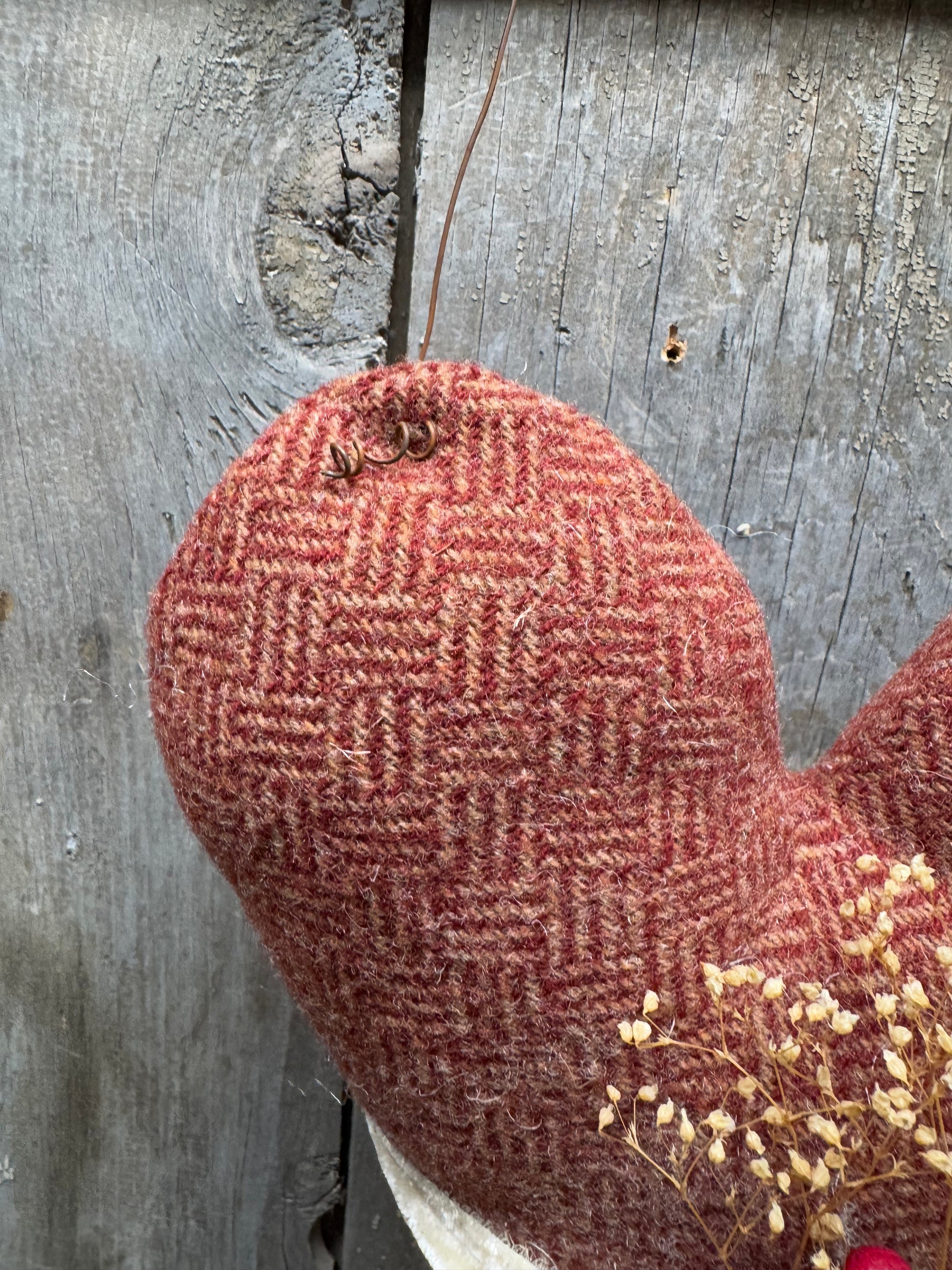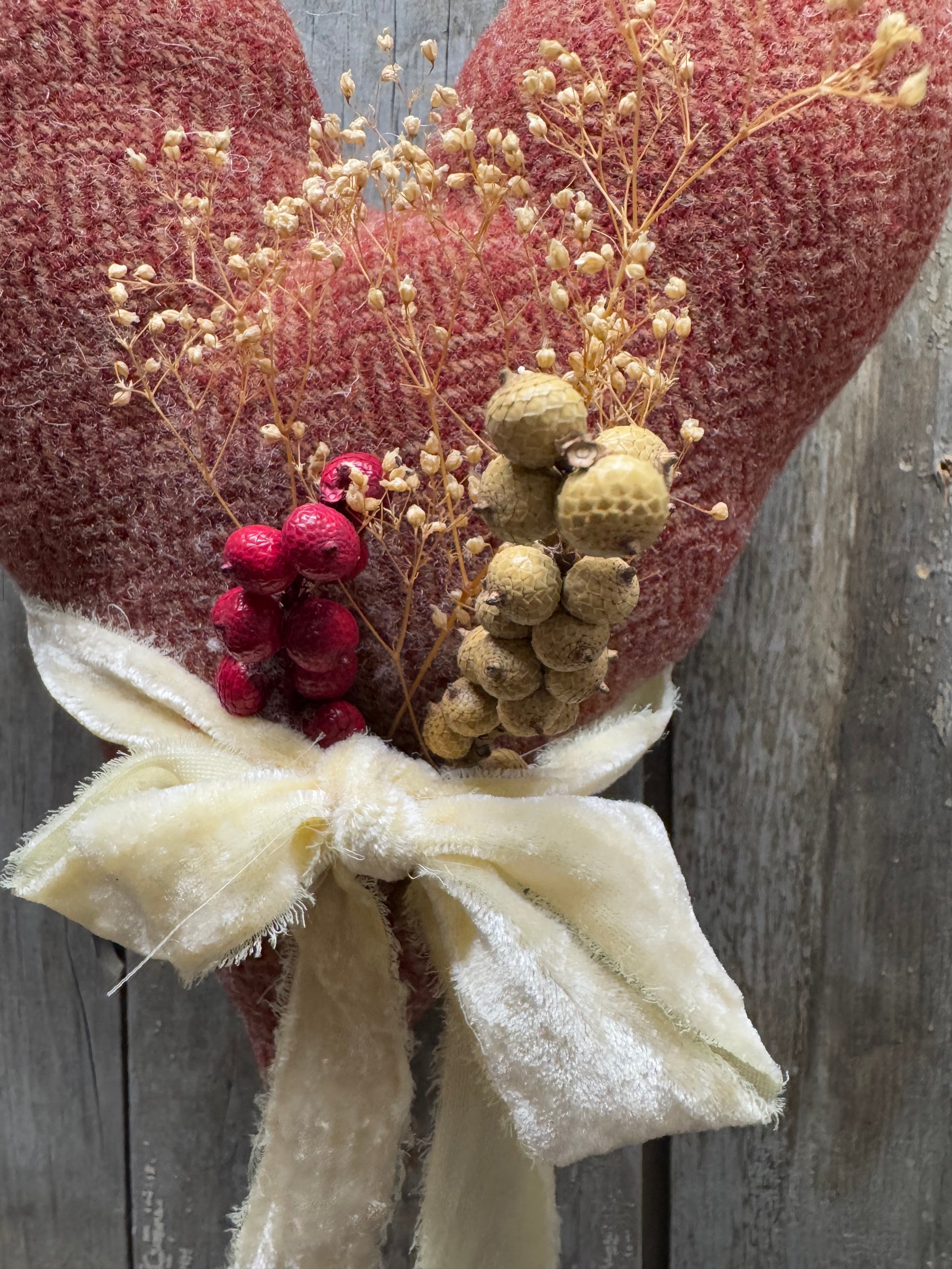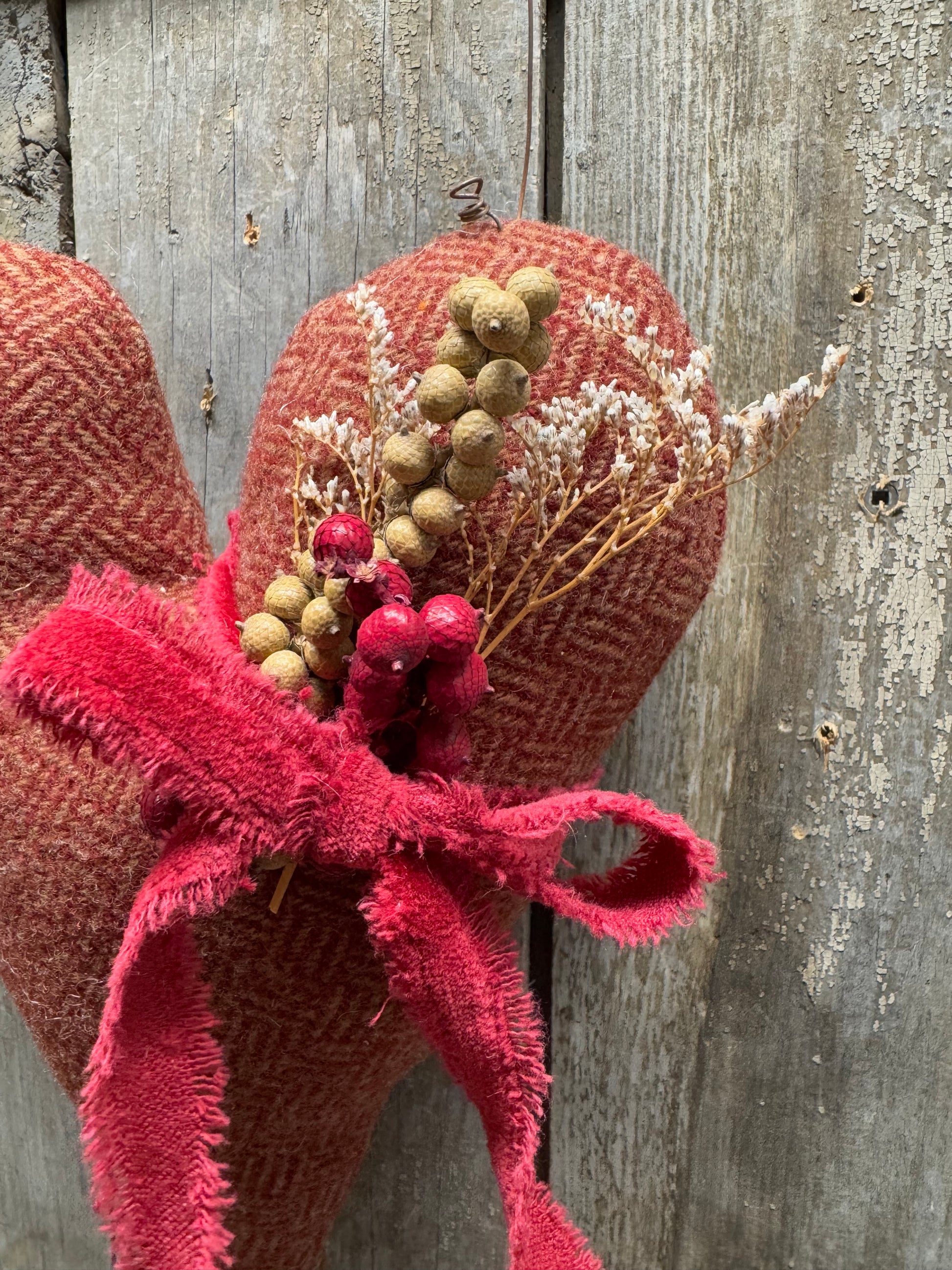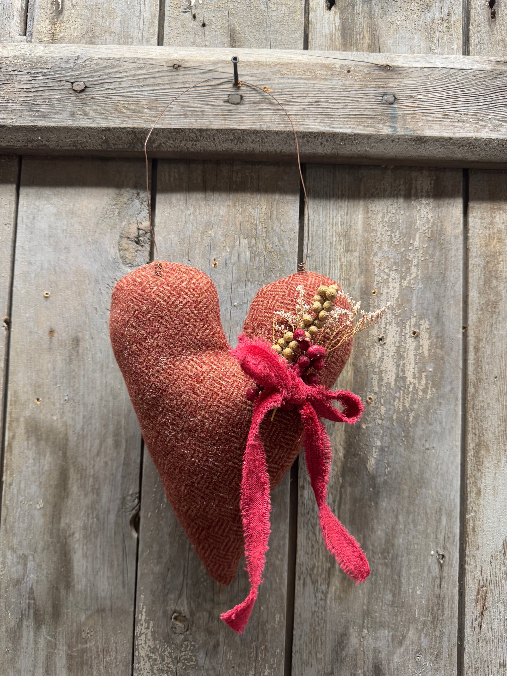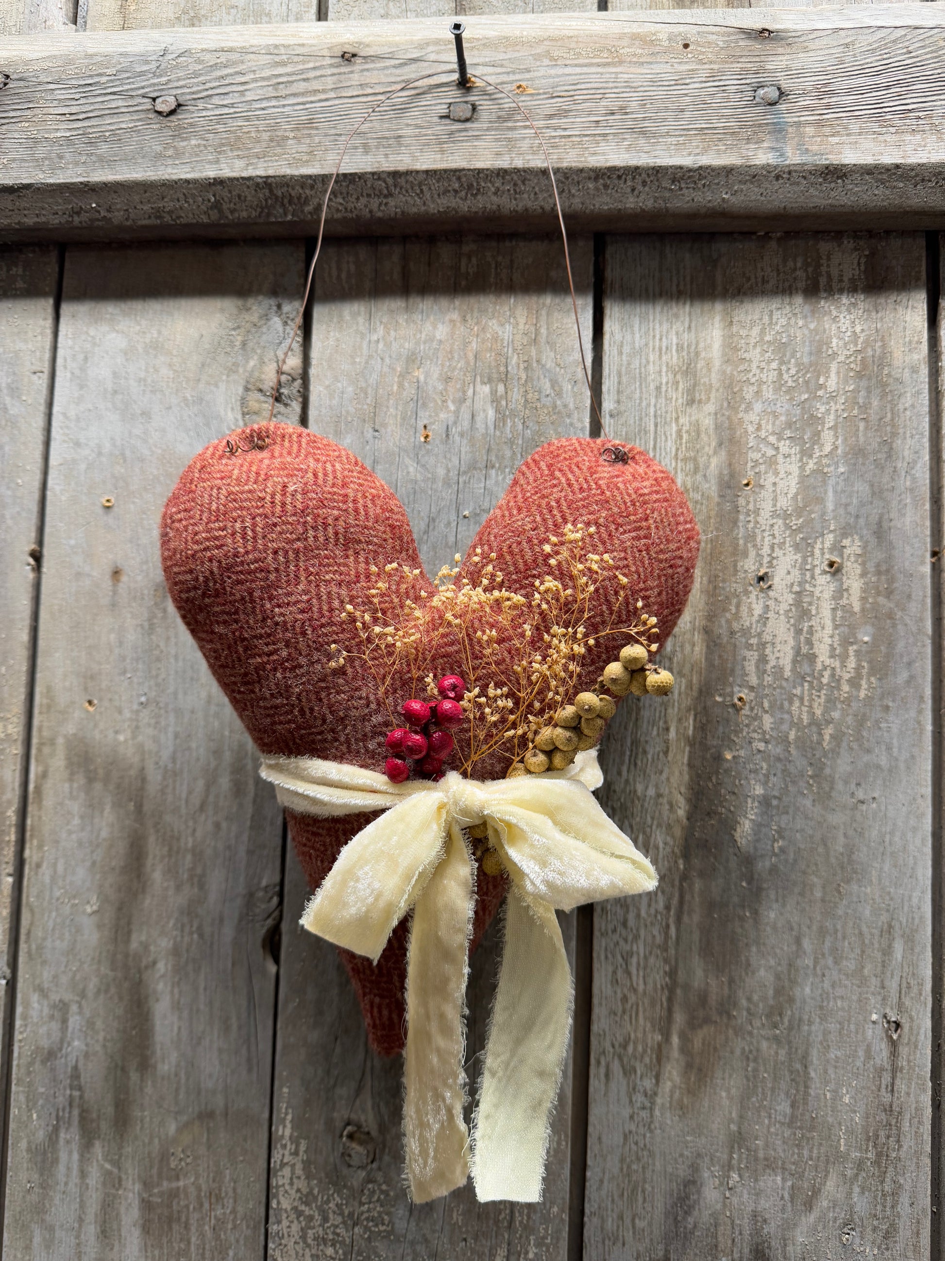 Made from wool and gently stuffed, this 9" heart hangs even longer with the rusty wire attached. Berries in red and white, dried flowers and classic velvet ribbon complete the look. Hang from pegs, hooks, wreaths and even baskets all year long. Handmade in PA
