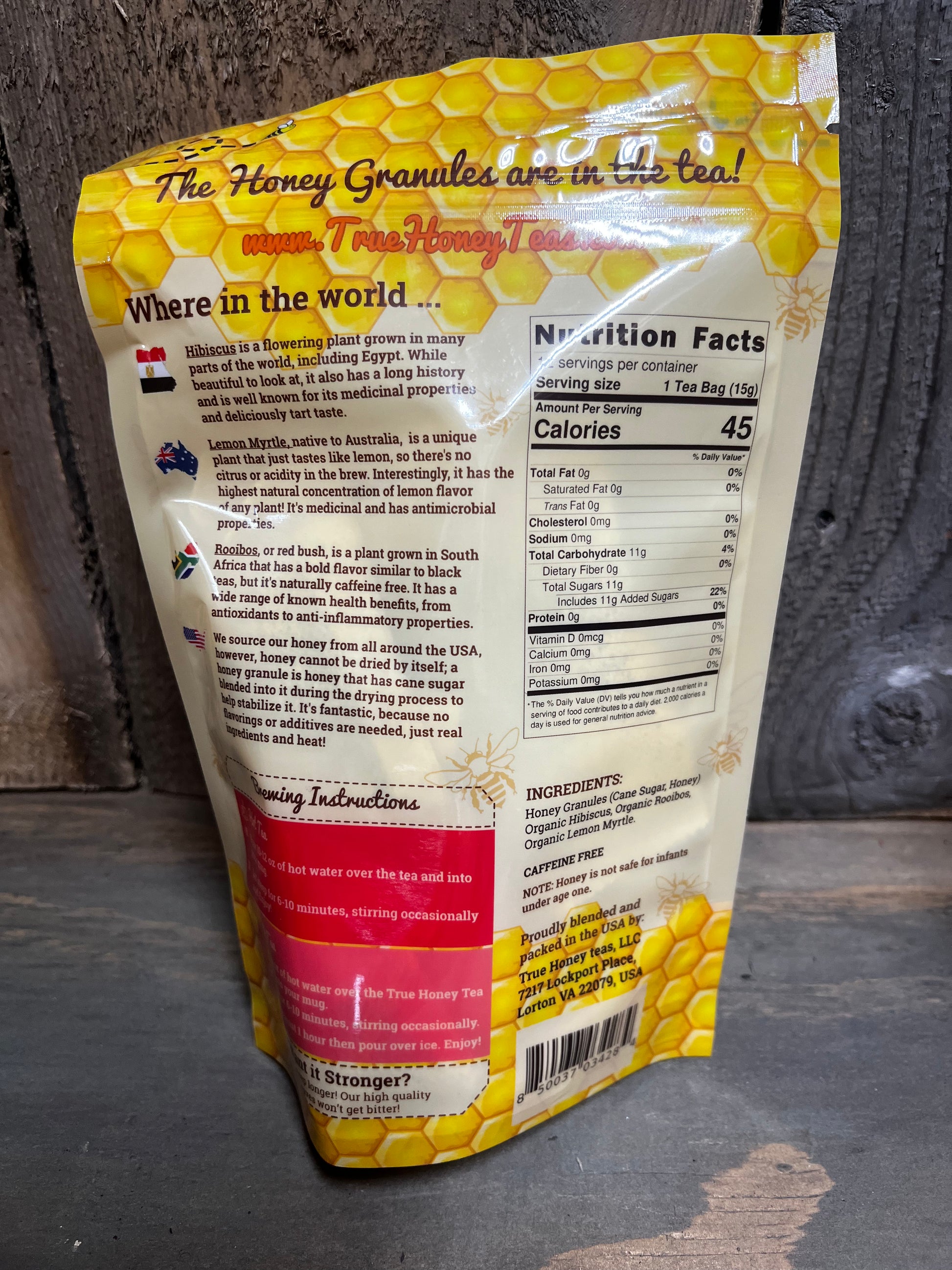 True Honey Teas Hibiscus Lemon Lift combines Organic Hibiscus from Egypt, Organic Rooibos from South Africa, and Lemon Myrtle from Australia. A healthy powerhouse.