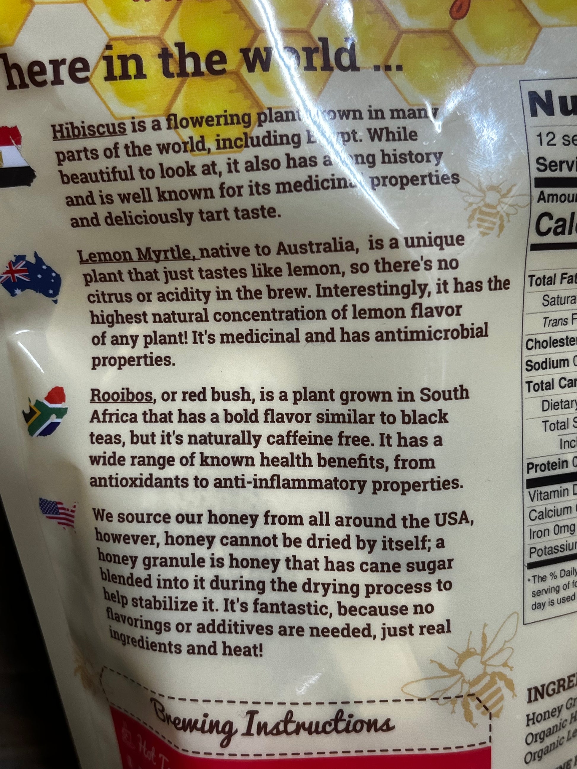 Ingredients: Honey Granules (Cane Sugar, Honey), Organic Hibiscus, Organic Rooibos, Organic Lemon Myrtle