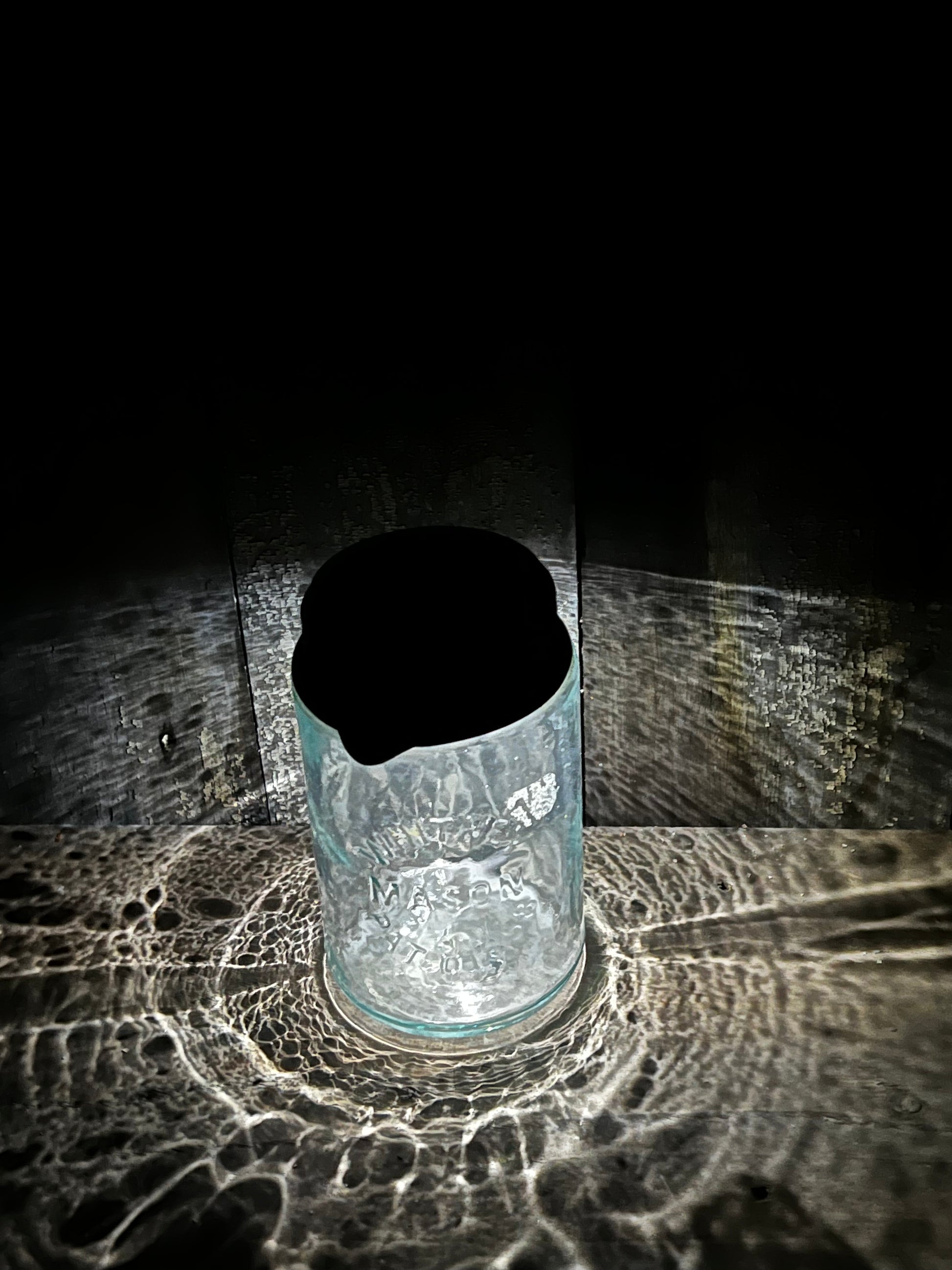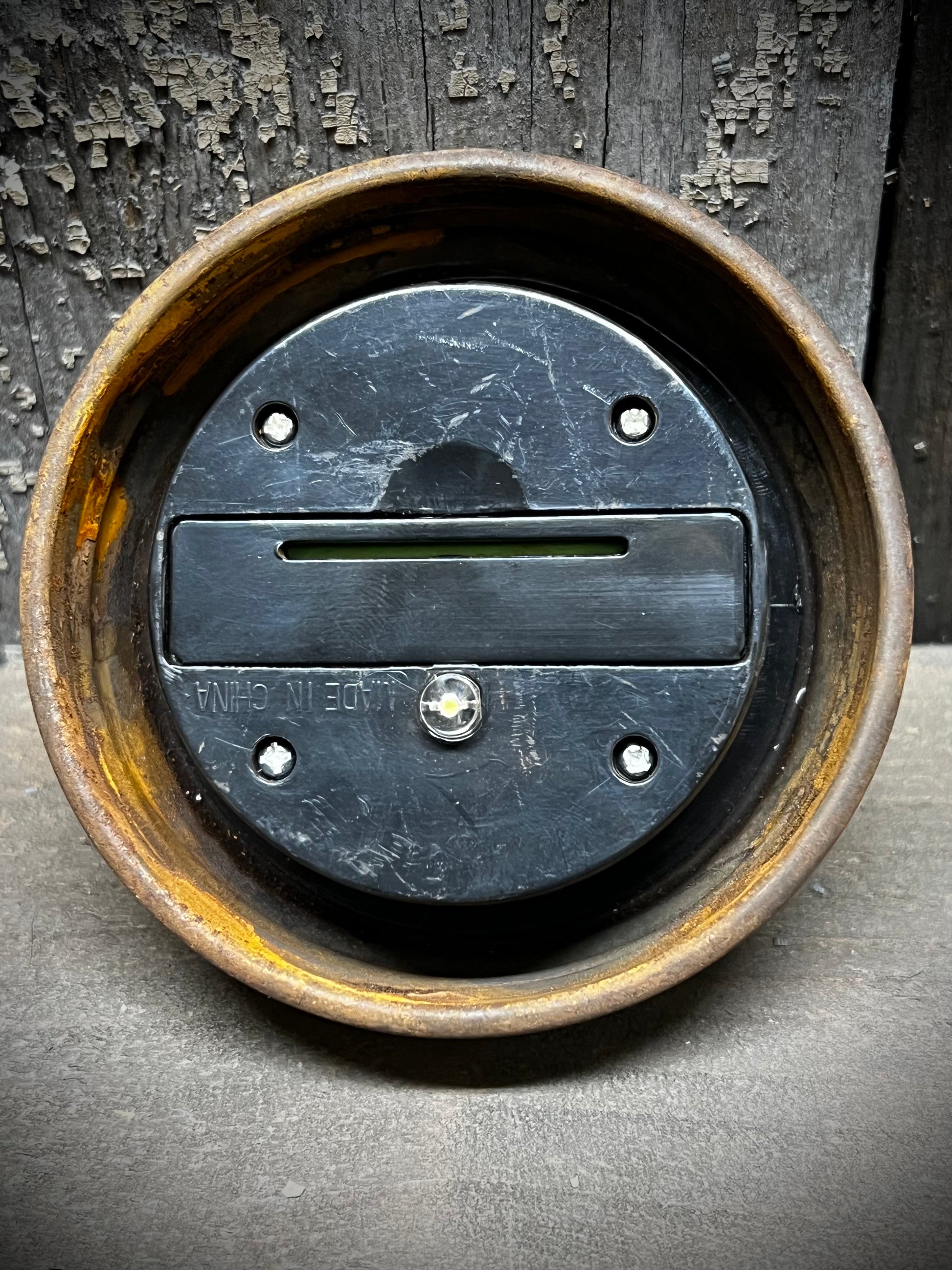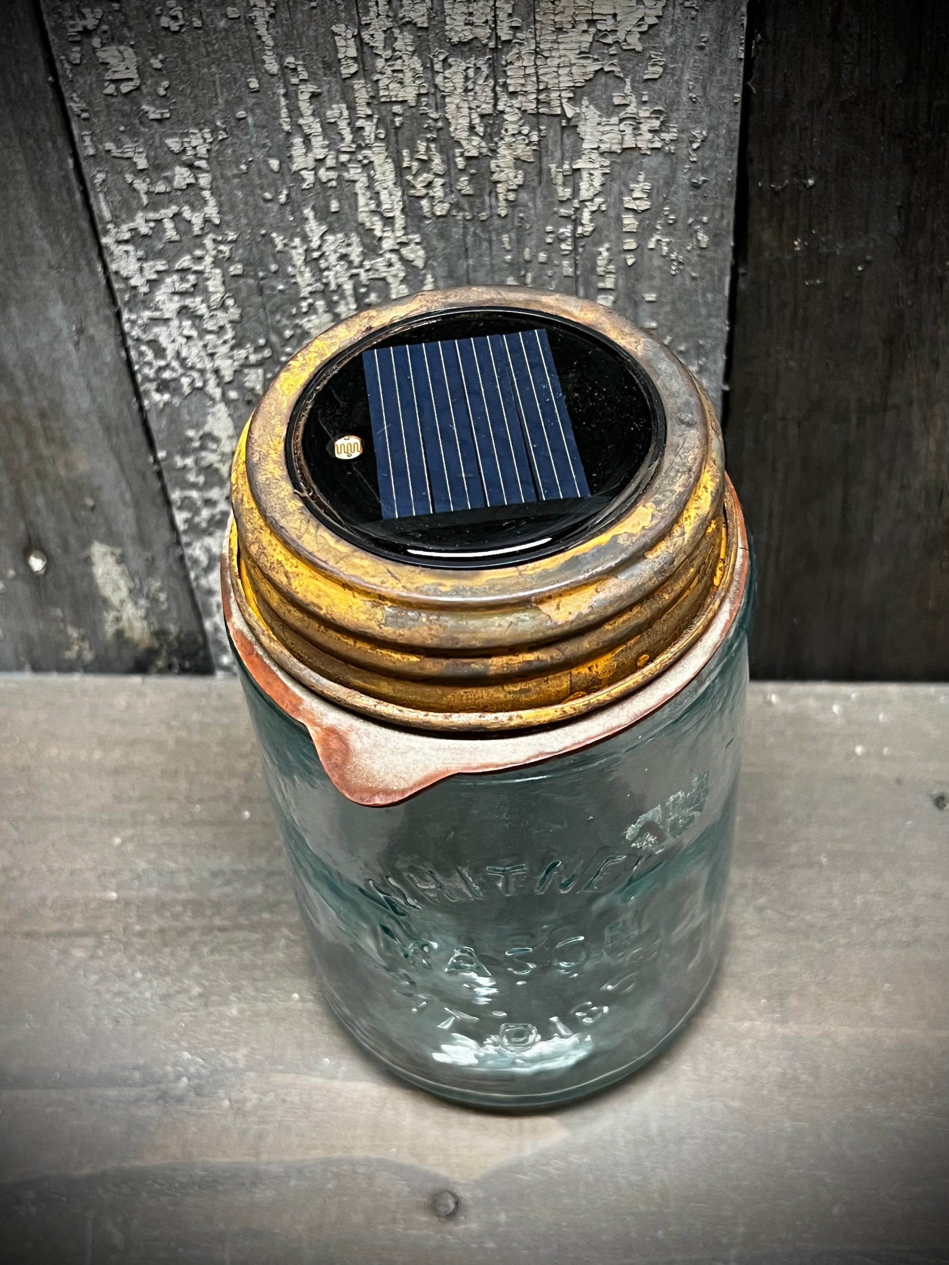 What a great way to light up your outside space AND show off your old jars. The solar rusty jar lid will fit most jars...not wide mouth...and comes with a battery and a solar panel on the cap. Sit in the sunlight and let it charge and when the sun goes down watch it glow! Shown on an old Whitney Jar in blue! Comes with 1 AAA battery.