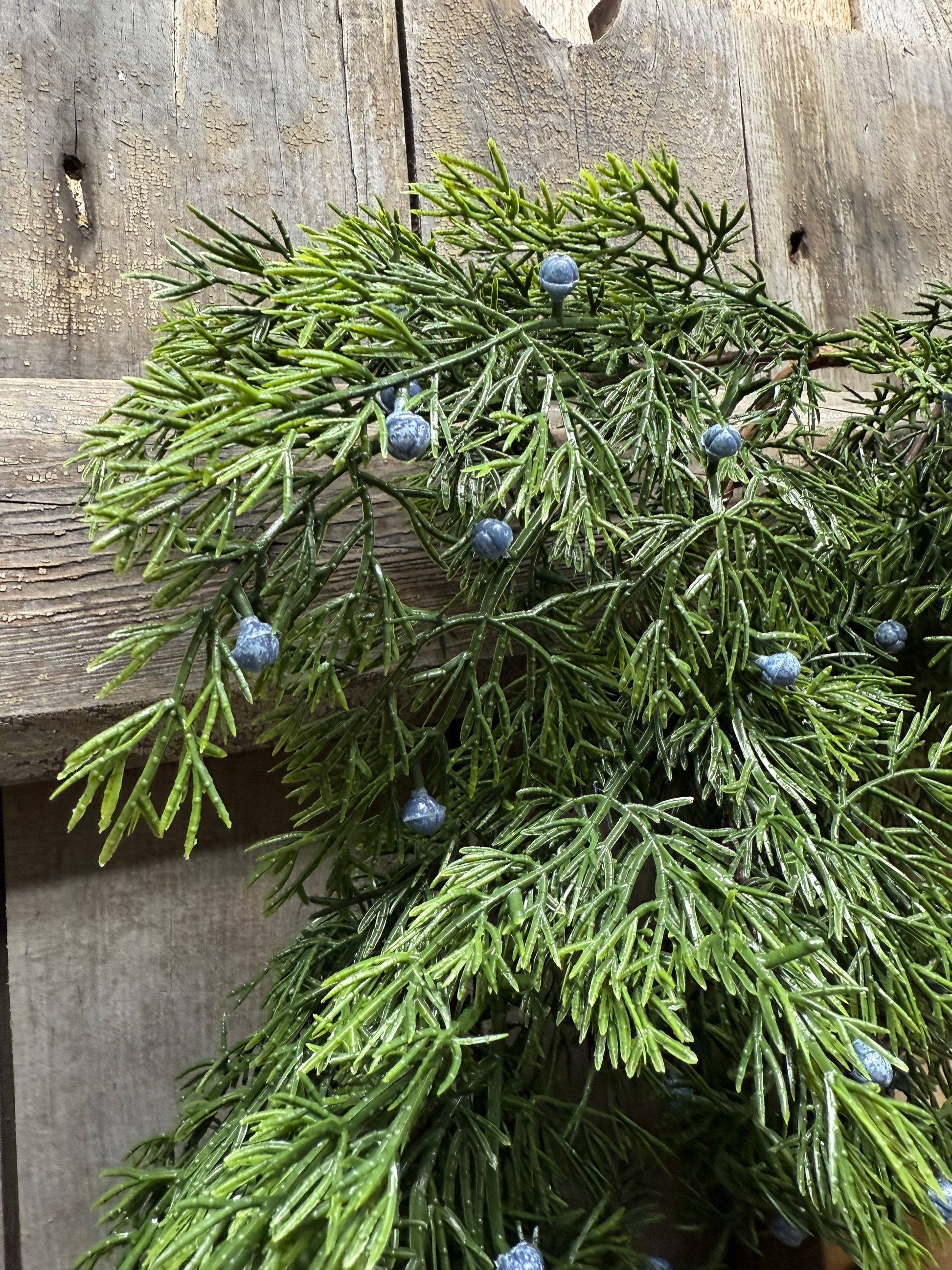 The Juniper Berry Garland, measuring 60", features a premium juniper foliage that delivers a rich, natural look. Small blue Juniper berries complete the look. Its expertly crafted design ensures durability and a lifelike appearance, making it perfect for enhancing mantels, staircases, and entryways with timeless greenery.