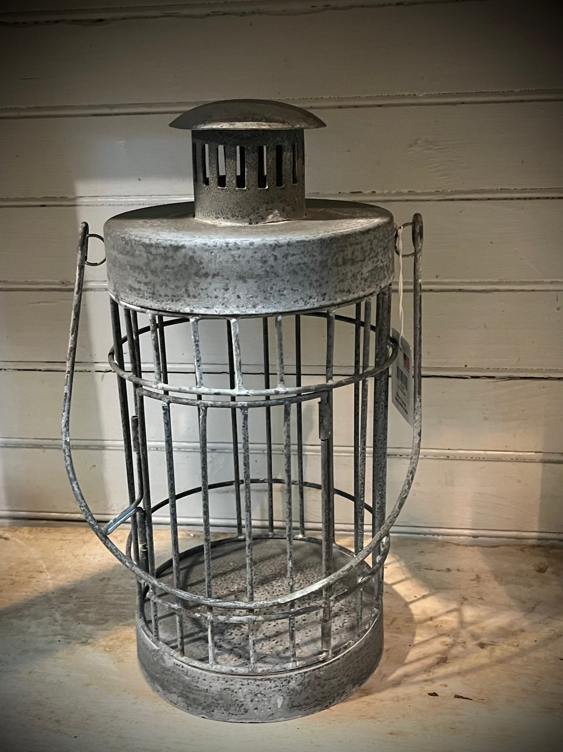 What a lovely birdcage style lantern. The Weathered zinc finish may rust a bit when used outdoors but a little rust would add to the charm. Perfect as a centerpiece or hanging from a peg. It is 12.5"x 7.5"x 6". Choose our Weatherproof candles for outdoor use.