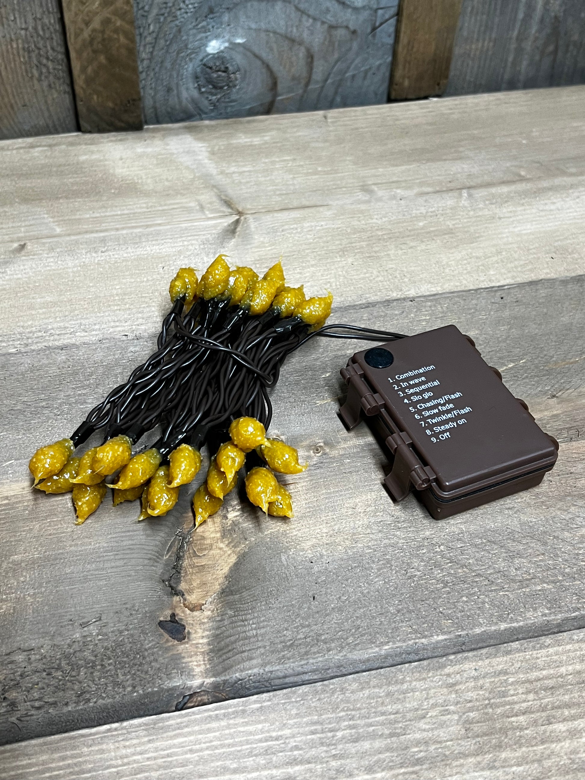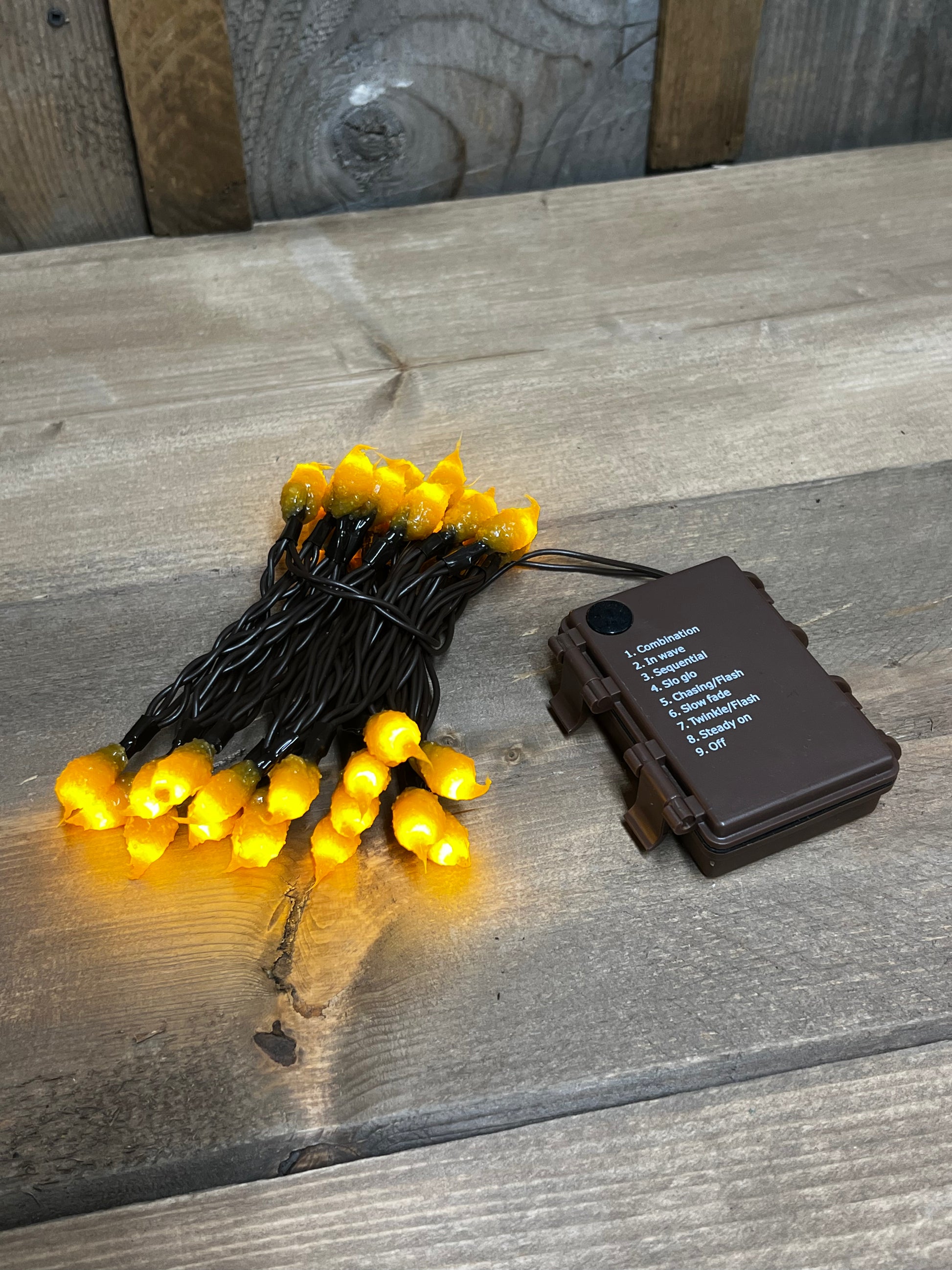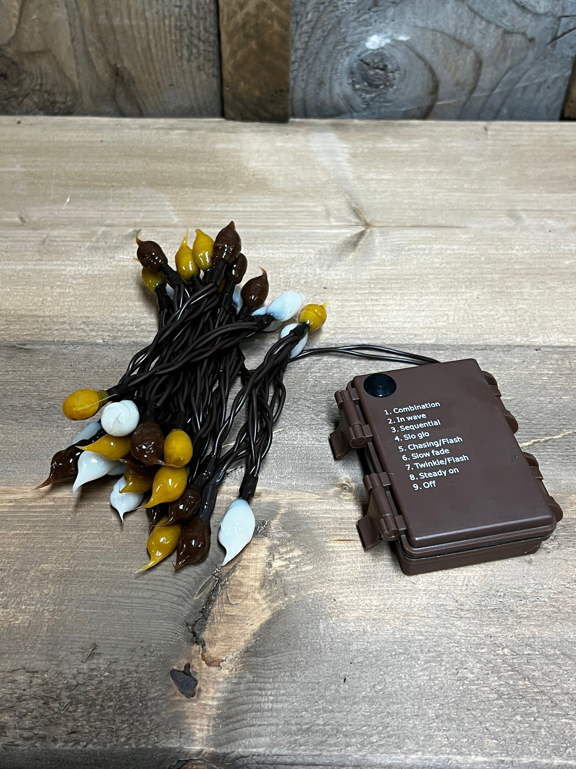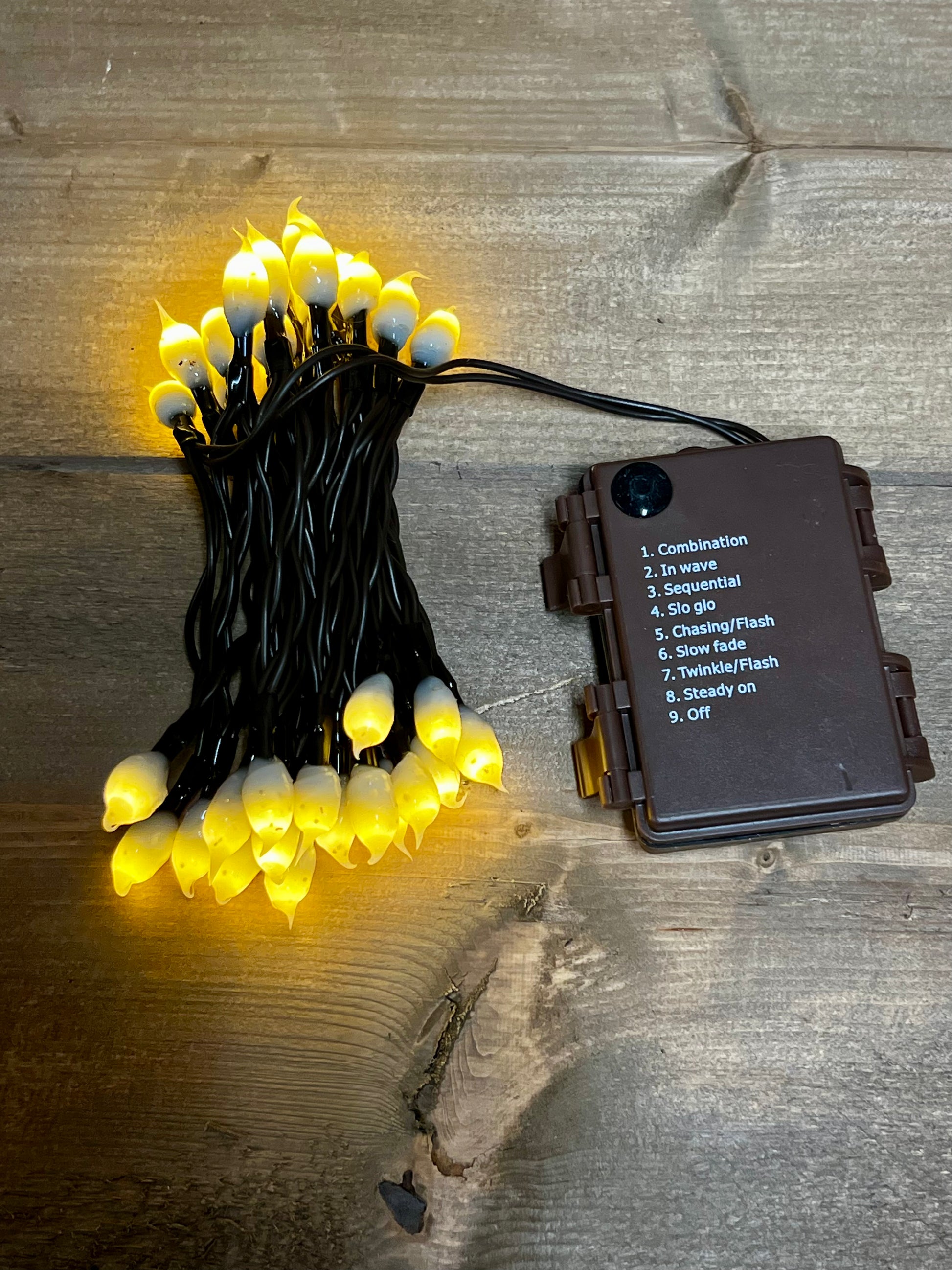 These battery operated string lights compliment any decor. Small batches of a silicone mixture is applied to each individual light bulb. (Photo of lit bulbs are the 20 strand bulbs but they will be the same color). These Battery Operated LED string lights have an automatic timer for 6 hours on and 18 hours off and have 8 Multi-functions options (Combination, In Wave, Sequential, Slo Glo, Chasing/Flash, Slow Fade, Twinkle/Flash, Steady On). These strands use 3 AA batteries (not included). With a Brown cord and 7' in length this Battery Operated light strand is perfect for a hanging wreath or table centerpiece. For Indoor use only.