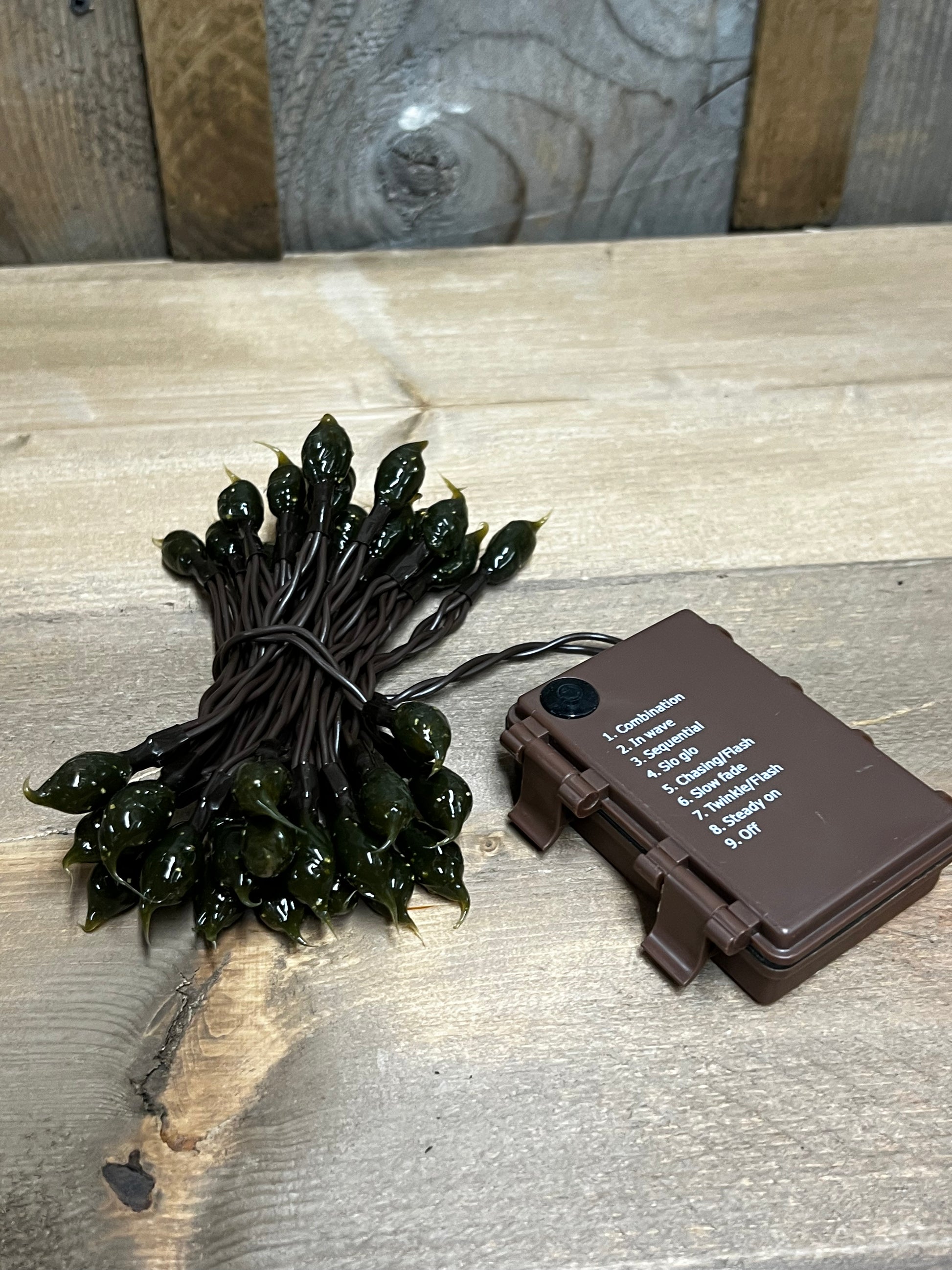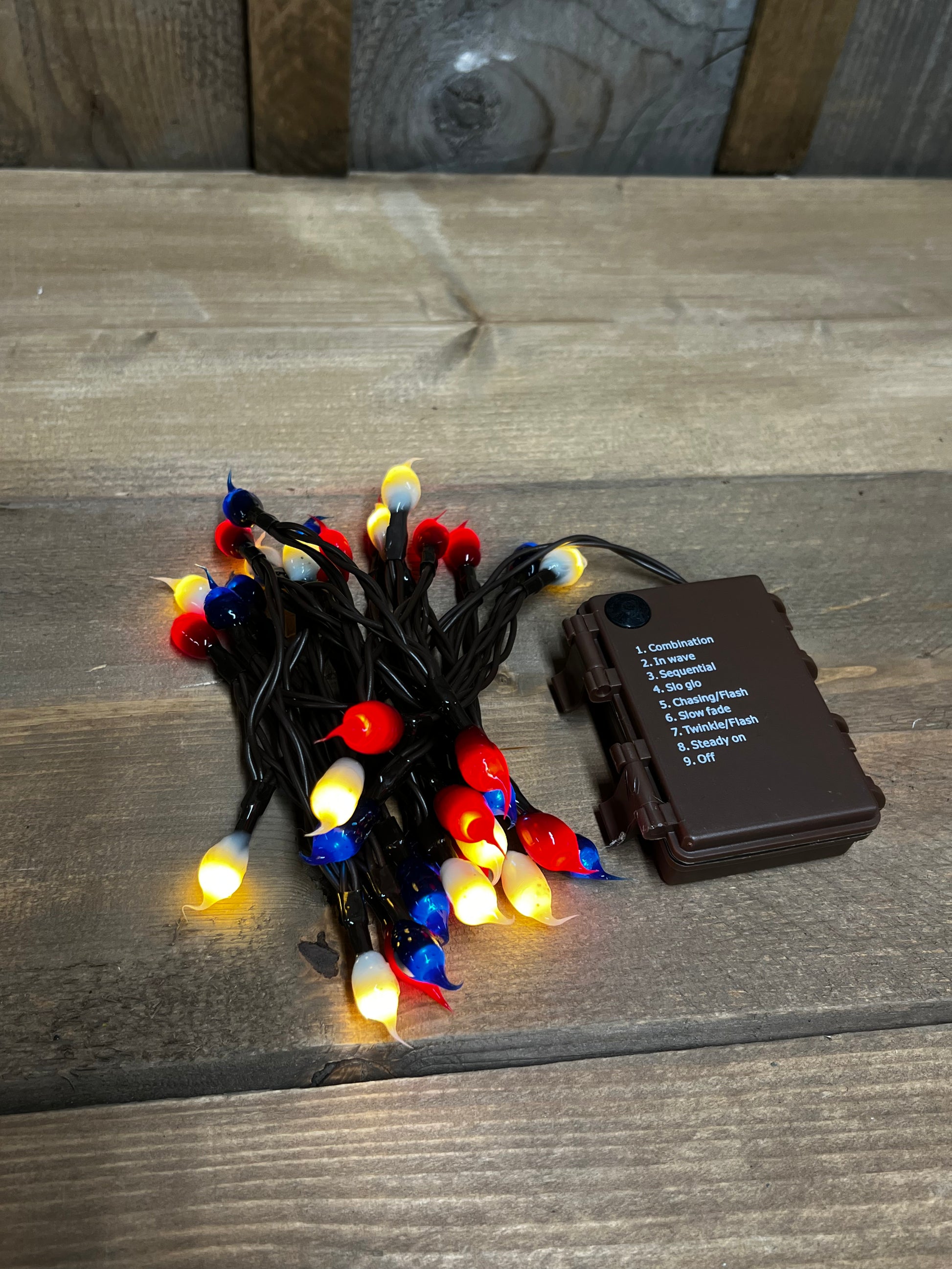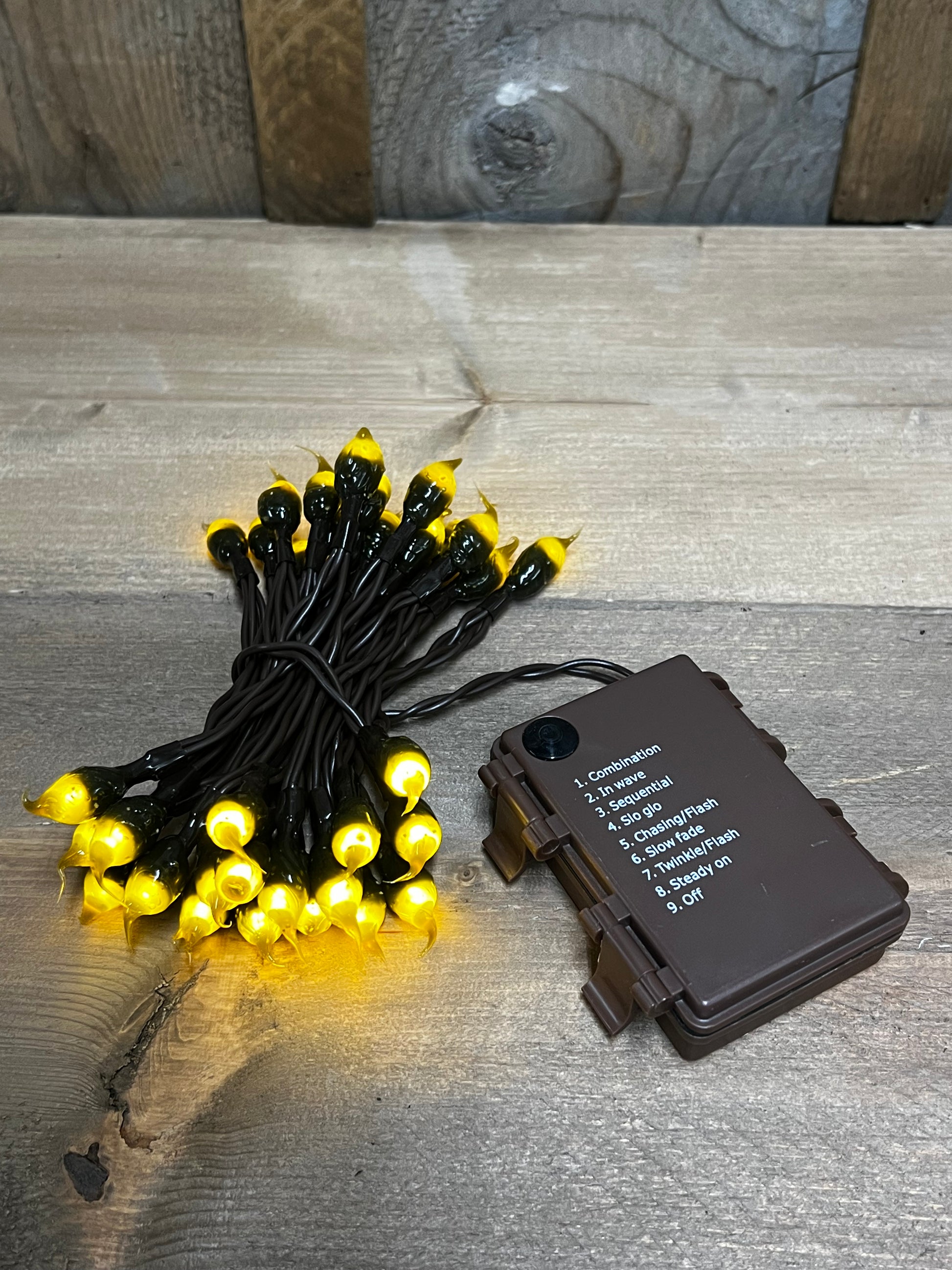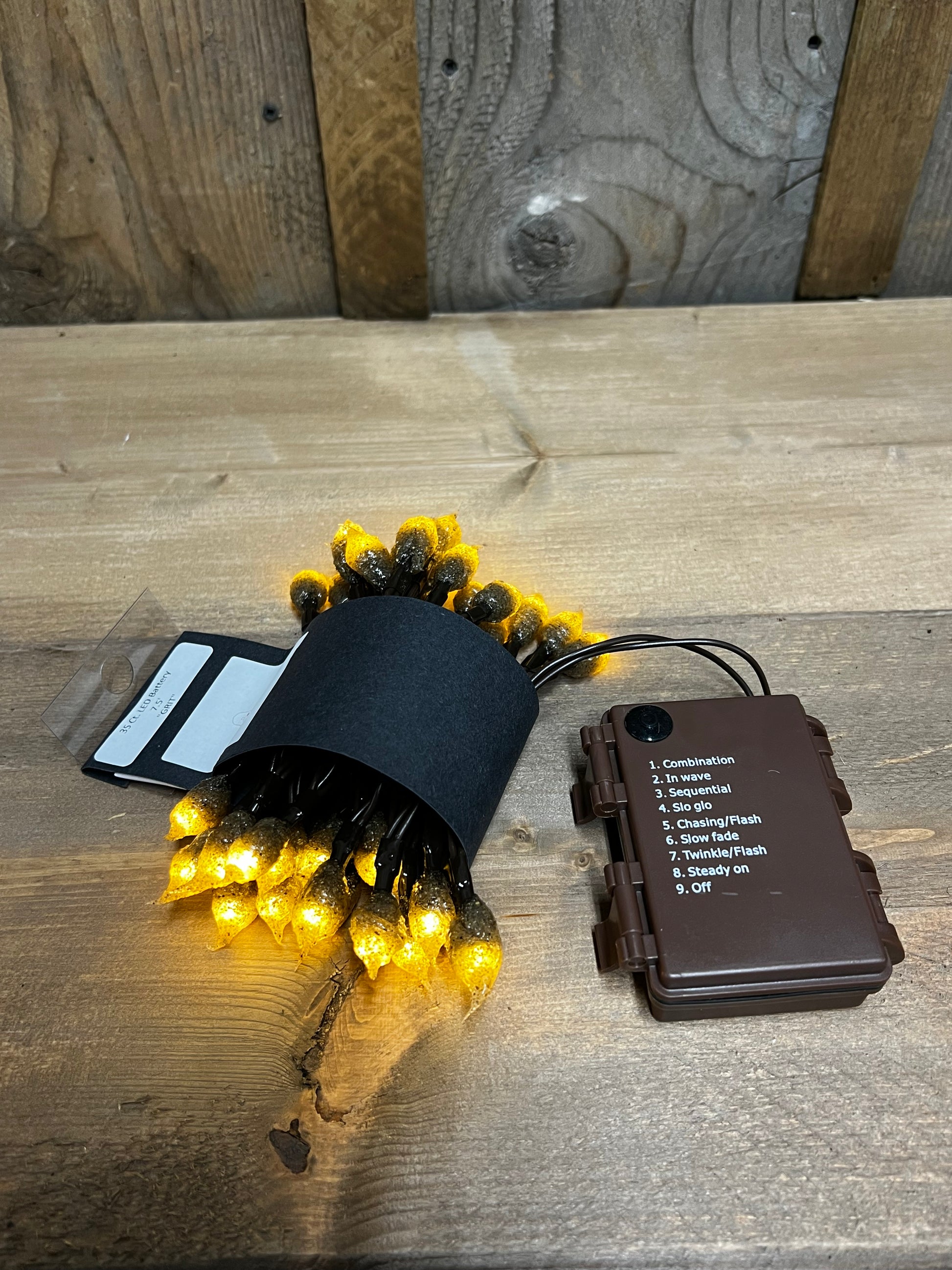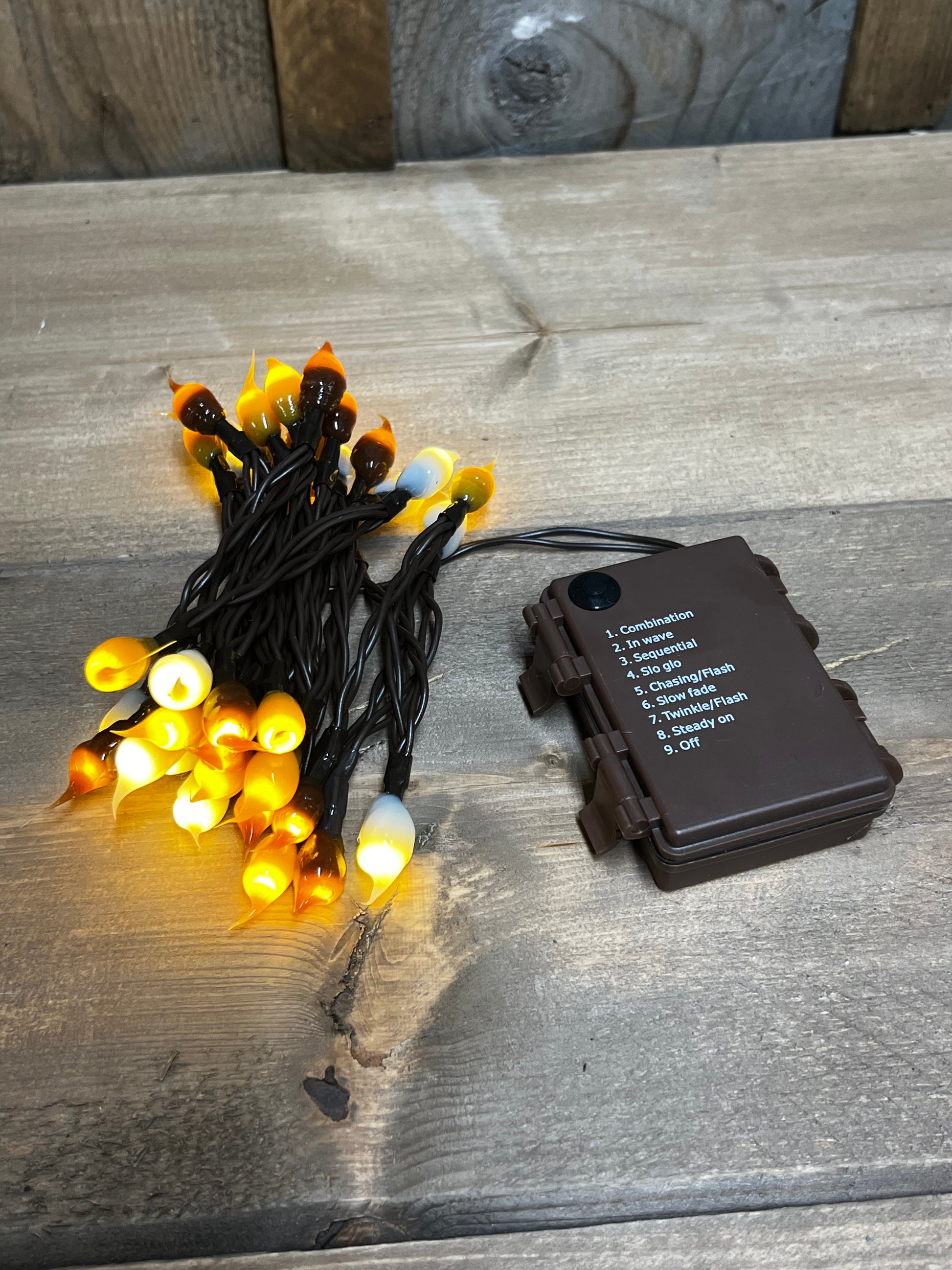These battery operated string lights compliment any decor. Small batches of a silicone mixture is applied to each individual light bulb. (Photo of lit bulbs are the 20 strand bulbs but they will be the same color). These Battery Operated LED string lights have an automatic timer for 6 hours on and 18 hours off and have 8 Multi-functions options (Combination, In Wave, Sequential, Slo Glo, Chasing/Flash, Slow Fade, Twinkle/Flash, Steady On). These strands use 3 AA batteries (not included). With a Brown cord and 7' in length this Battery Operated light strand is perfect for a hanging wreath or table centerpiece. For Indoor use only.