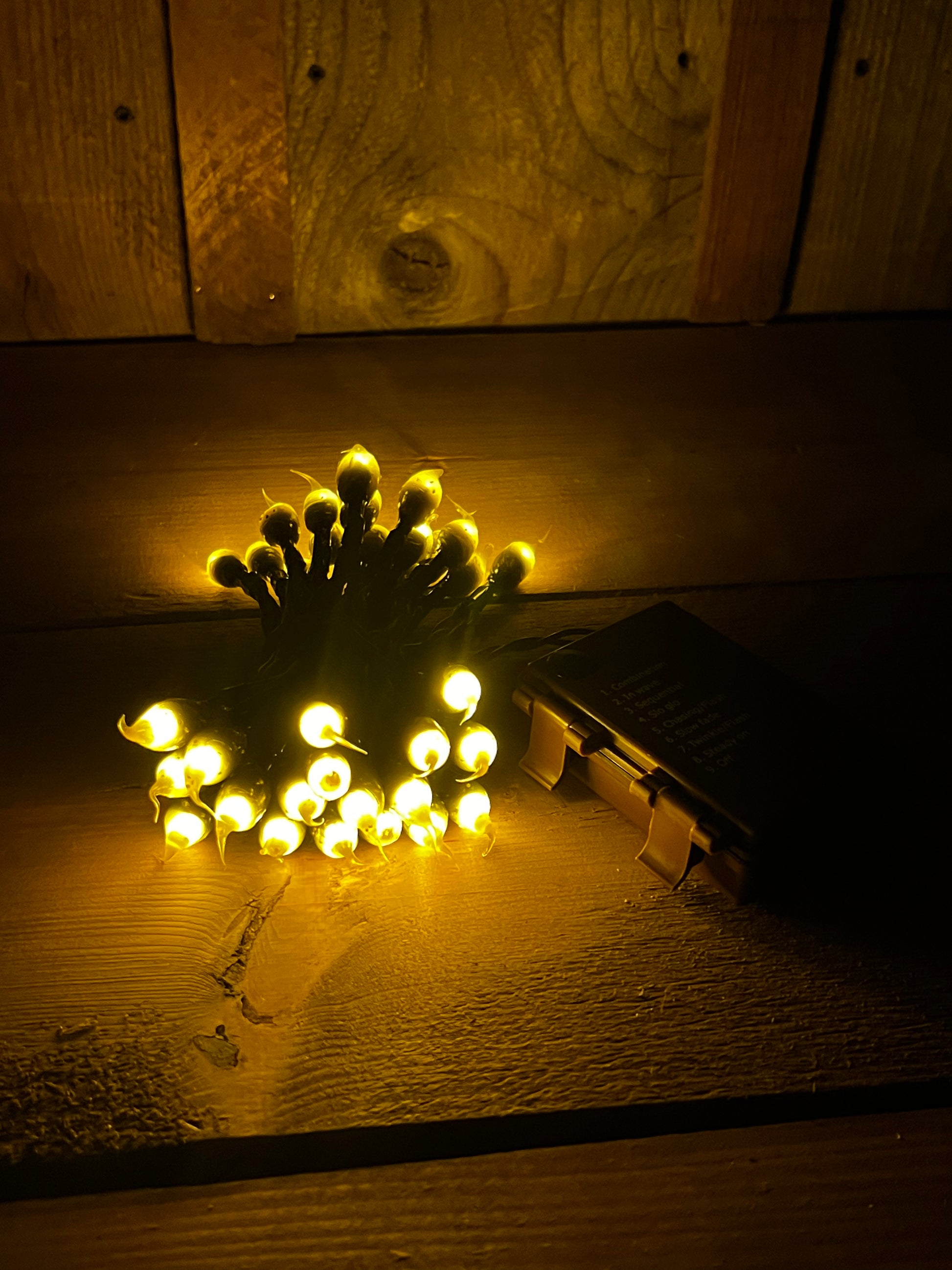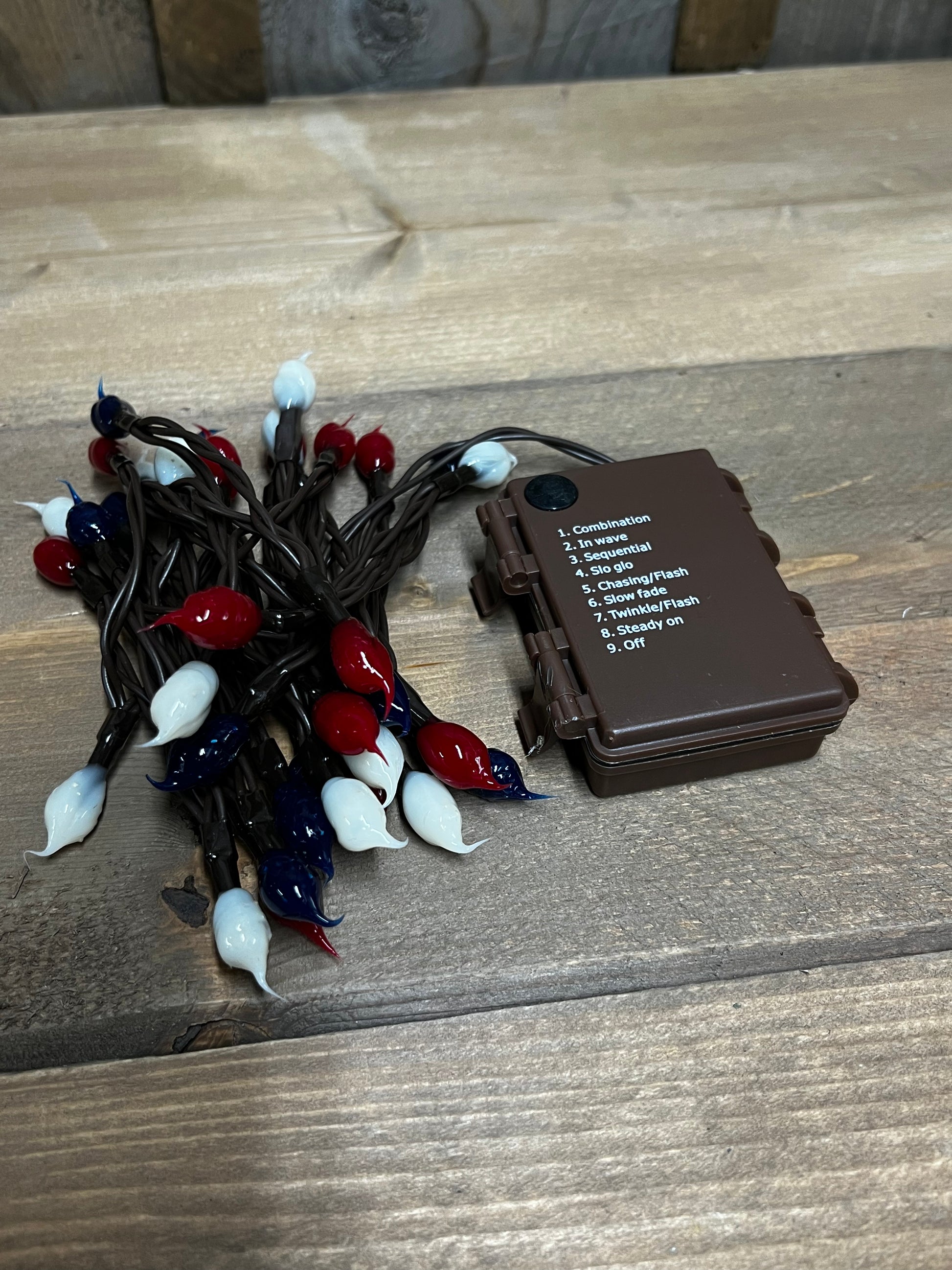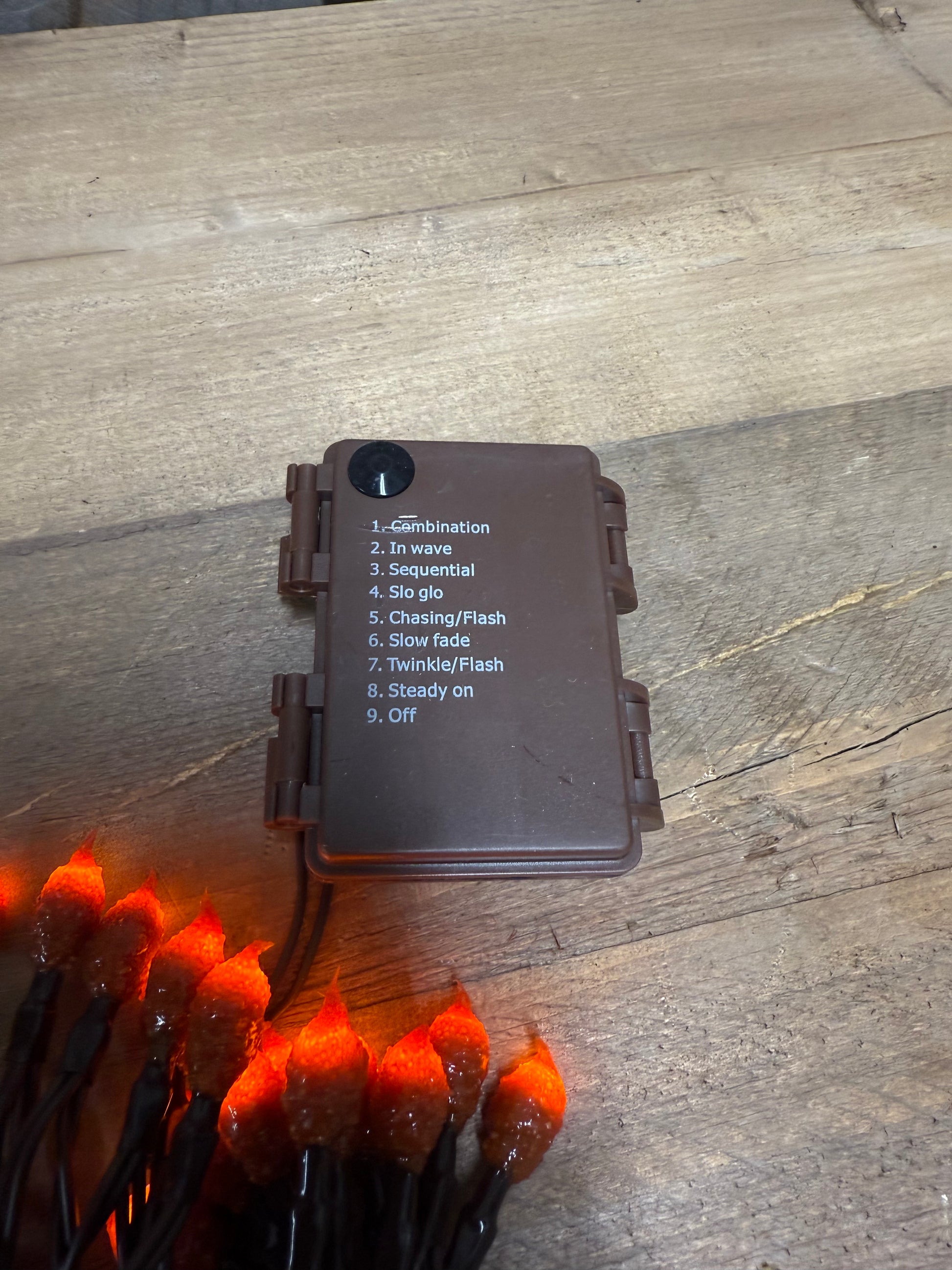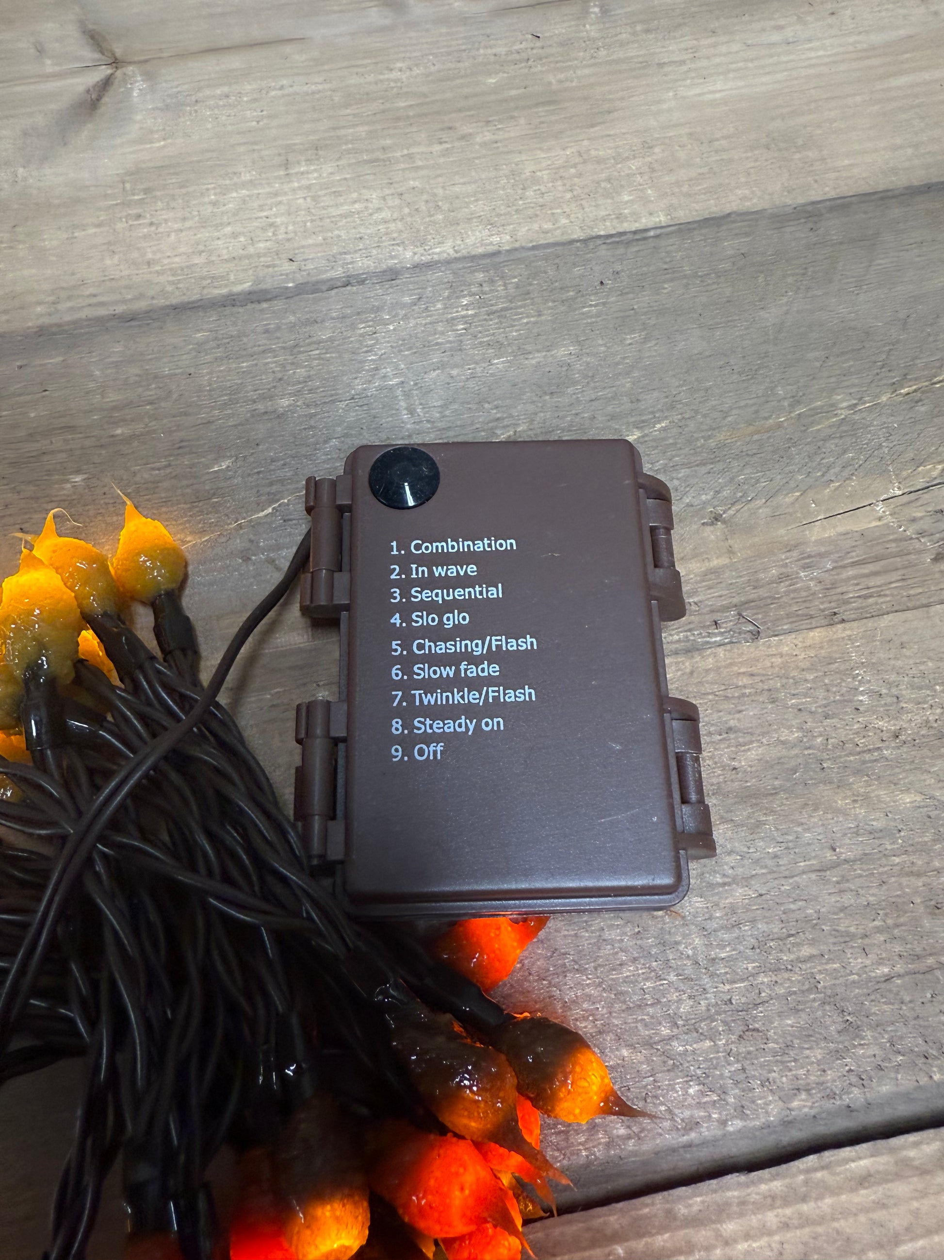 These battery operated string lights compliment any decor. Small batches of a silicone mixture is applied to each individual light bulb. (Photo of lit bulbs are the 20 strand bulbs but they will be the same color). These Battery Operated LED string lights have an automatic timer for 6 hours on and 18 hours off and have 8 Multi-functions options (Combination, In Wave, Sequential, Slo Glo, Chasing/Flash, Slow Fade, Twinkle/Flash, Steady On). These strands use 3 AA batteries (not included). With a Brown cord and 7' in length this Battery Operated light strand is perfect for a hanging wreath or table centerpiece. For Indoor use only.