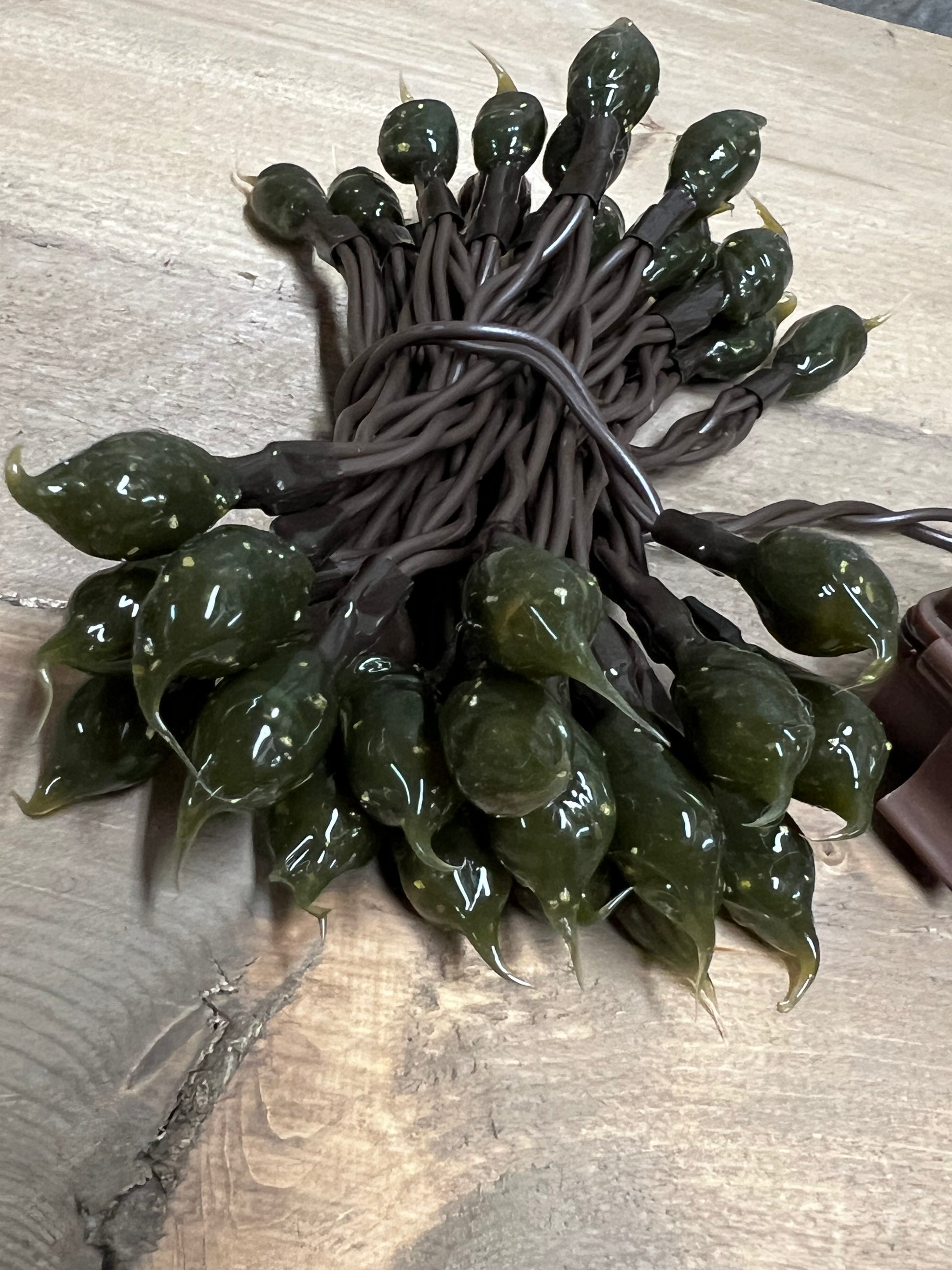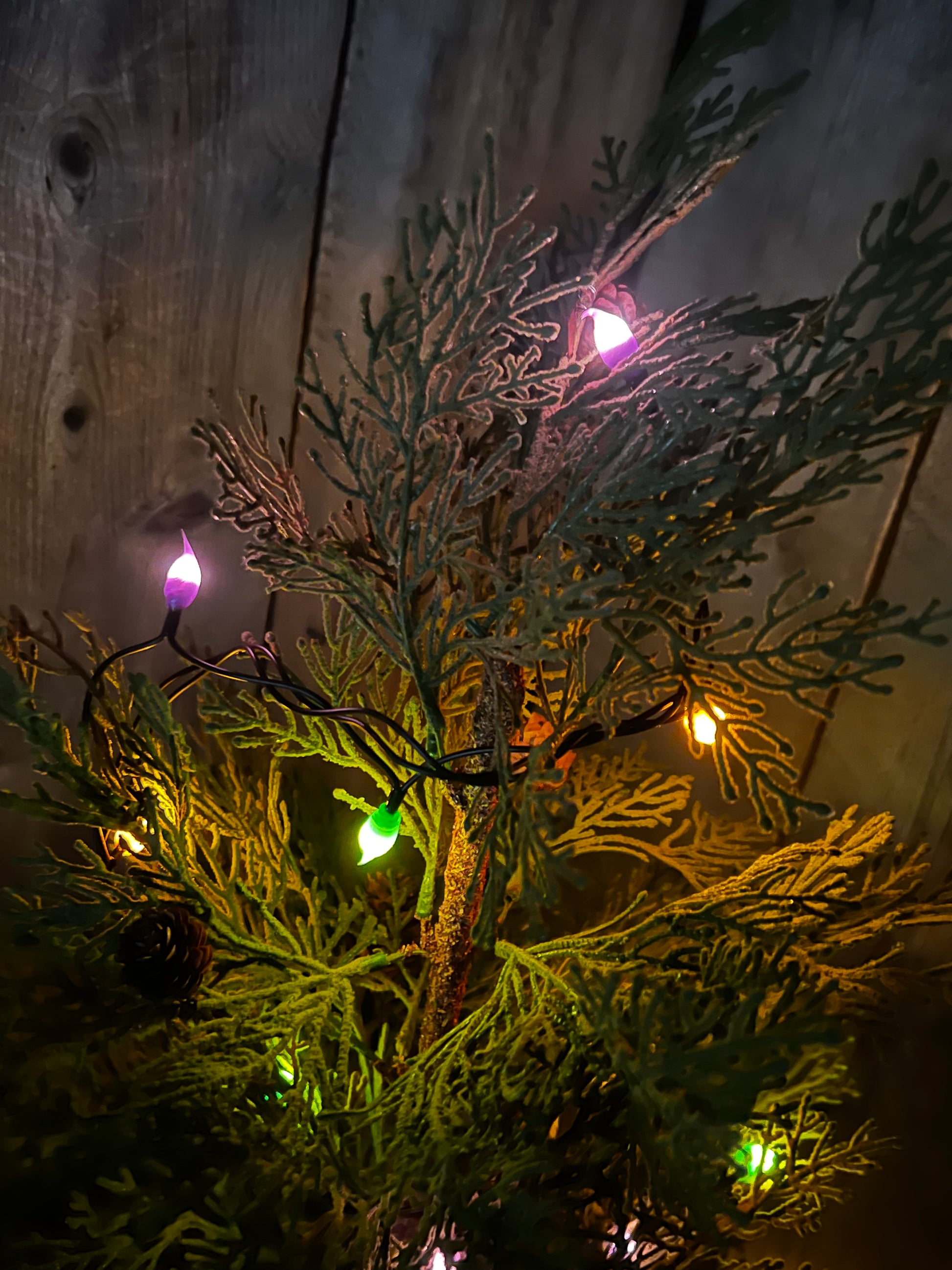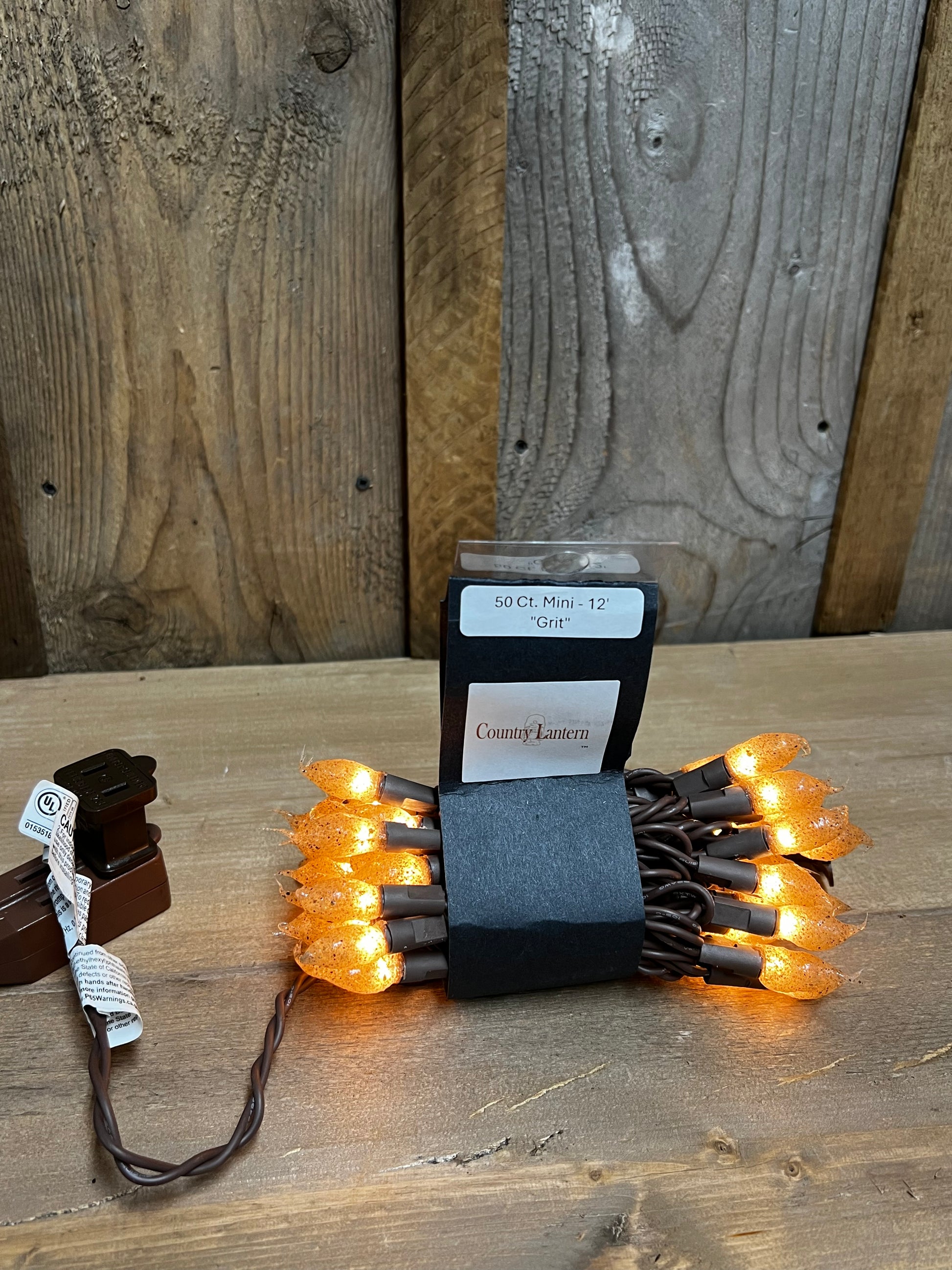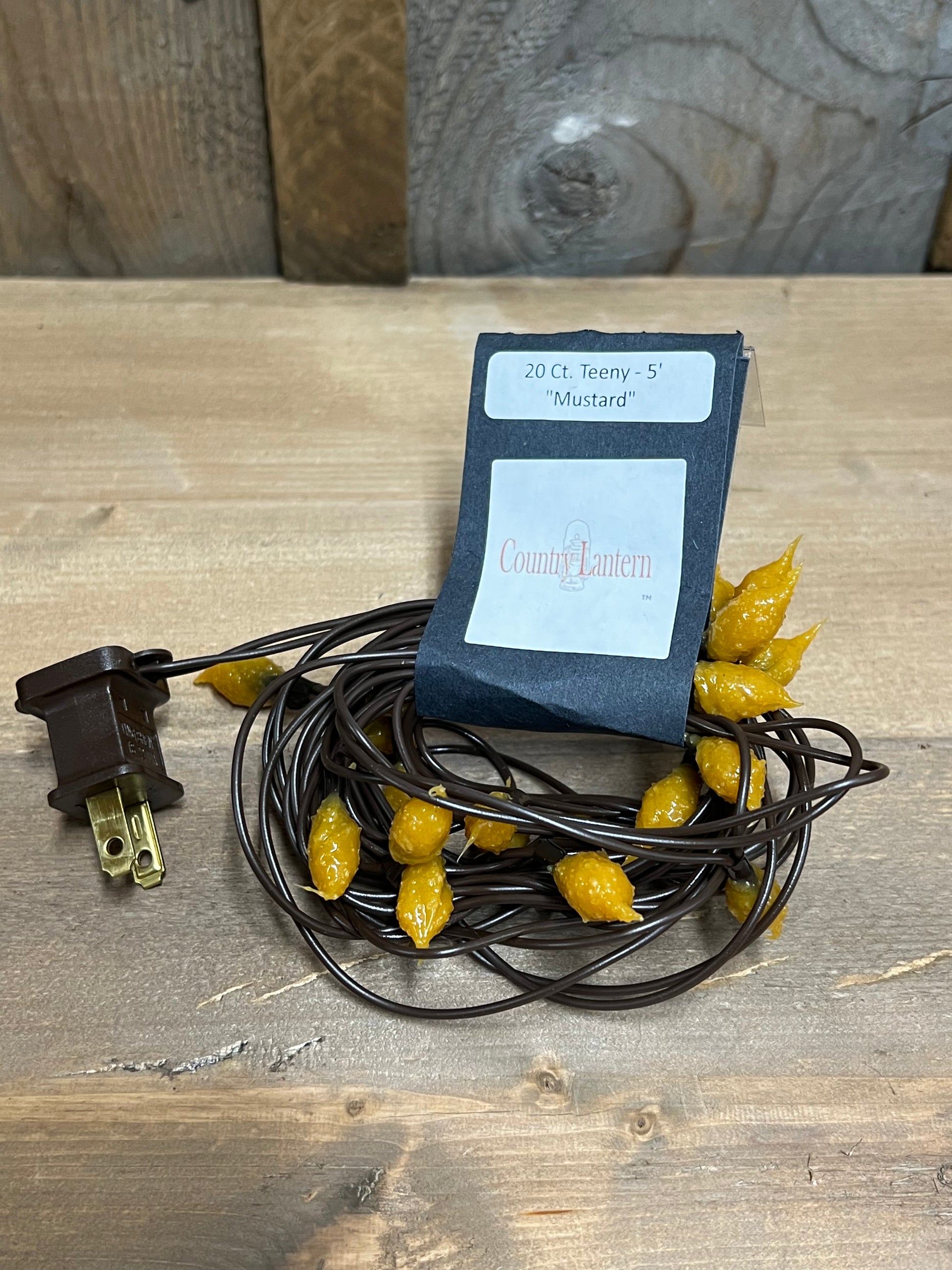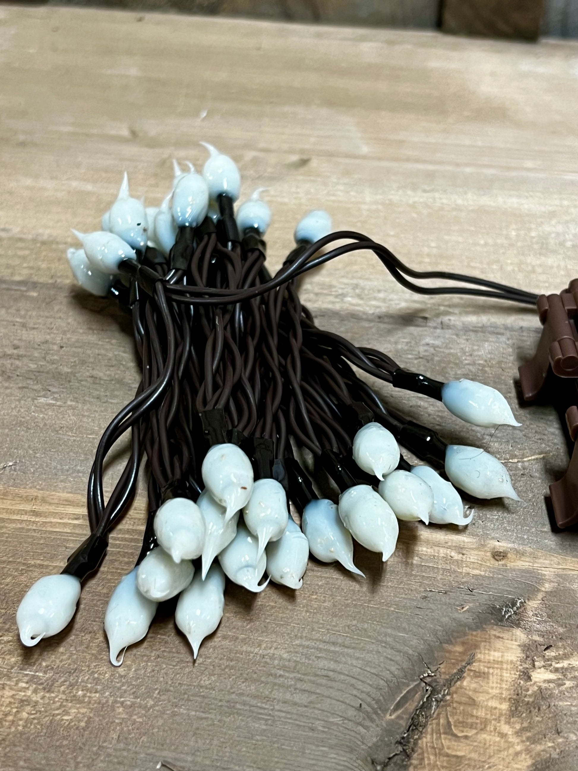 These battery operated string lights compliment any decor. Small batches of a silicone mixture is applied to each individual light bulb. (Photo of lit bulbs are the 20 strand bulbs but they will be the same color). These Battery Operated LED string lights have an automatic timer for 6 hours on and 18 hours off and have 8 Multi-functions options (Combination, In Wave, Sequential, Slo Glo, Chasing/Flash, Slow Fade, Twinkle/Flash, Steady On). These strands use 3 AA batteries (not included). With a Brown cord and 7' in length this Battery Operated light strand is perfect for a hanging wreath or table centerpiece. For Indoor use only.