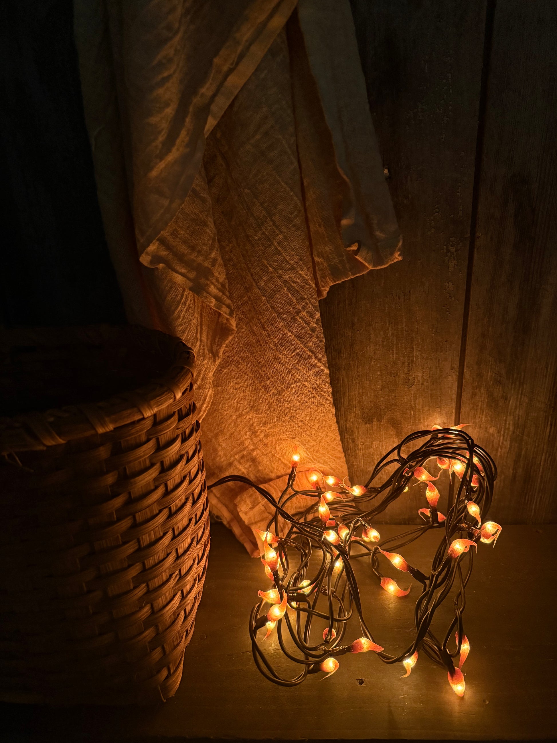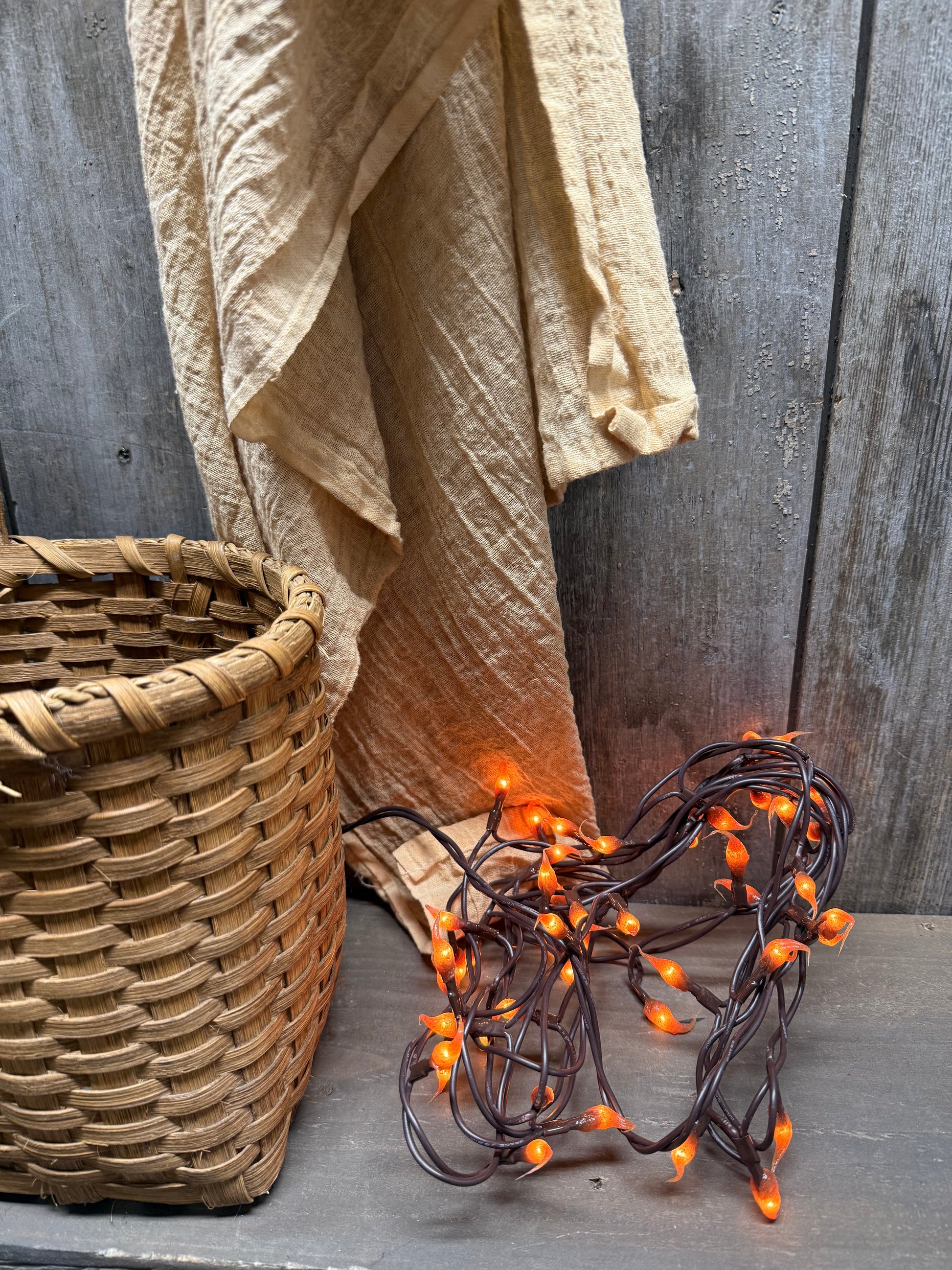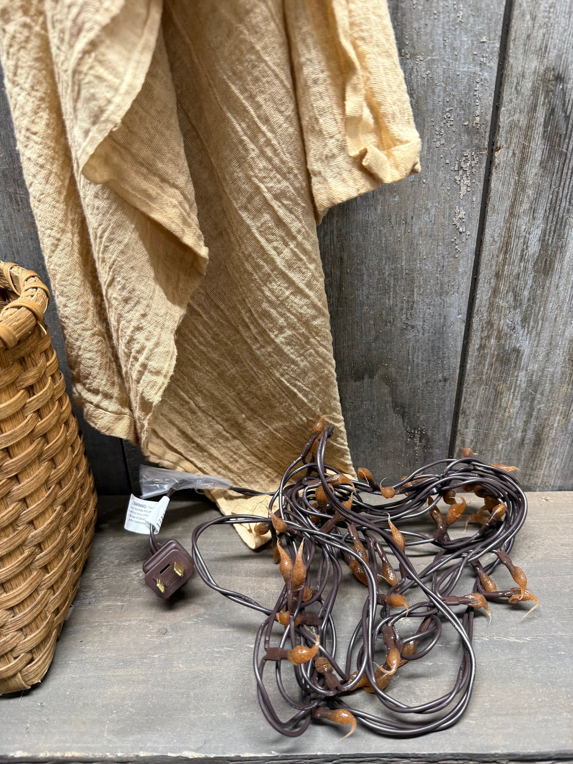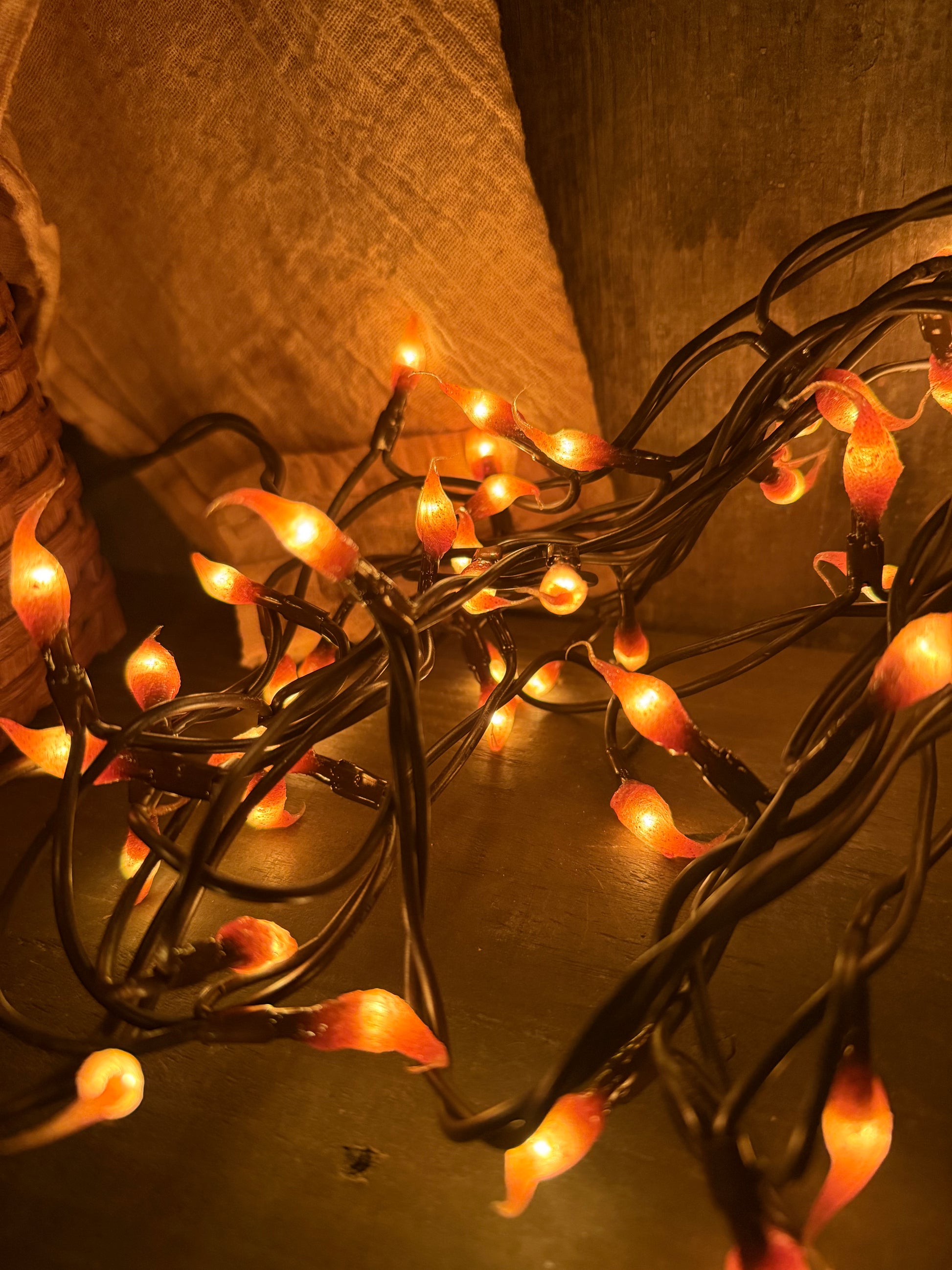 Hand dipped silicone tips on Teeny bulbs and a brown cord. Indoor only. Lovely primitive warm look.