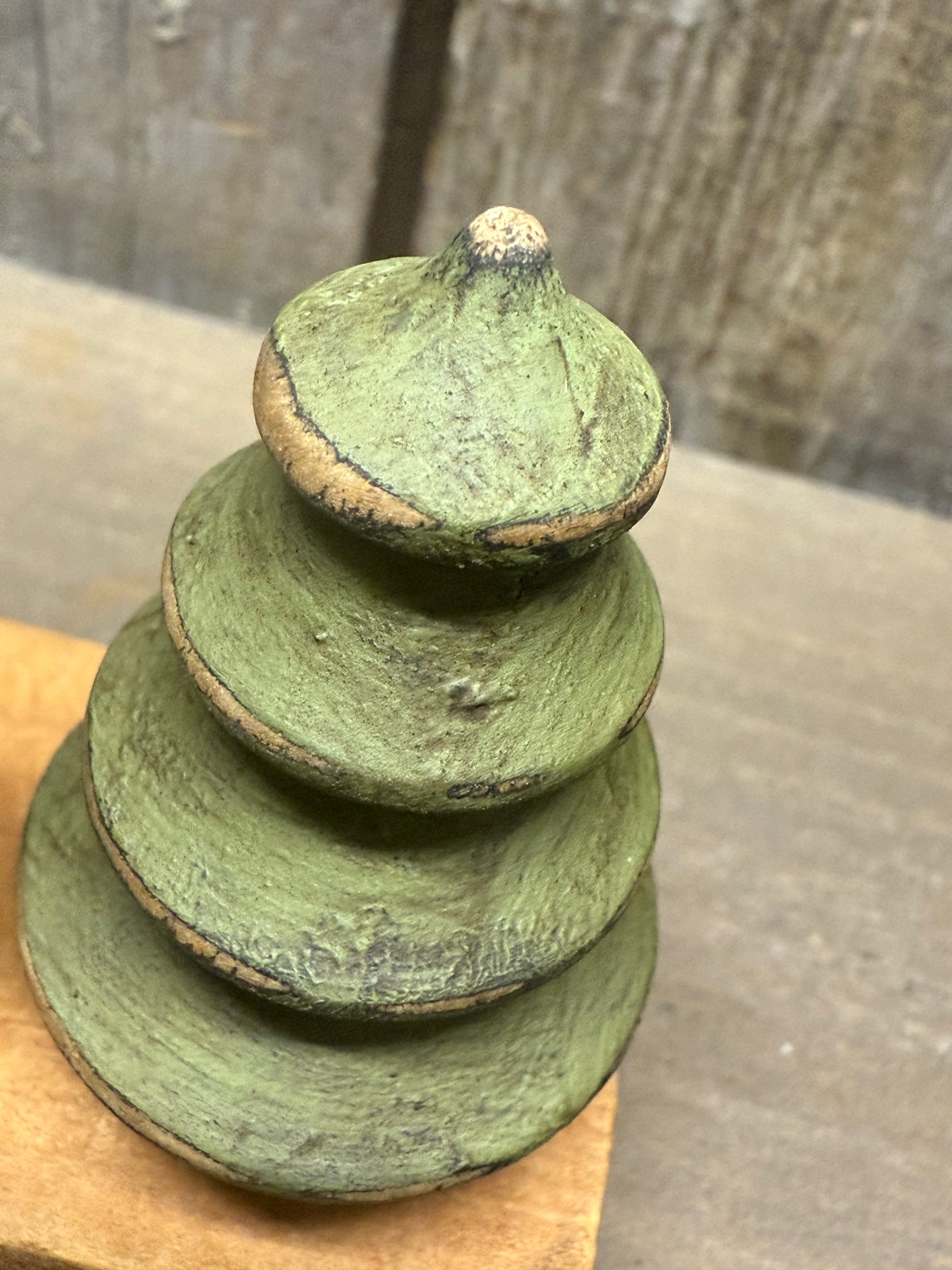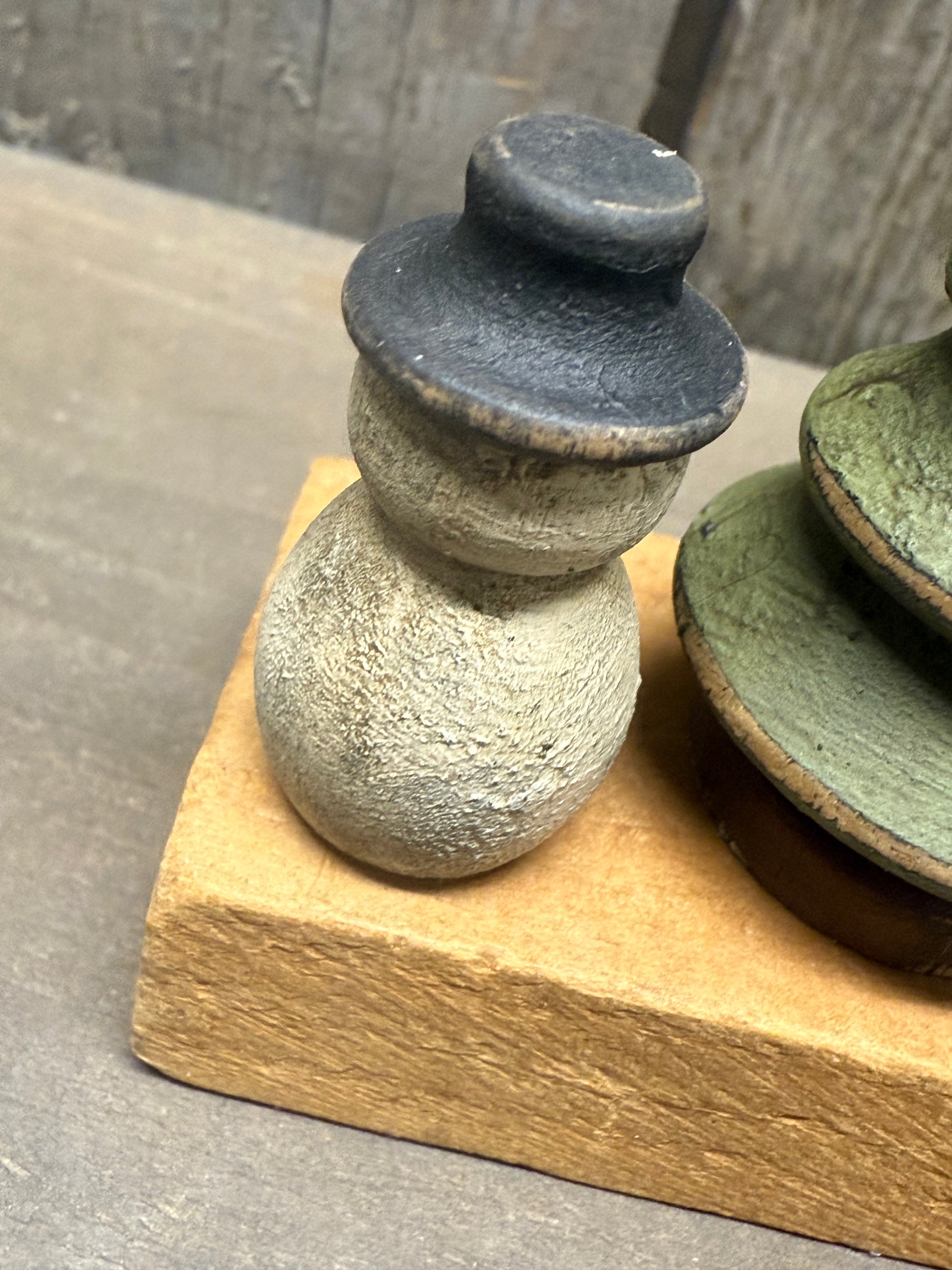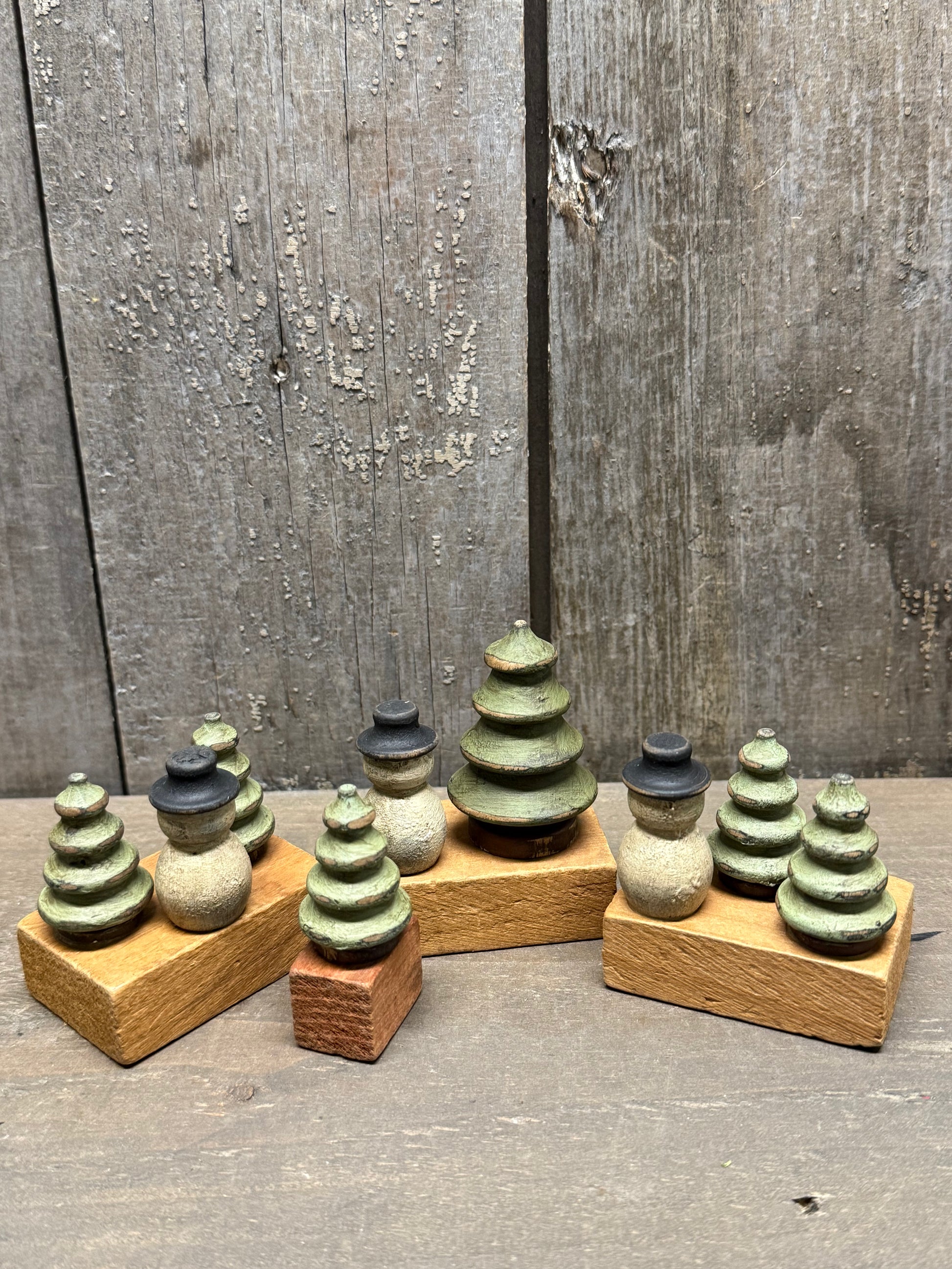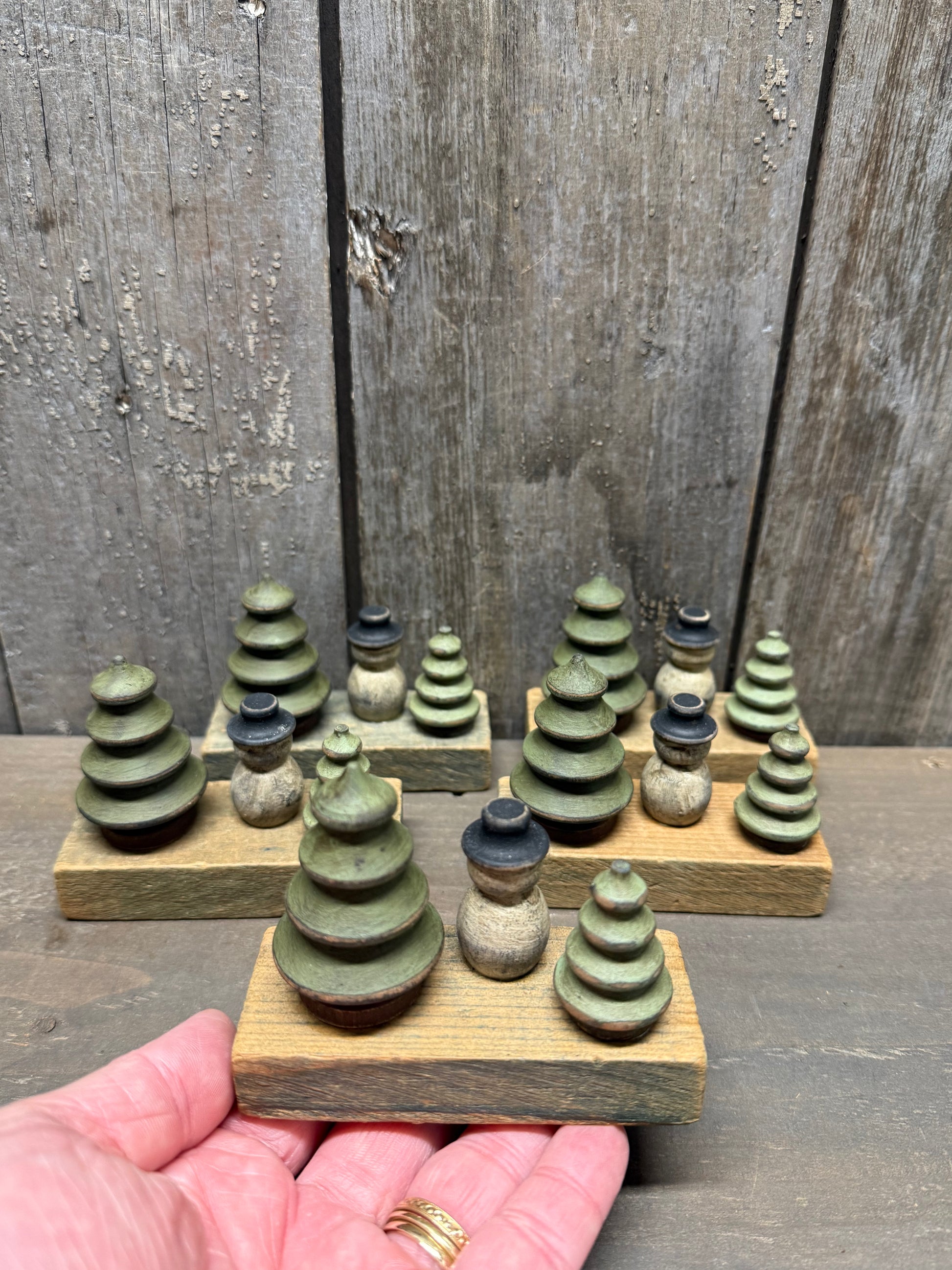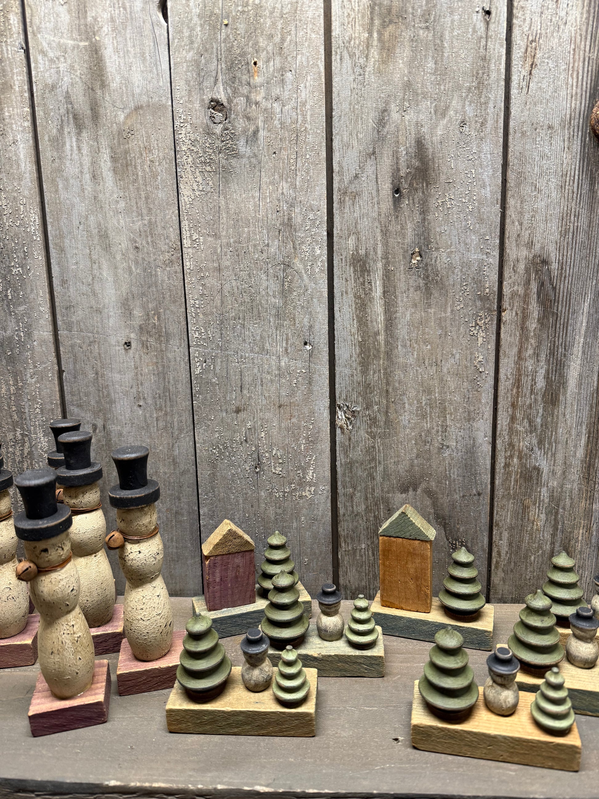 Made from wood turnings crafted in Maine and vintage toy blocks, we love our "little" figurines. We painted the snowmen and trees in a textured paint and top coat, we then sanded, stained and left them "faceless" to give them a simple primitive look.