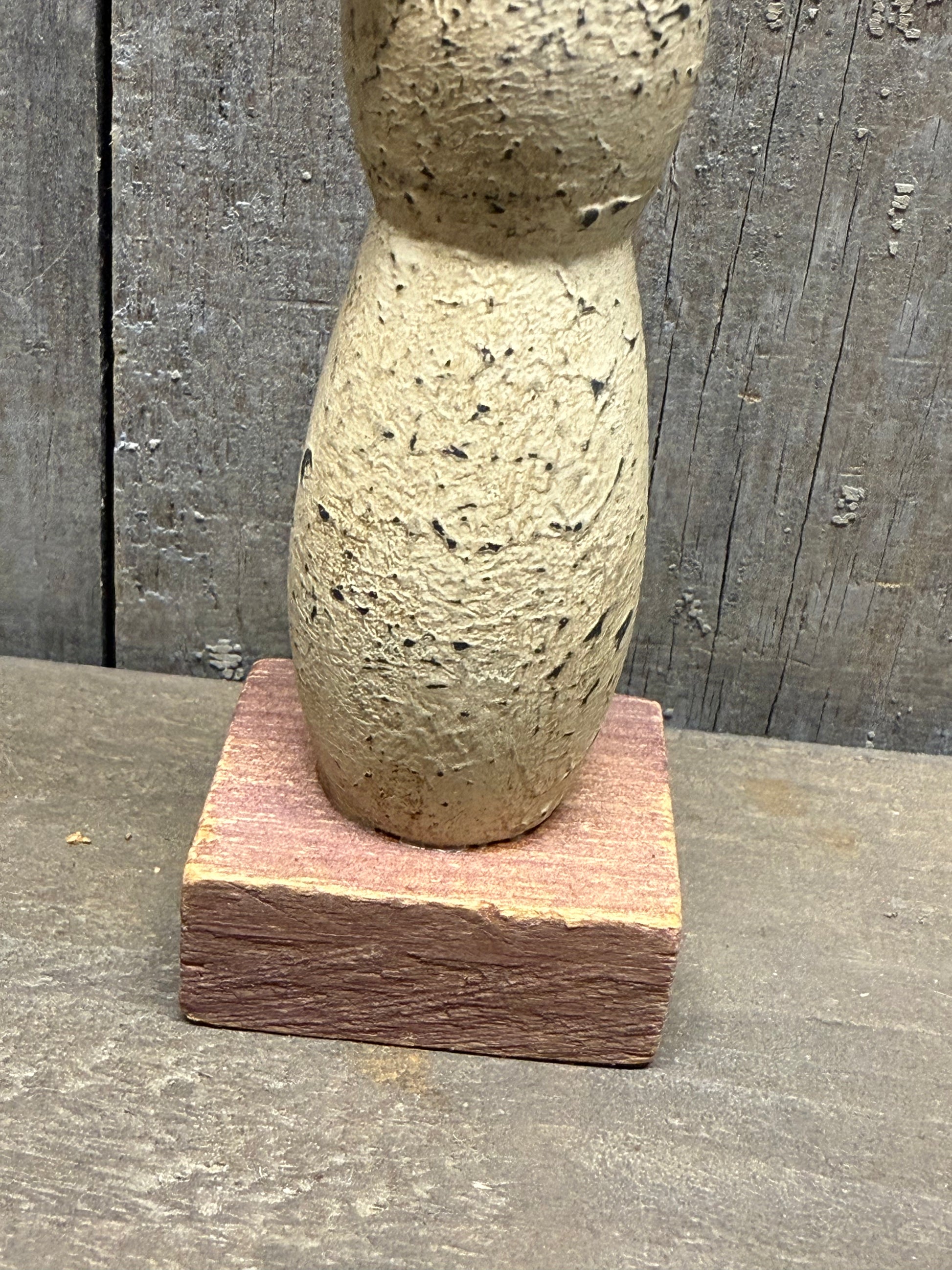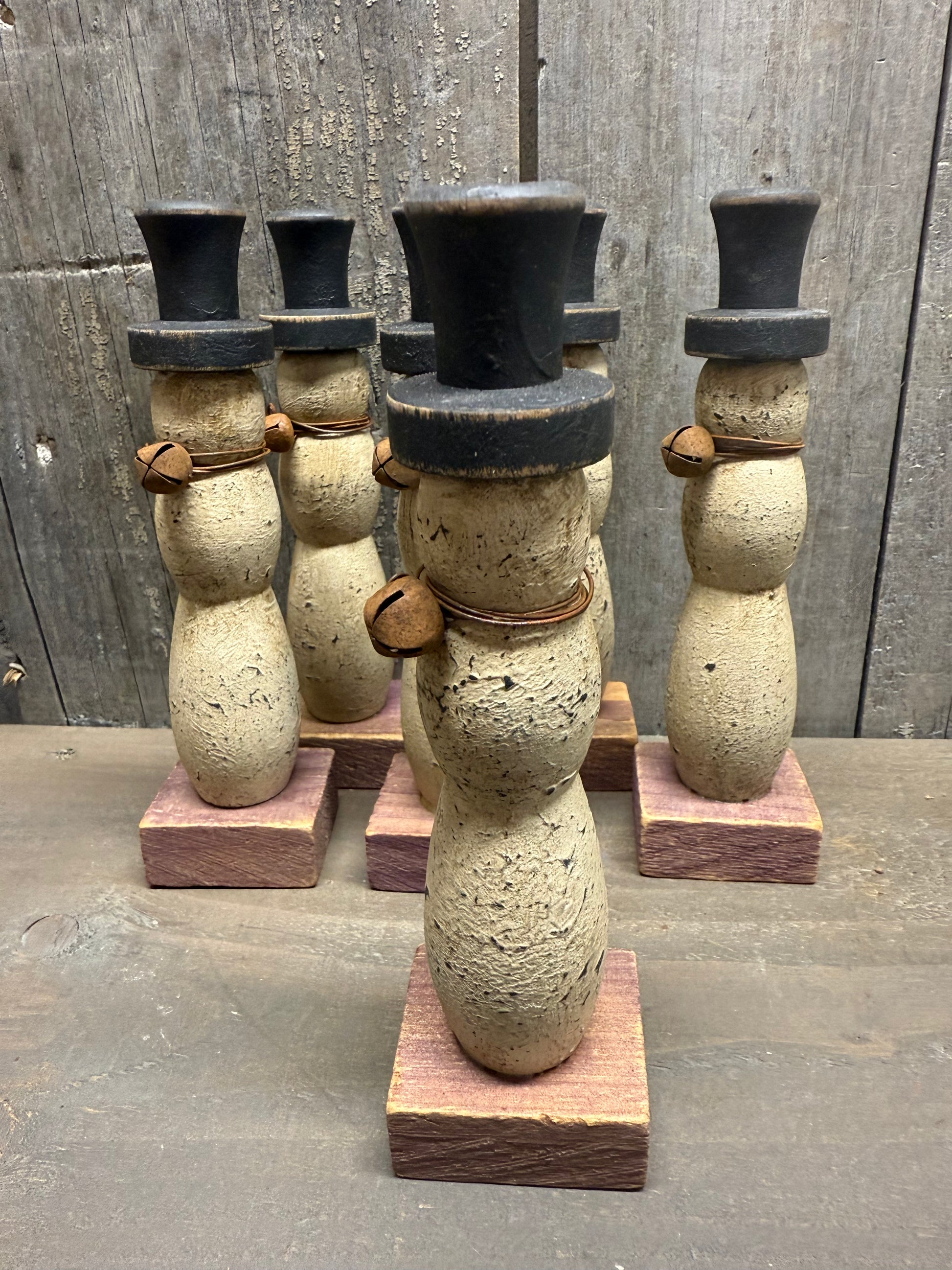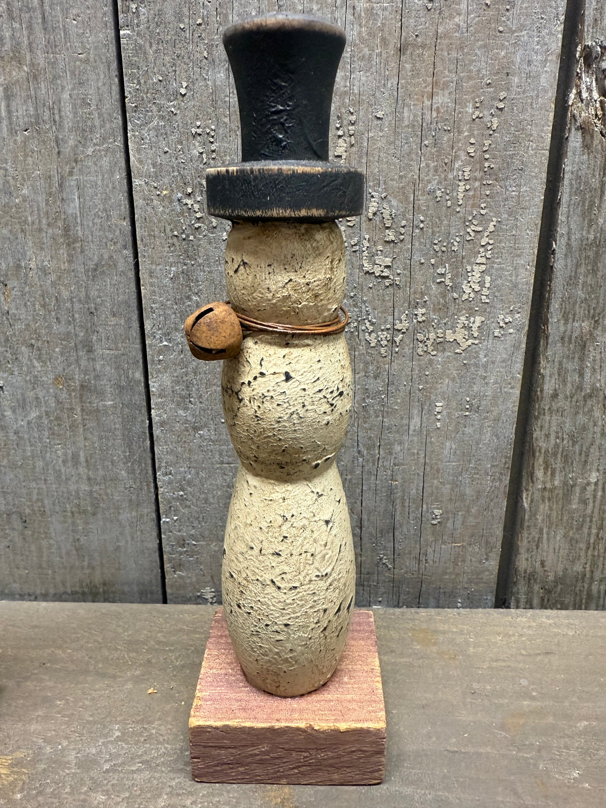 SLIM...snowman on toy block, 6.5" tall. Blocks have been played with and some of the paint may be worn and faded. He has a rusty wire scarf and a tiny bell. Just like we like them! Block measures 1.75"x 1.5"