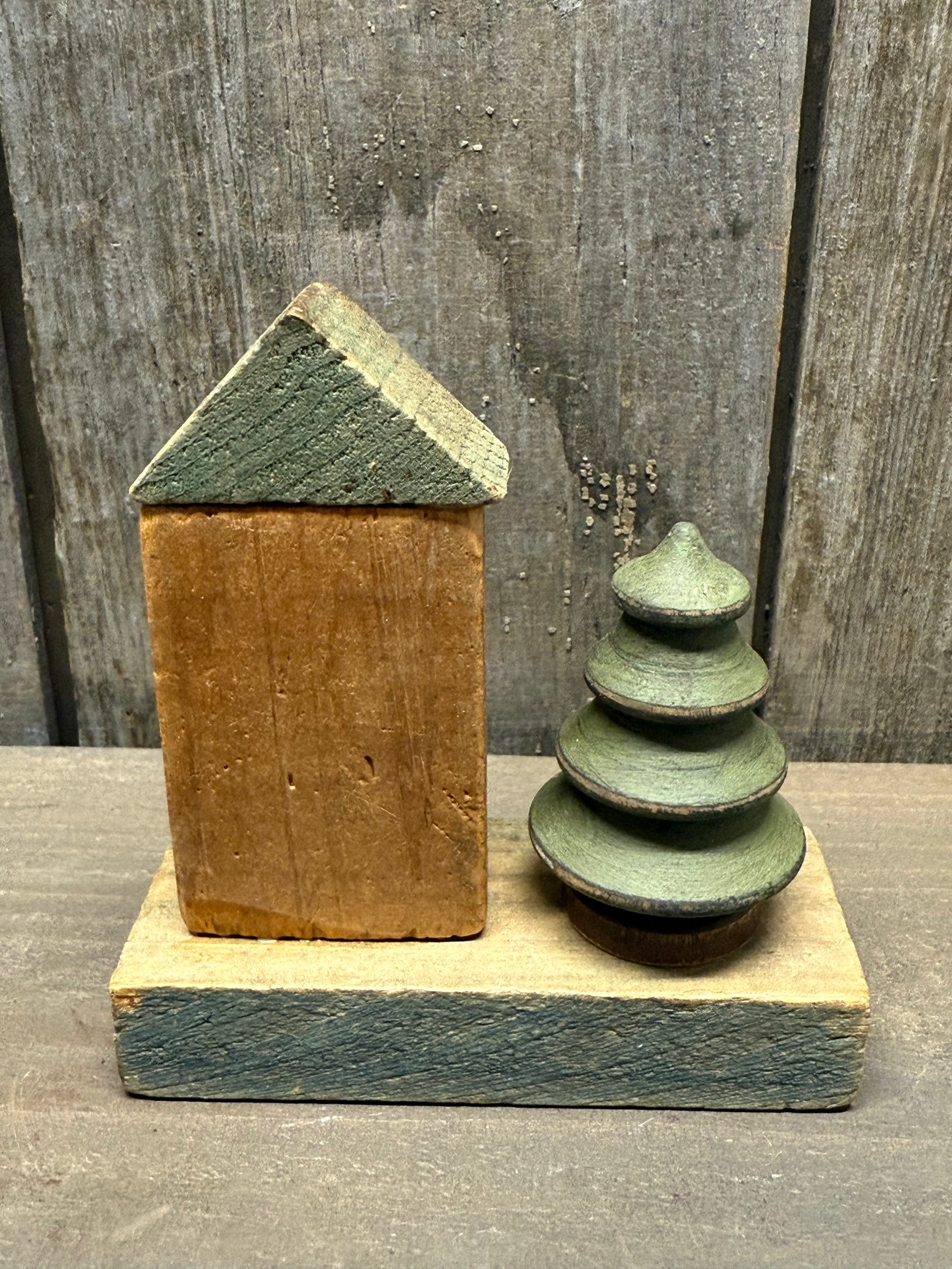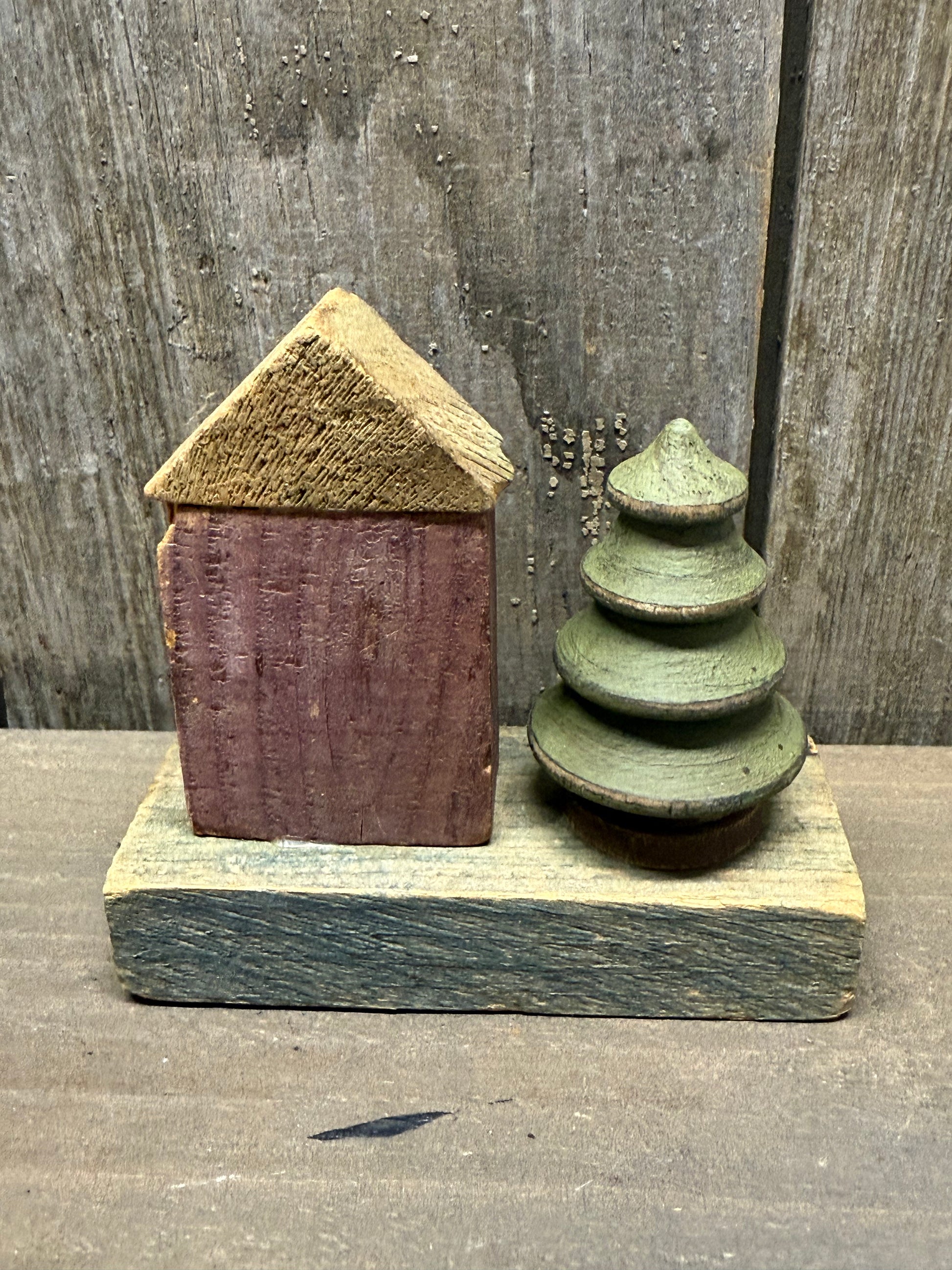 BROWN HOUSE...made from pieces of a toy block set, we added one of our hand painted trees to create a sweet little scene. Measures 4" tall overall x 3.5" x 1.5"