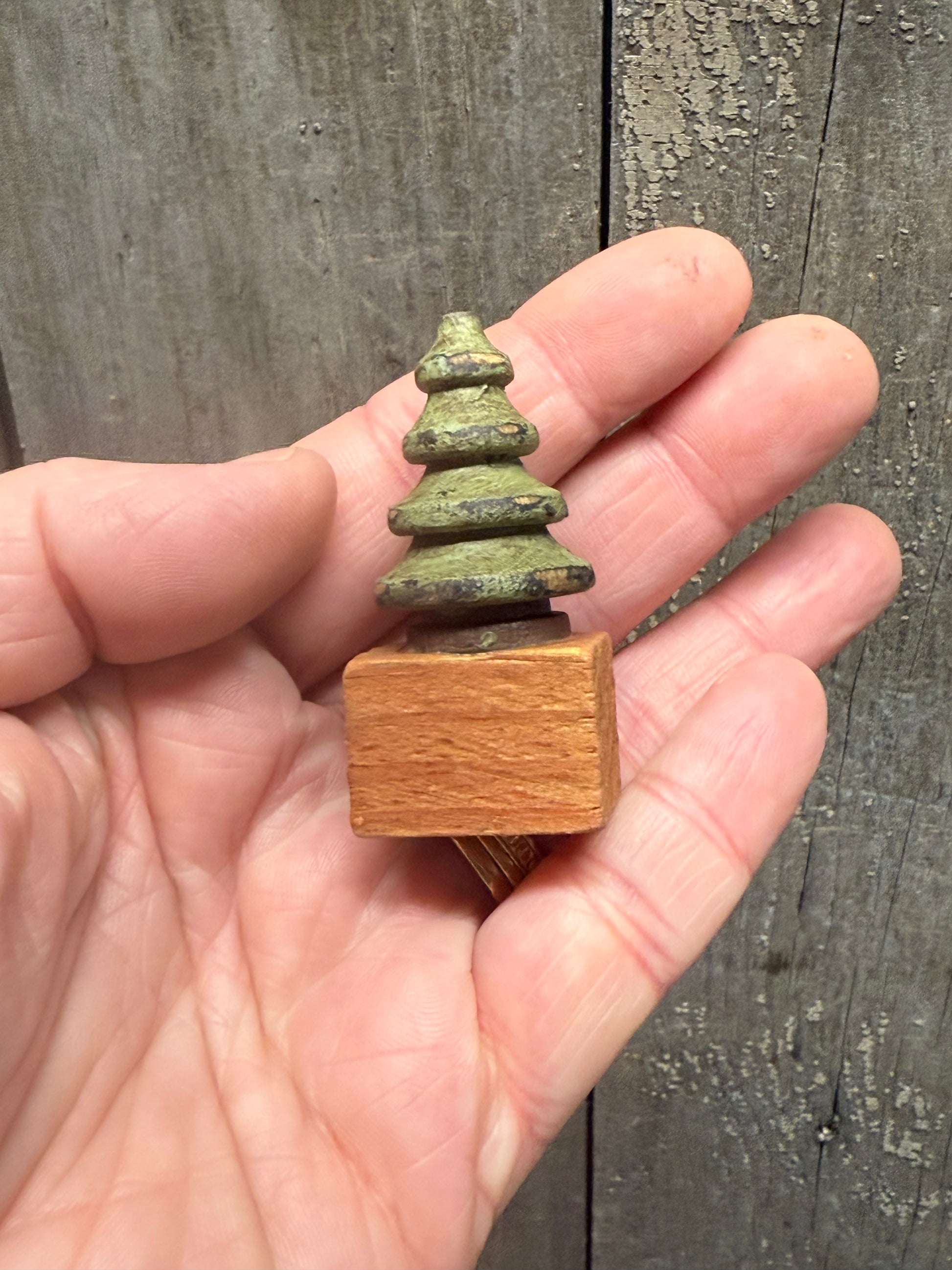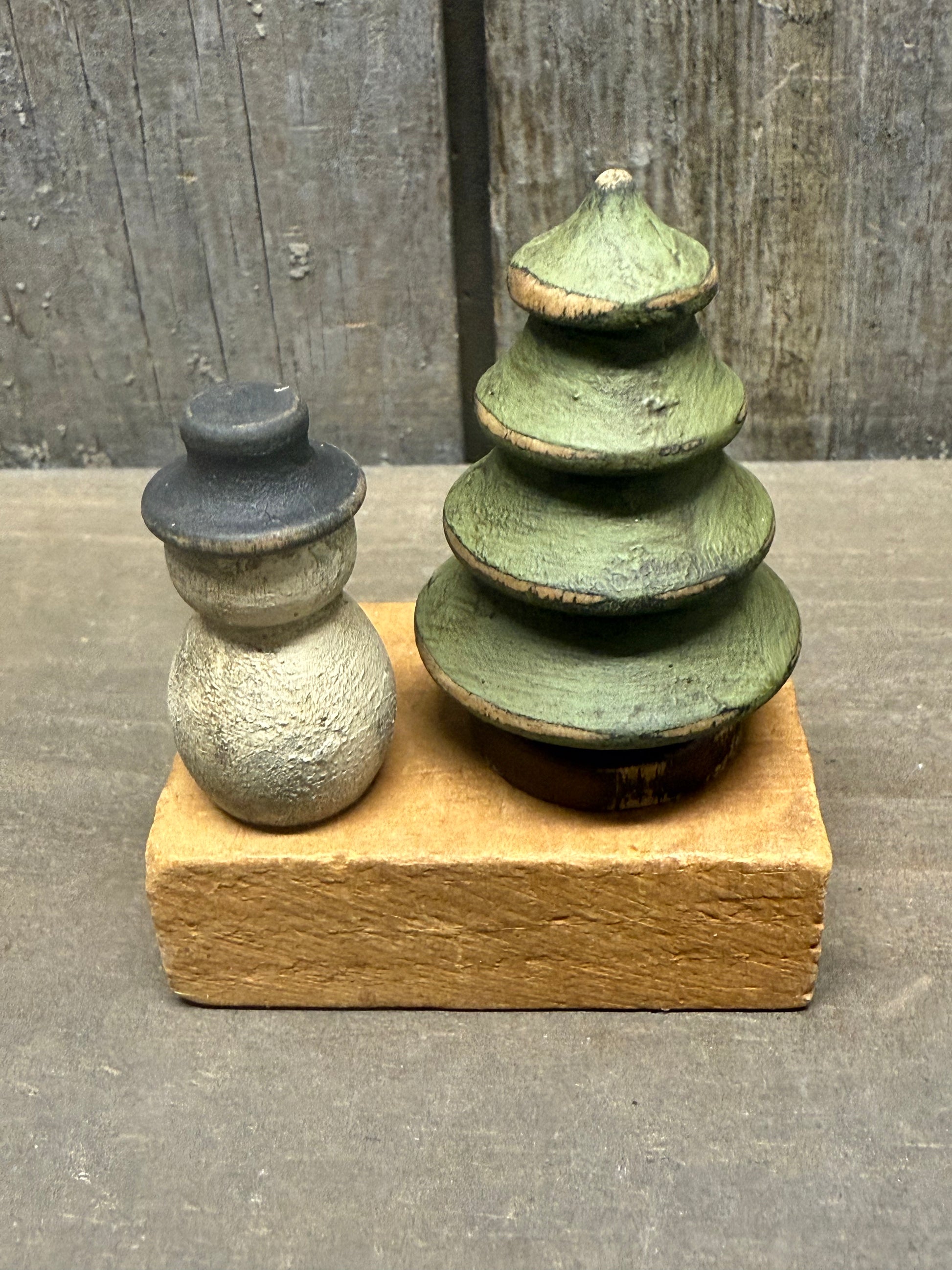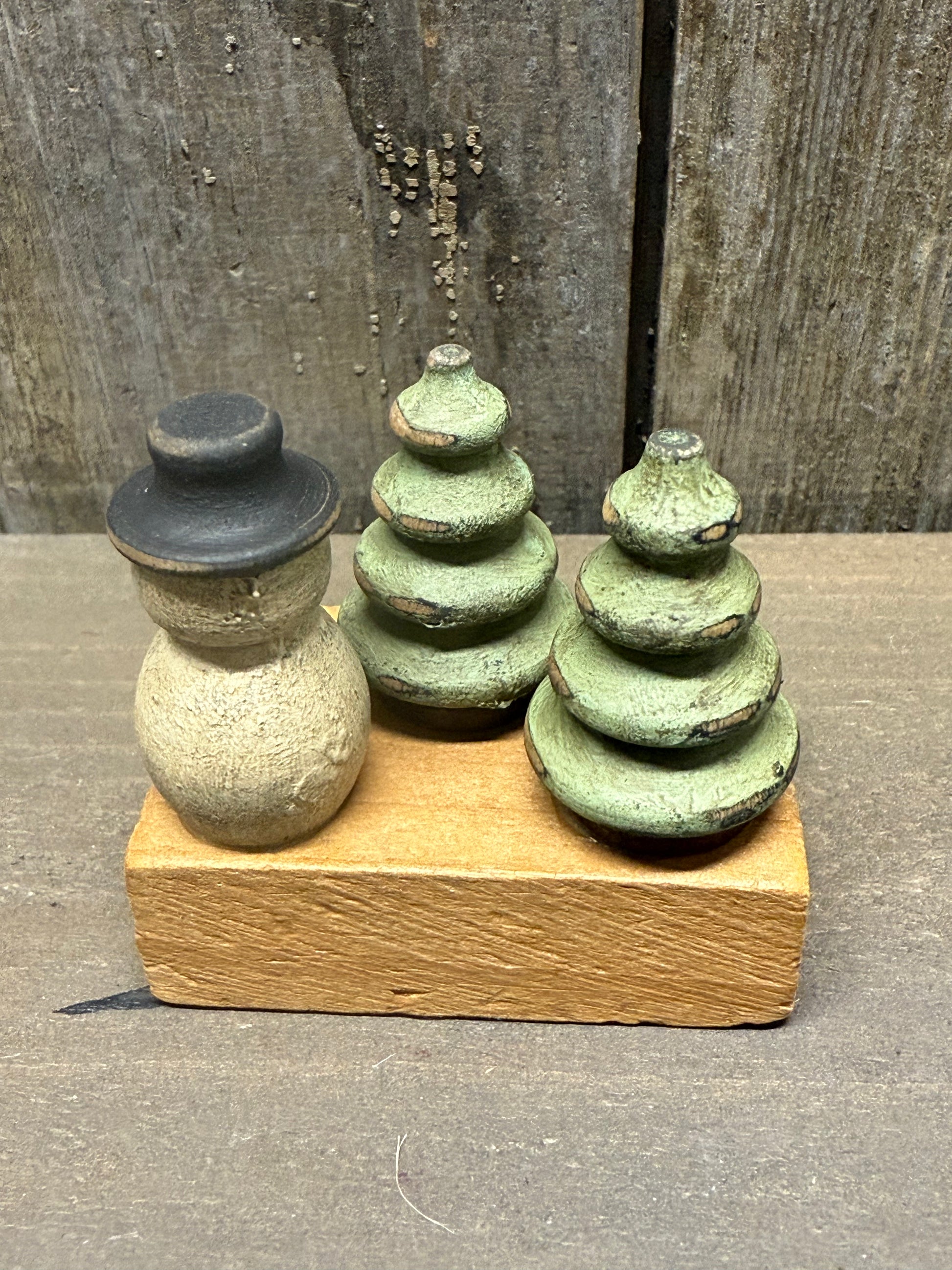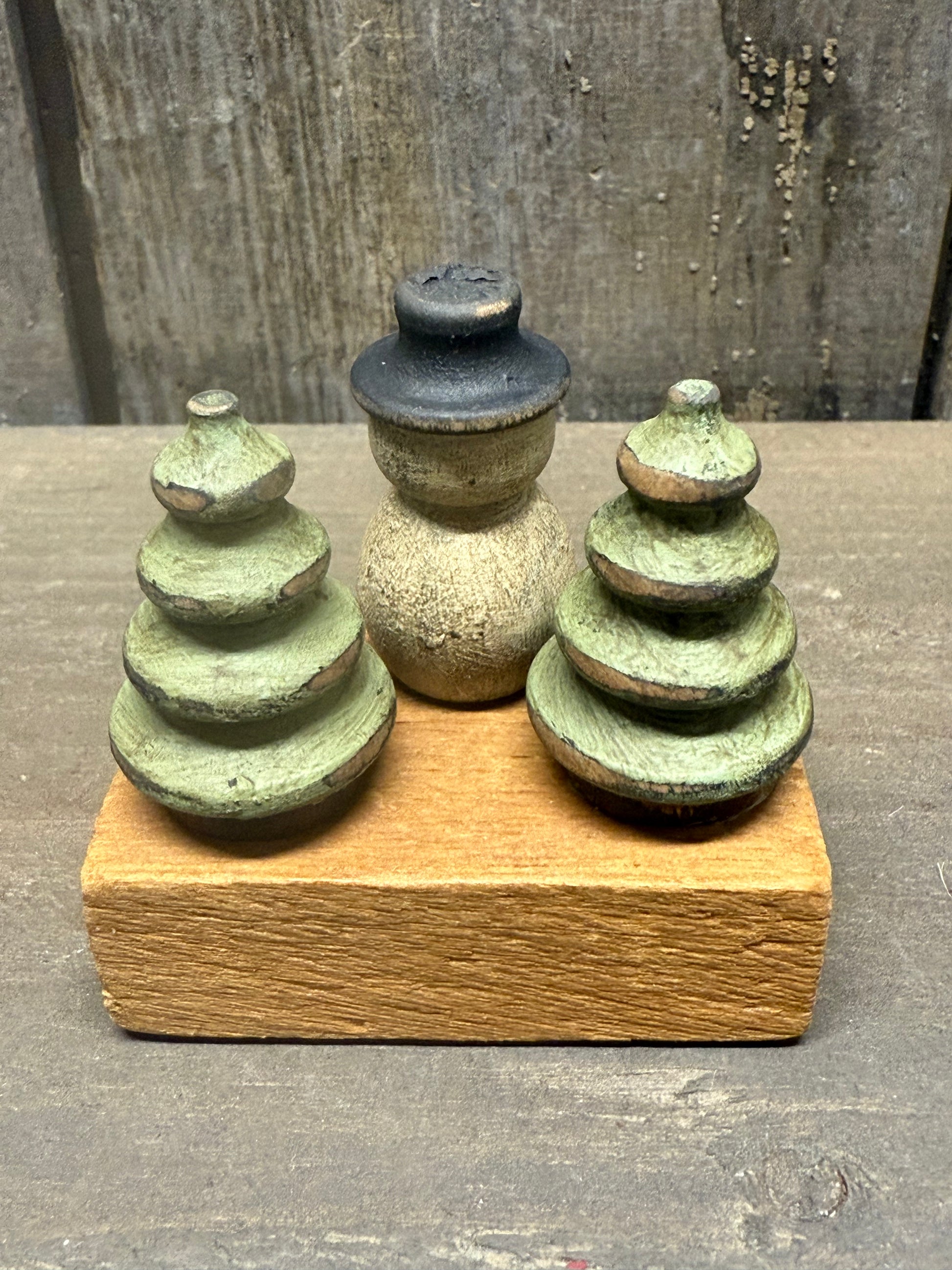 GLENN SIDE...1.5" tiny snowman poses to the side of 2 trees on a toy block. Blocks have been played with and some of the paint may be worn and faded. Block measures 2.25" tall overall x 2.25"x 1.5". You can display these pieces from either side.
