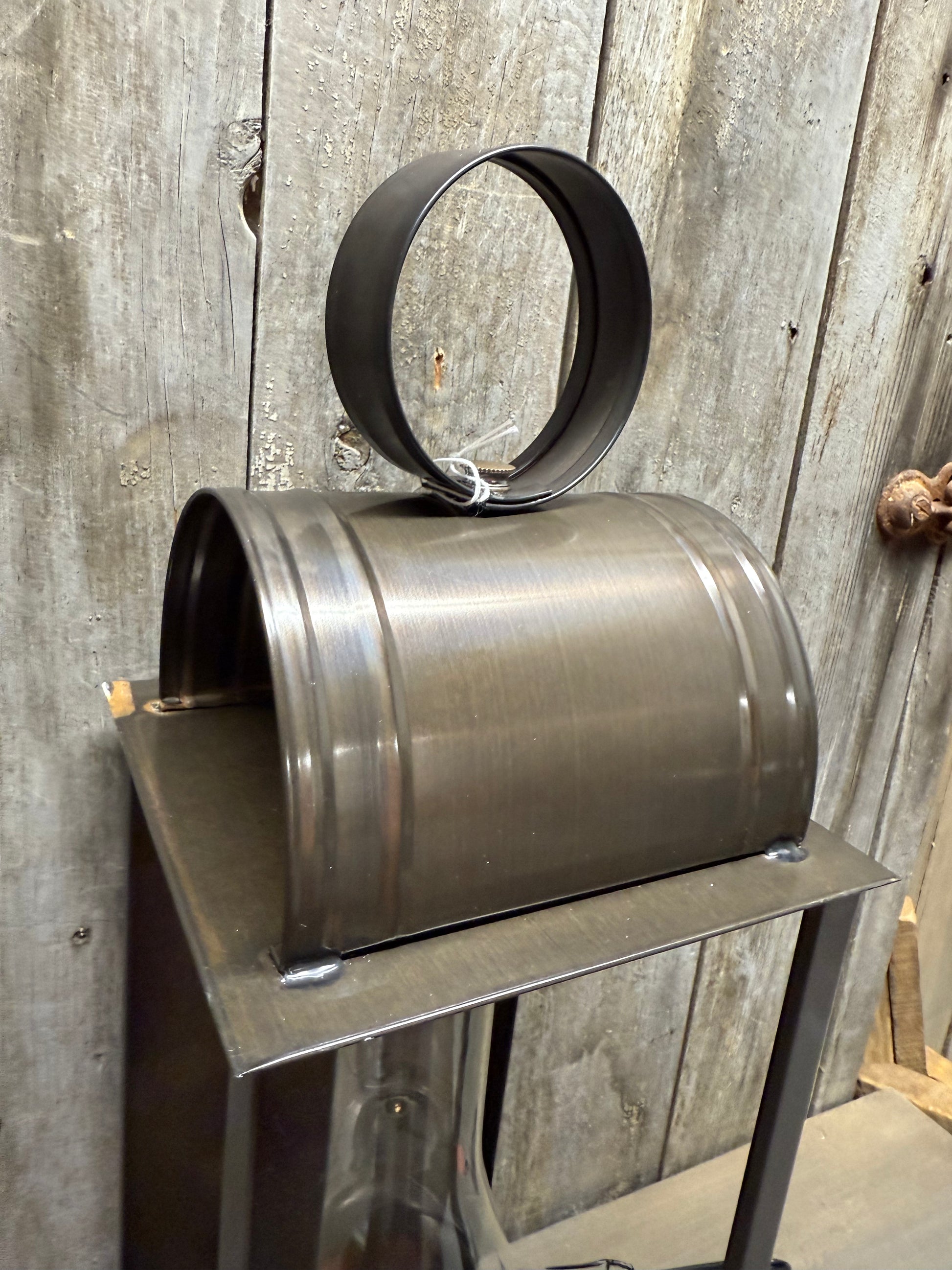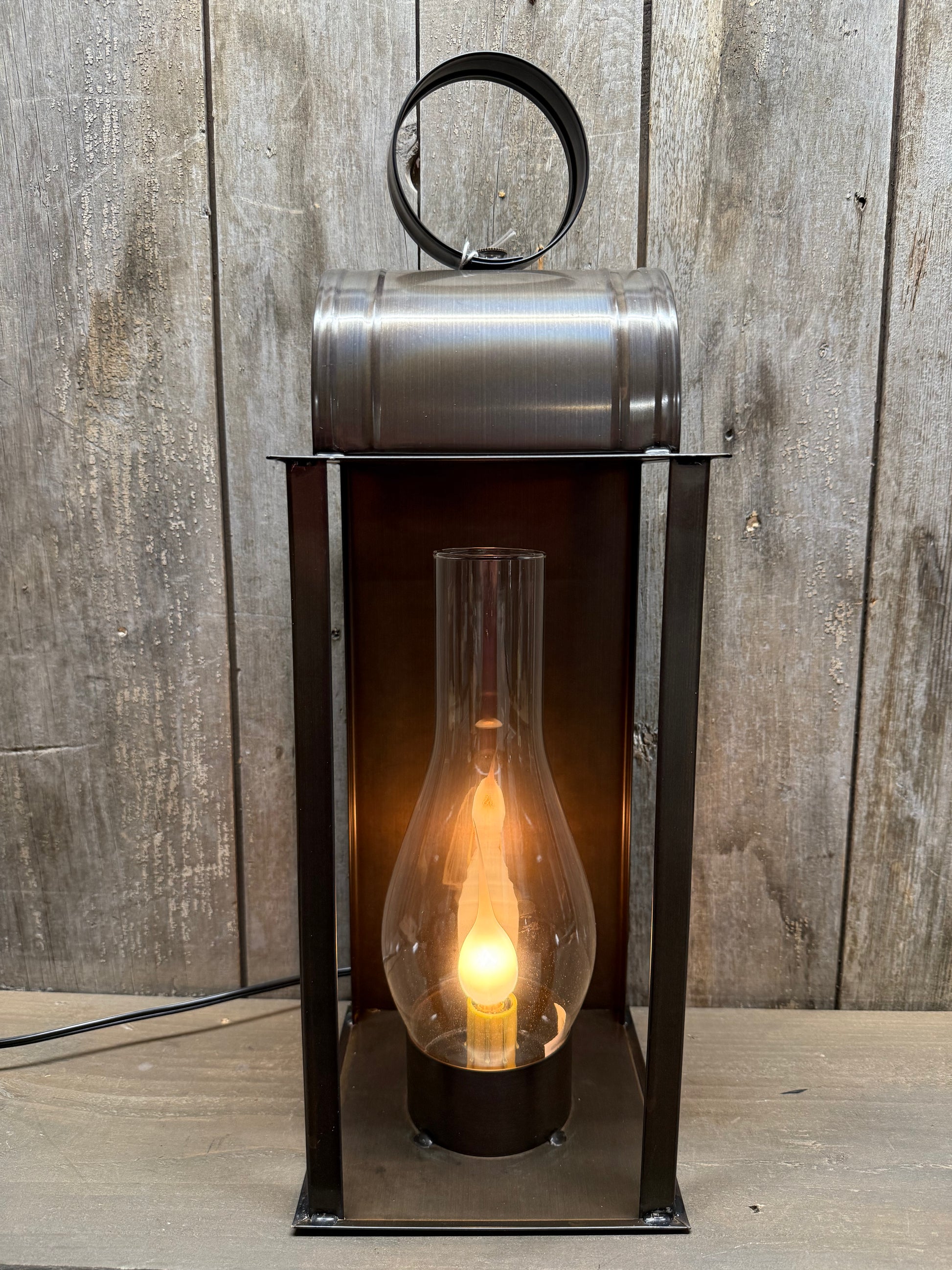 A lantern reminiscent of those used in early America that has been made electric and includes a 10-inch glass chimney. The Mantle Light is 18.25"x 6.25" square and has a beautiful Kettle Black finish. It has an E12/Candelabra socket, 1 x 60 watts maximum wattage and wired with 7-ft cord and line switch; Plugs into a wall outlet. Made in the PA. Shown with a silicone bulb, not included.
